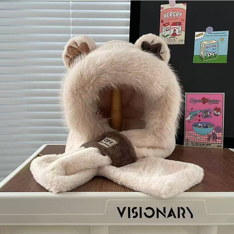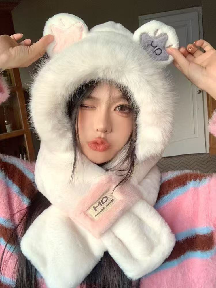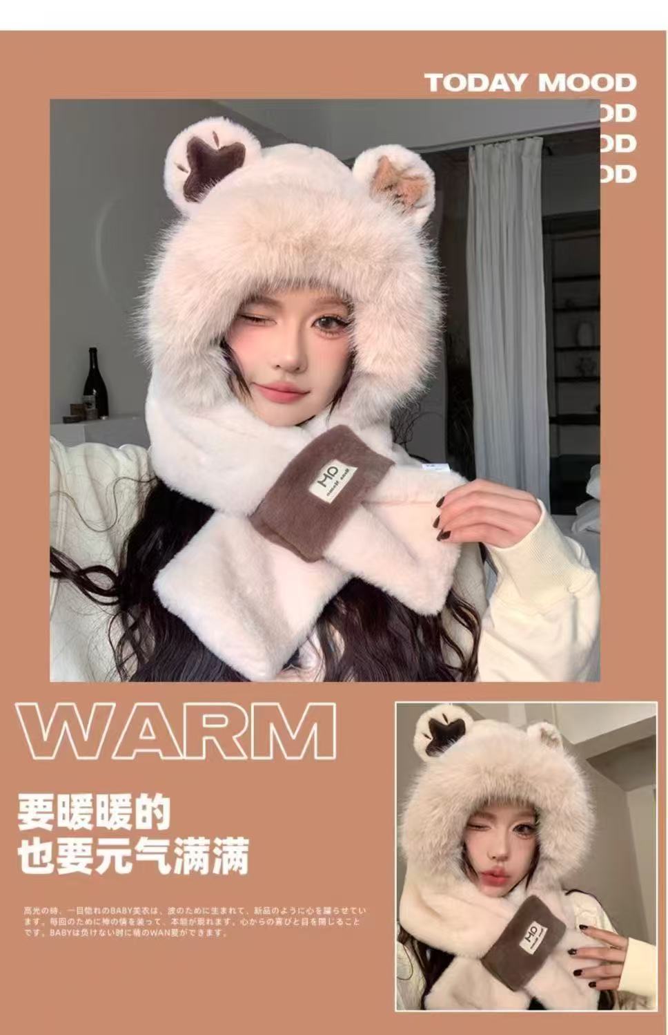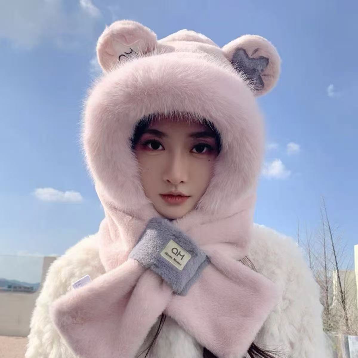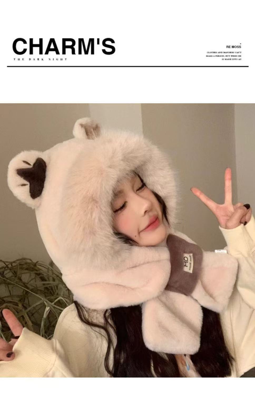 겨울 방한 귀여운 곰 모자와 스카프 여성용 투피스 세트 플러스 벨벳 두꺼운 따뜻한 플러시 모자 후드 스카프