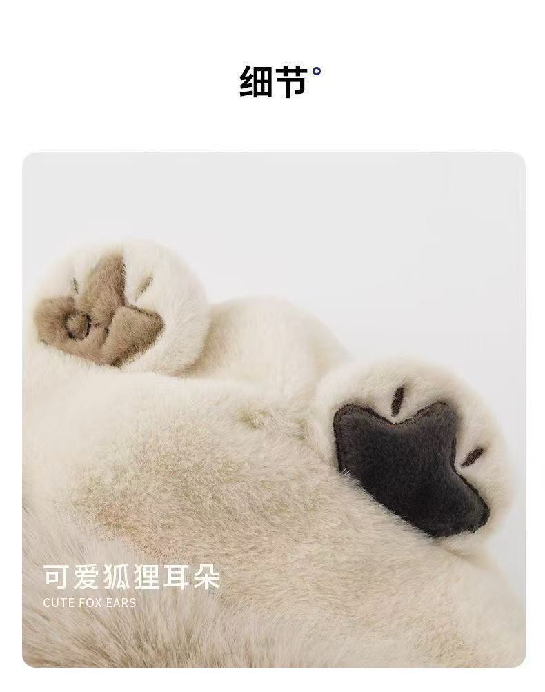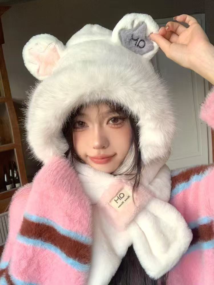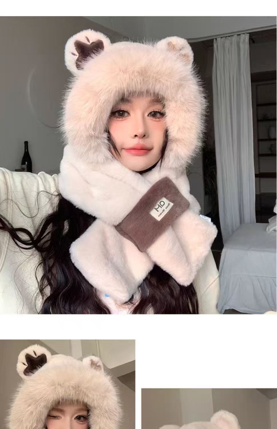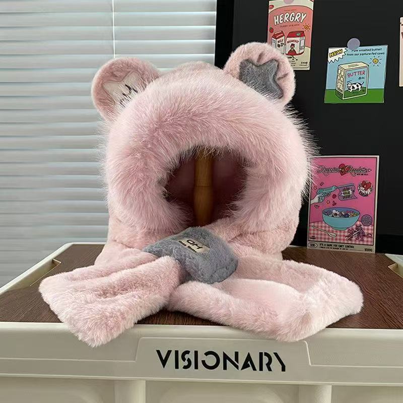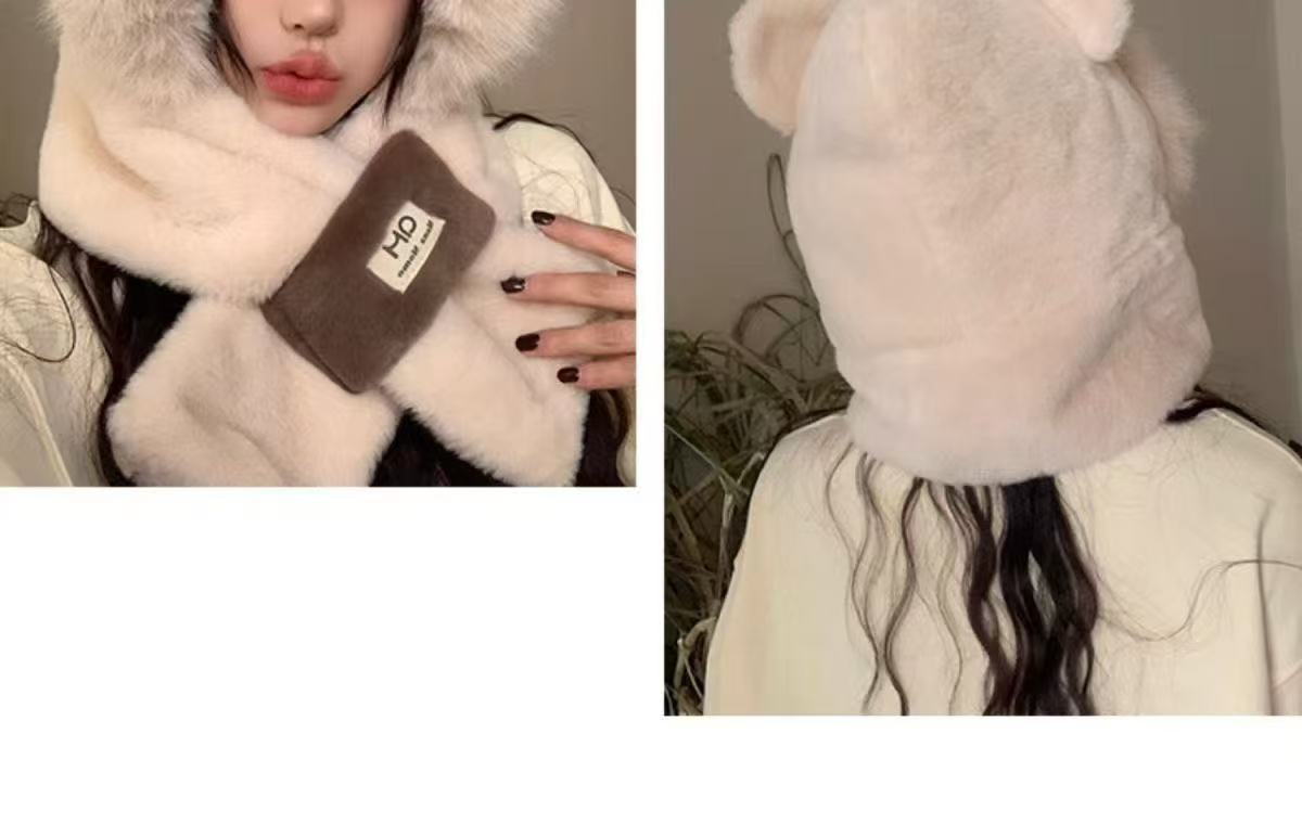 겨울 방한 귀여운 곰 모자와 스카프 여성용 투피스 세트 플러스 벨벳 두꺼운 따뜻한 플러시 모자 후드 스카프