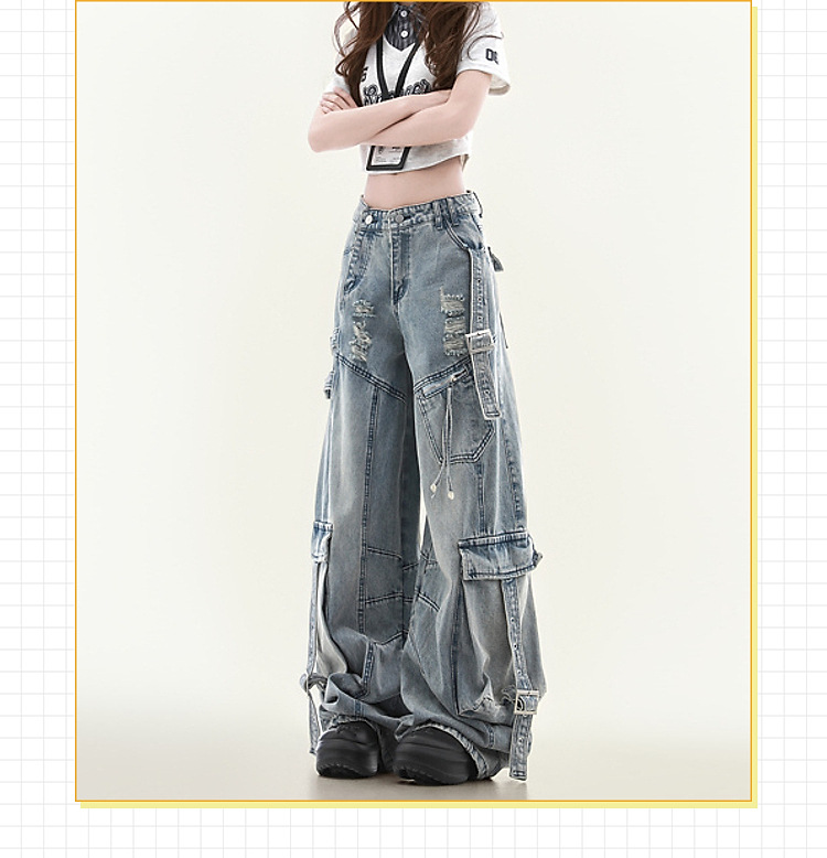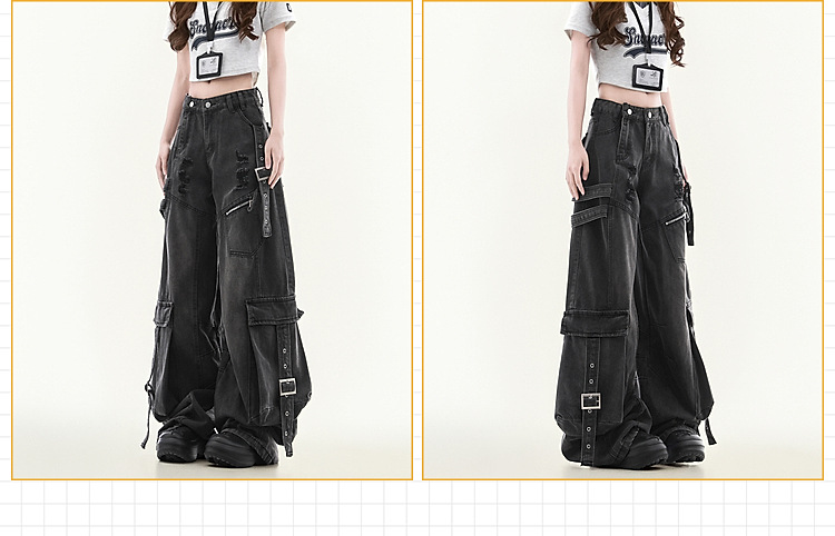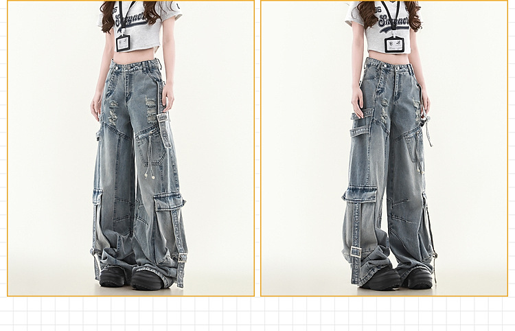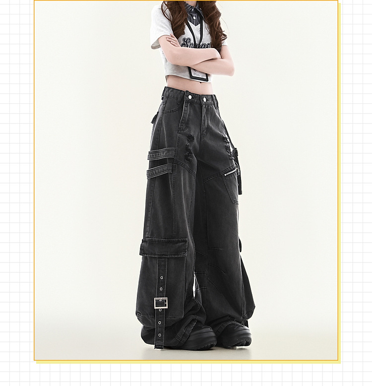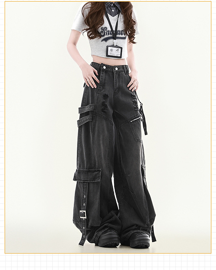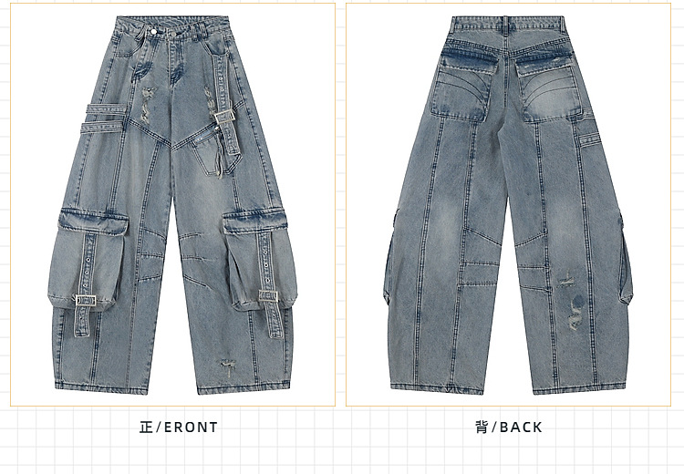 남녀공용 멀티포켓 워크진, 스트레이트 루즈, 와이드 레그, 아메리칸 하이스트리트 팬츠, 트렌디 브랜드, 핸섬한 찢어진 디자인