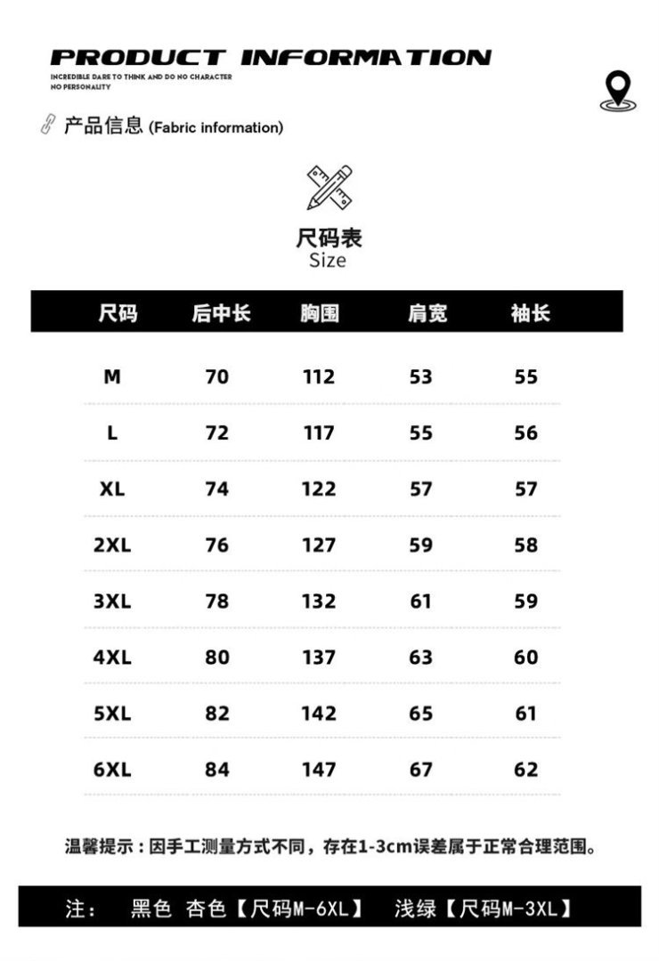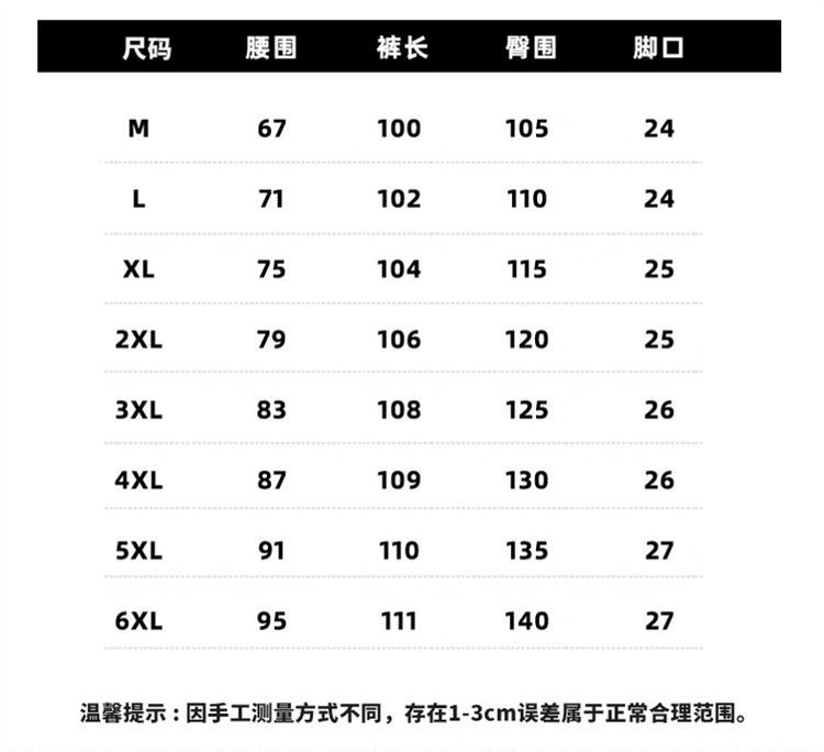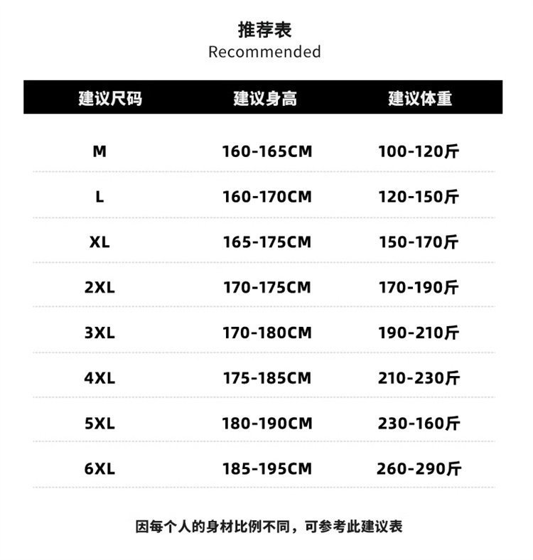 | 尺码 | M(建议100-120斤), L(建议120-150斤), XL(建议150-170斤), 2XL(建议170-190斤), 3XL(建议190-210斤), 4XL(建议210-230斤), 5XL(建议230-260斤), 6XL(建议260-290斤) | 是否跨境出口专供货源 | 否 |
