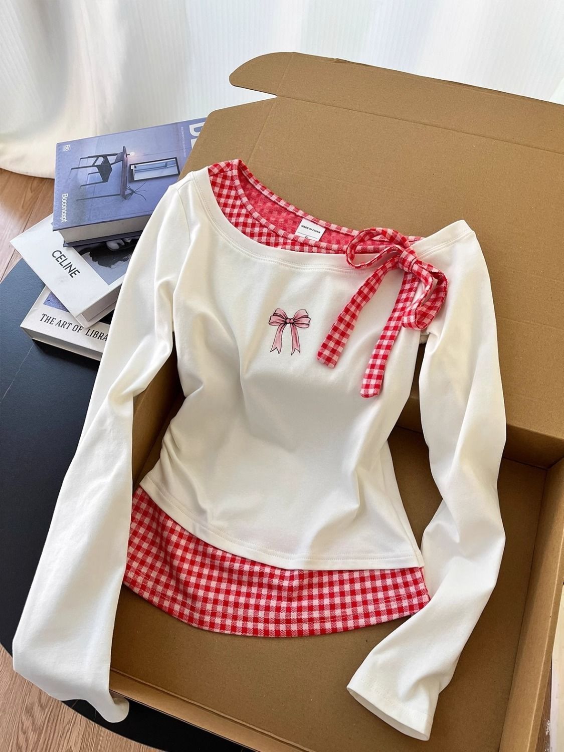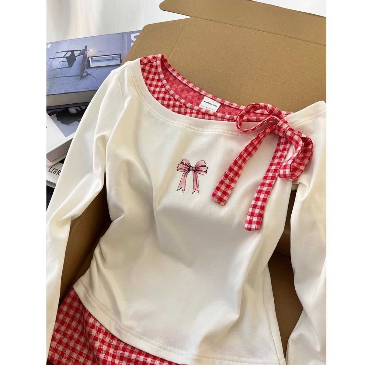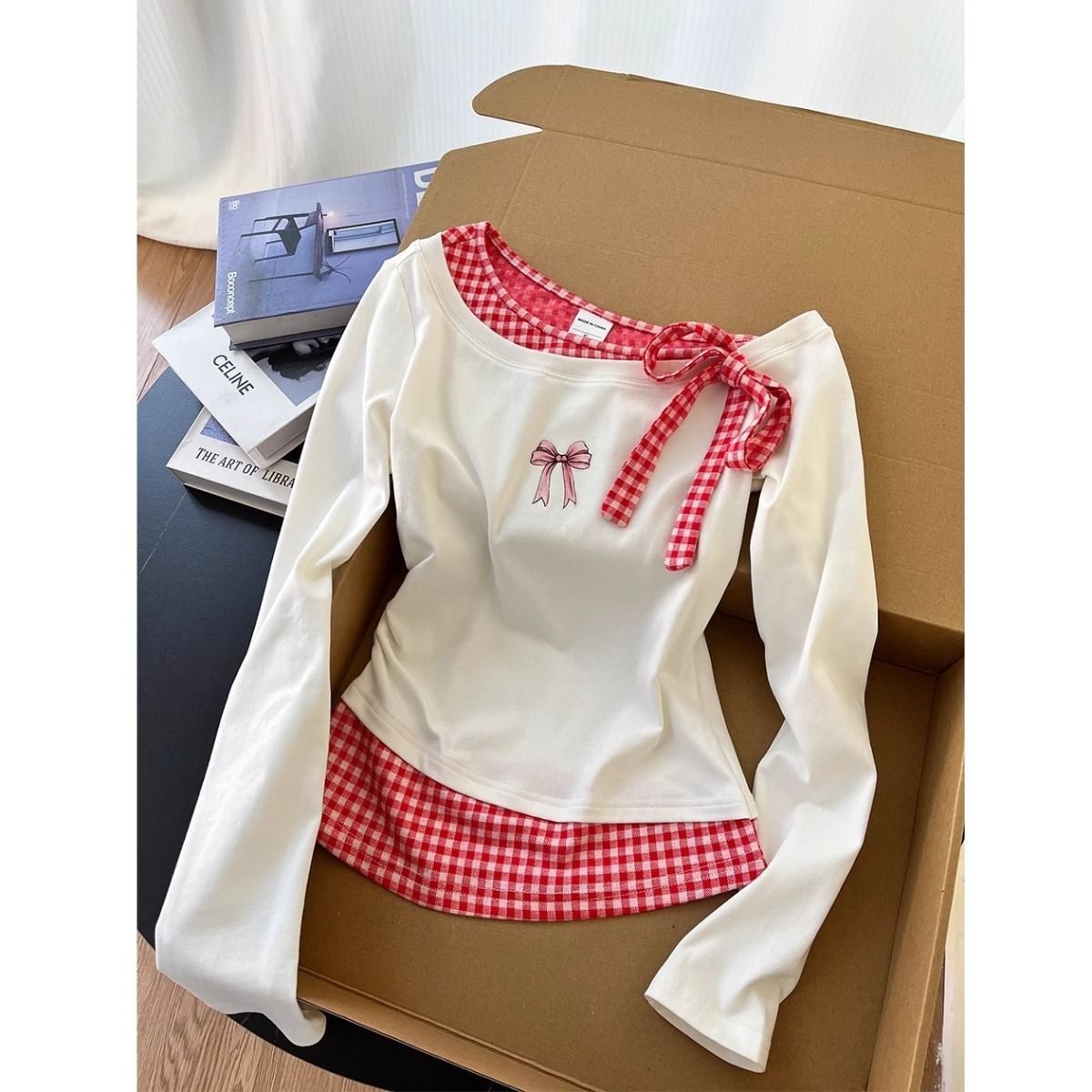 여성을 위한 컬러 블록 체크 무늬 가짜 투피스 긴팔 티셔츠, 초봄 새로운 한국 디자인, 매우 멋지고 독특하고 아름다운 상의
