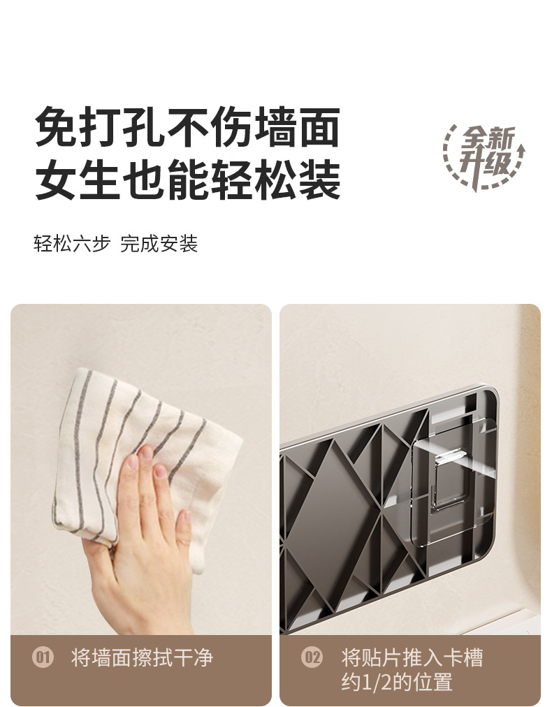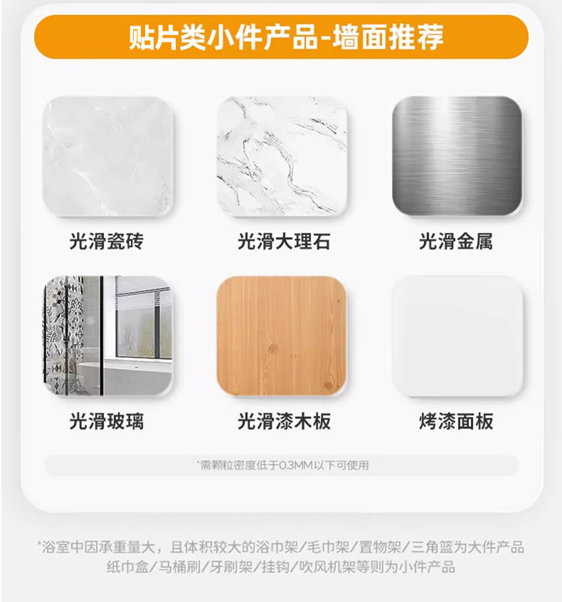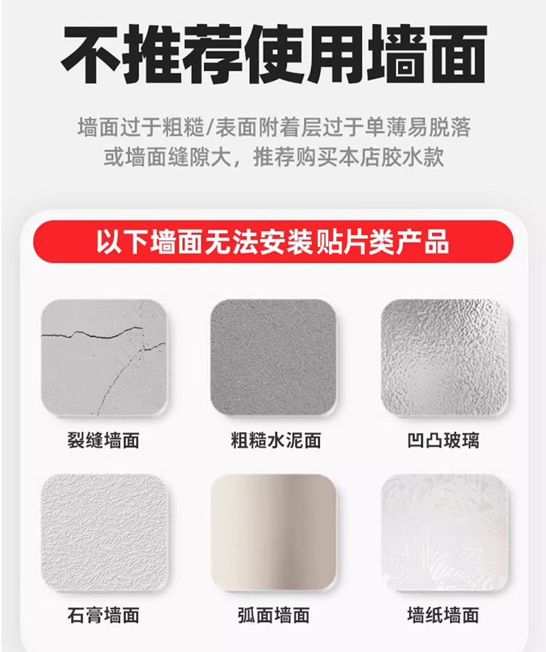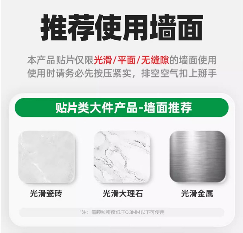 (2)安装请注意,墙面需平整坚固的玻璃瓷砖等。不可用在粉刷墙,墙纸,石灰墙等不平整不坚固的墙面上。上墙后,像手机贴膜一样,把贴片里的空气挤压出来就可以用了。