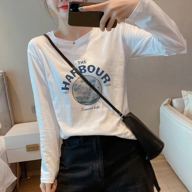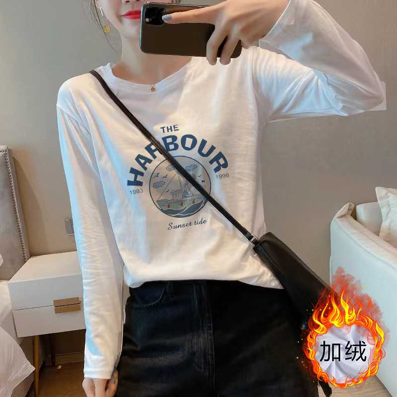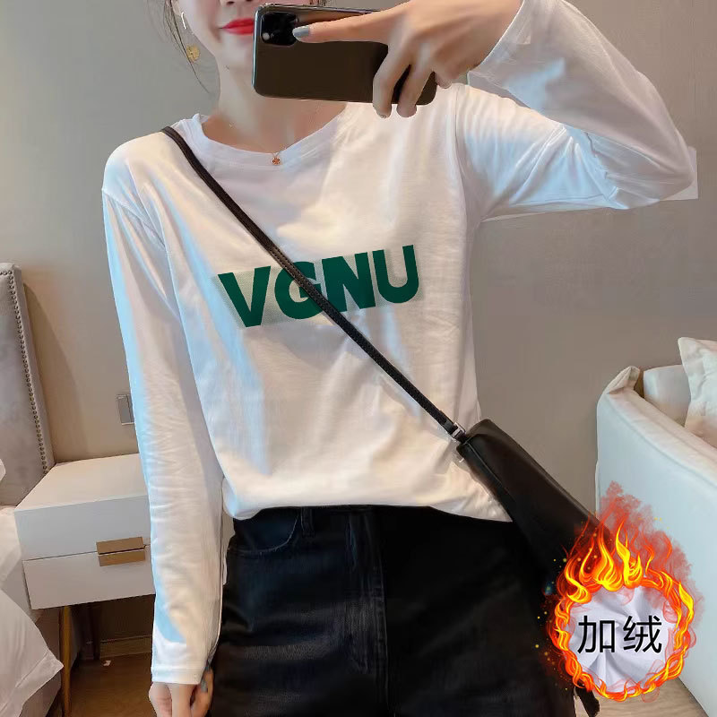 여성을위한 흰색 면화 긴팔 티셔츠 2025 새로운 가을, 겨울 스타일 벨벳 바닥 셔츠 라운드 넥 탑