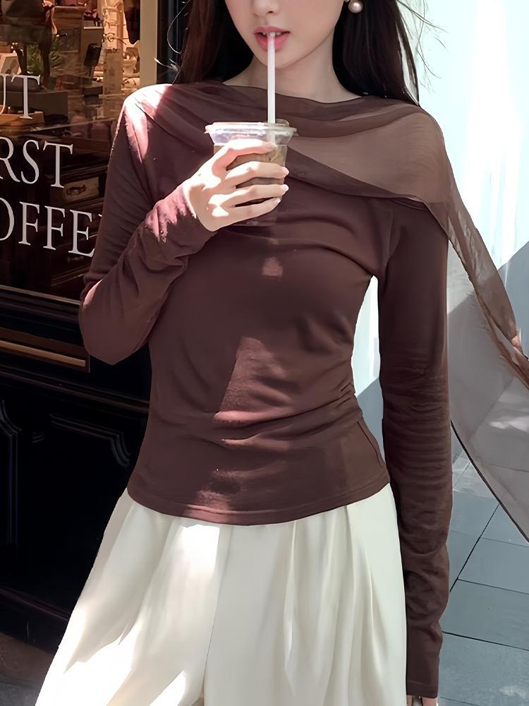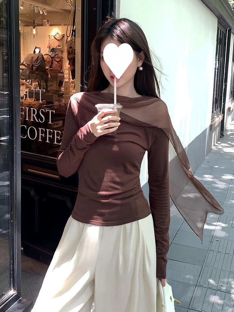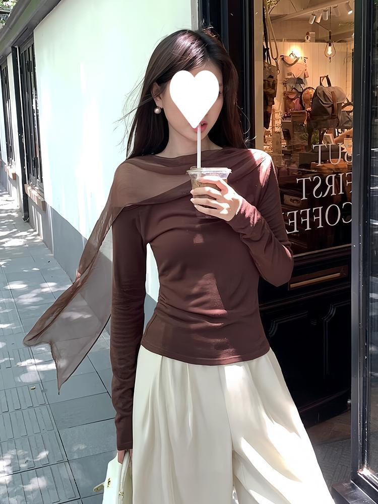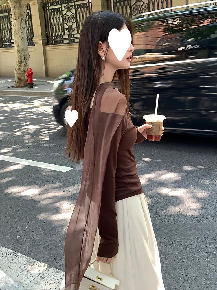 레트로 메일라드 커피색 사선 스트랩 홀터넥 긴팔 니트 여성 초가을 스타일리시 슬림핏 숏탑