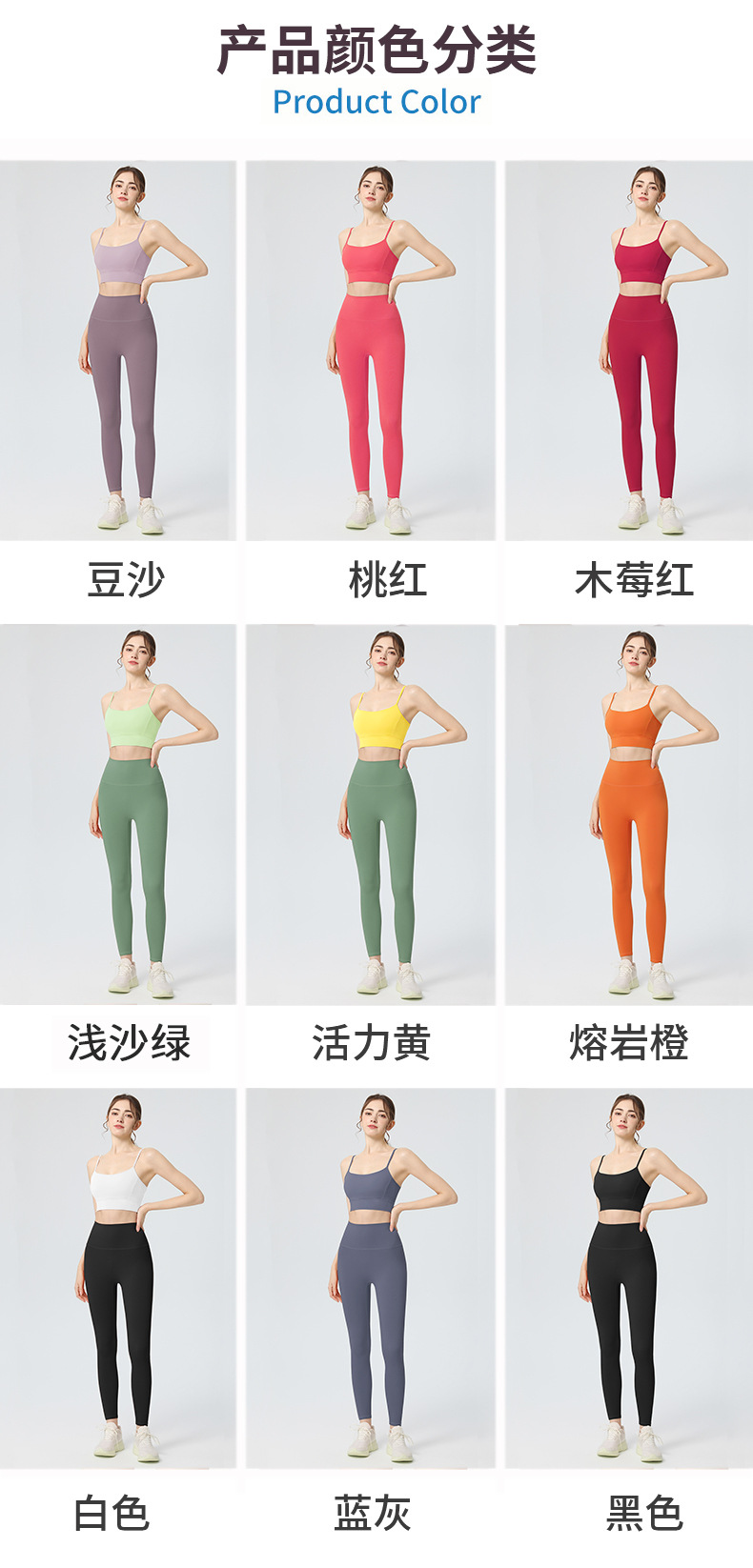 | 颜色 | 熔岩橙文胸+熔岩橙长裤, 木莓红文胸+木莓红长裤, 桃红文胸+桃红长裤, 蓝灰文胸+灰蓝长裤, 黑色文胸+黑色长裤, 白色文胸+黑色长裤, 白色文胸+钛灰色长裤, 豆沙文胸+紫灰长裤, 活力黄文胸+薄荷绿长裤, 活力黄文胸+黑色长裤, 蓝灰文胸+黑色长裤, 浅沙绿文胸+薄荷绿长裤, 熔岩橙文胸+黑色长裤, 桃红文胸+黑色长裤 | 裤长 | 长裤 |