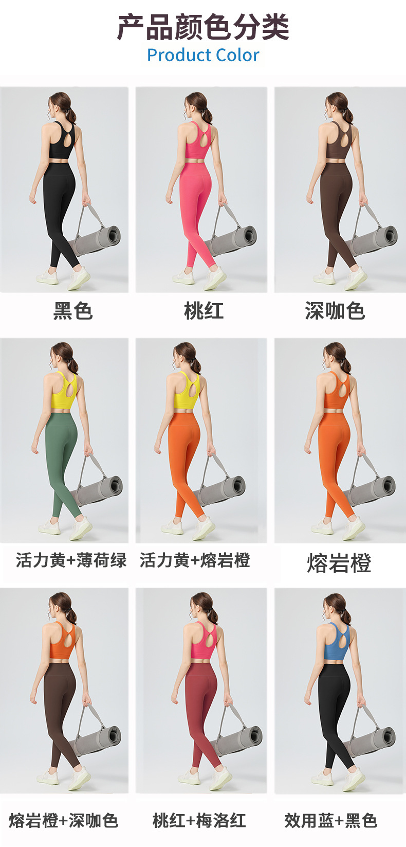 | 颜色 | 熔岩橙文胸+熔岩橙长裤, 深咖色文胸+深咖色长裤, 桃红文胸+桃红长裤, 黑色文胸+黑色长裤, 活力黄文胸+薄荷绿长裤, 活力黄文胸+熔岩橙长裤, 熔岩橙文胸+深咖色长裤, 水木绿文胸+松石绿长裤, 桃红文胸+梅洛红, 效用蓝文胸+黑色长裤 | 裤长 | 长裤 |