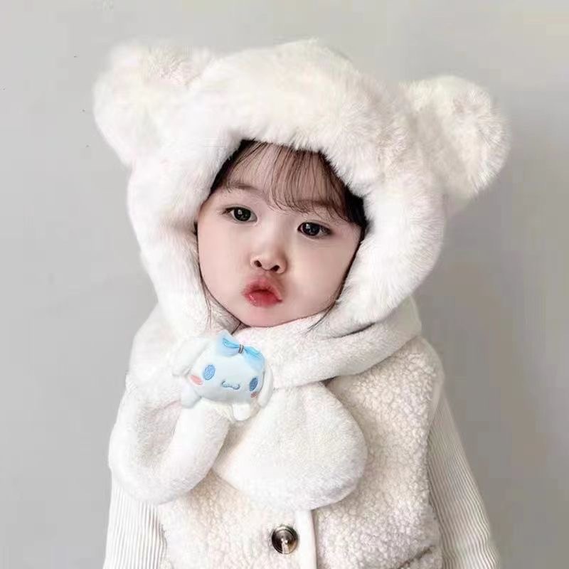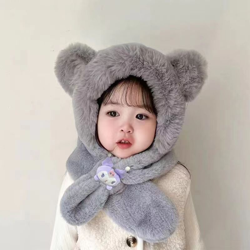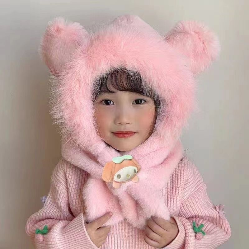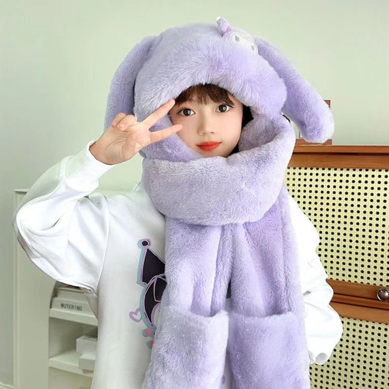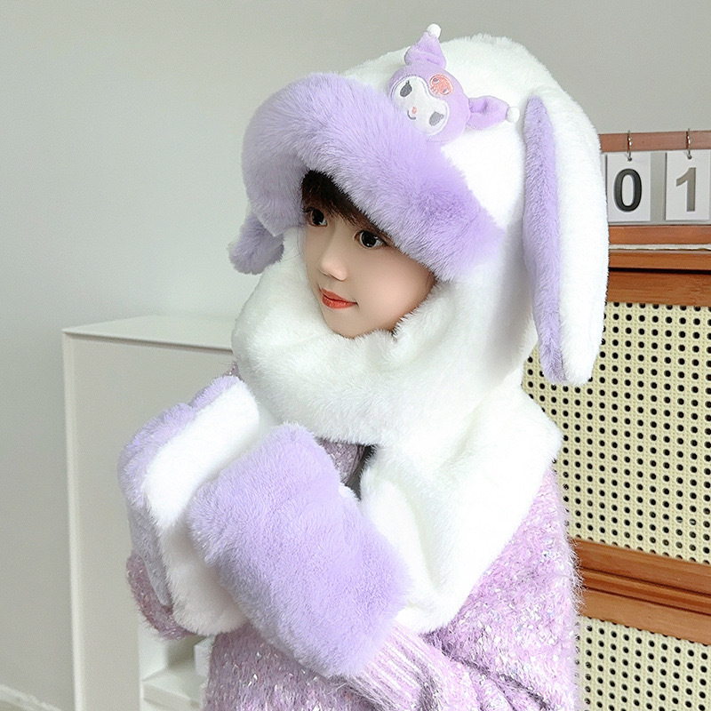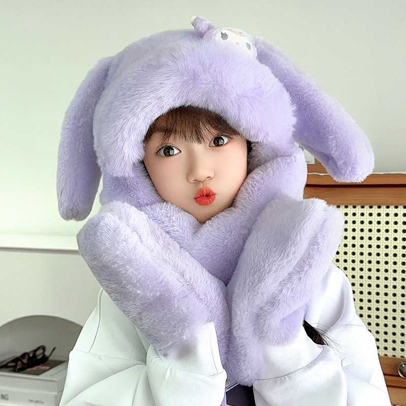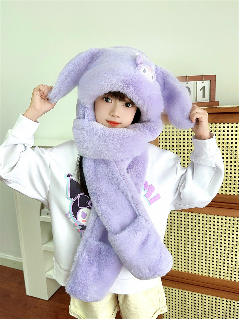 토끼 귀 움직일 수있는 어린이 모자와 스카프 통합 가을, 겨울 소녀 Kuromi 스카프 두꺼운 플러시 귀여운 귀 보호
