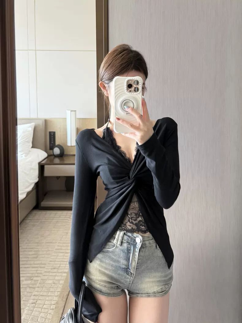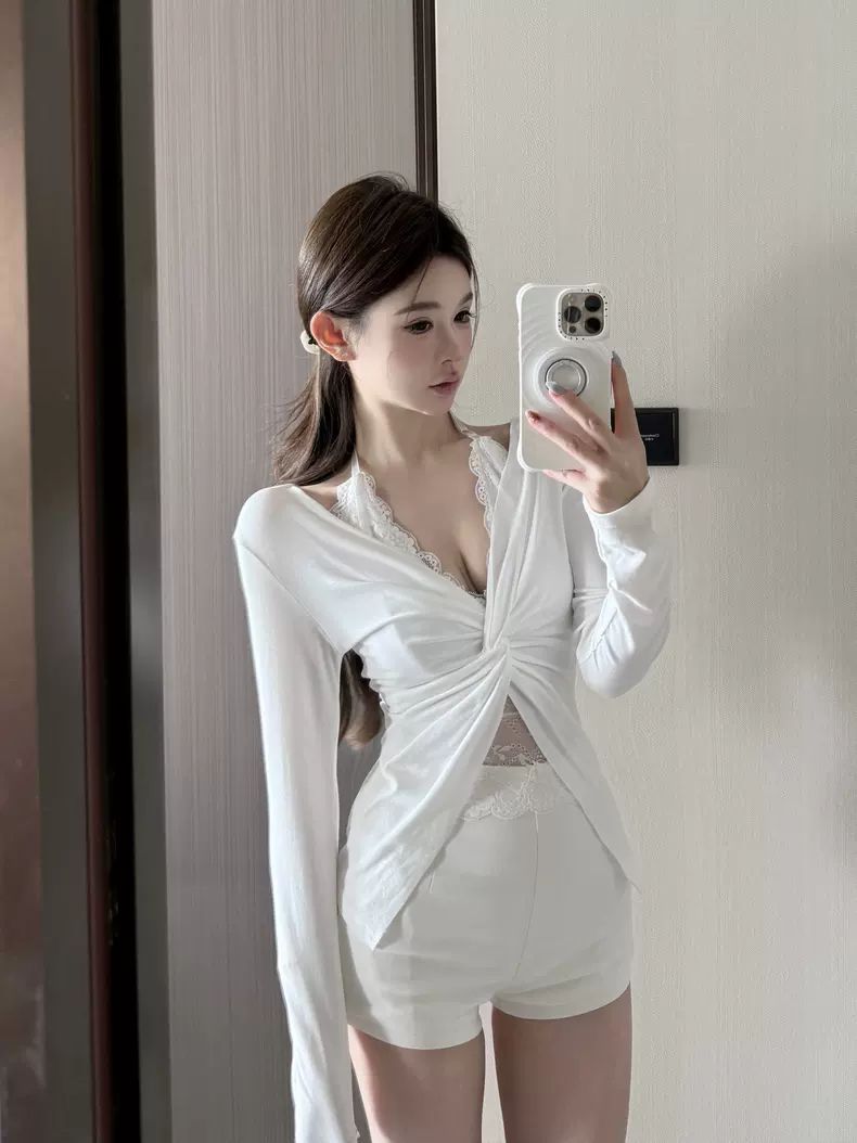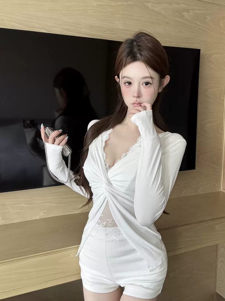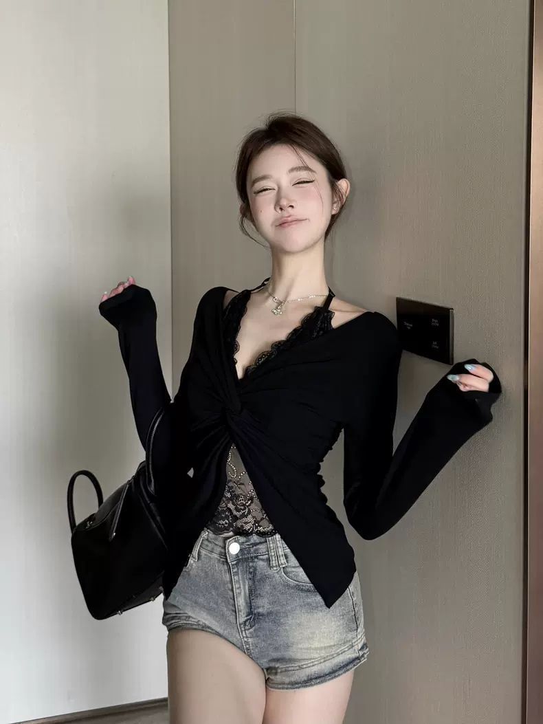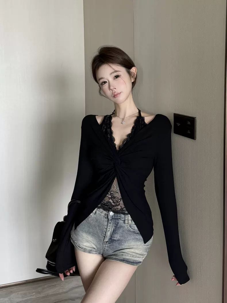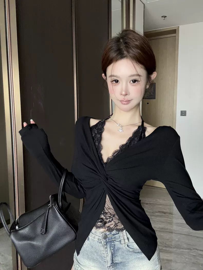 가을 핫걸 슬리밍 트위스트 탑 차 레이스 가짜 투피스 v 넥 긴팔 티셔츠 여성용 슬림 디자인