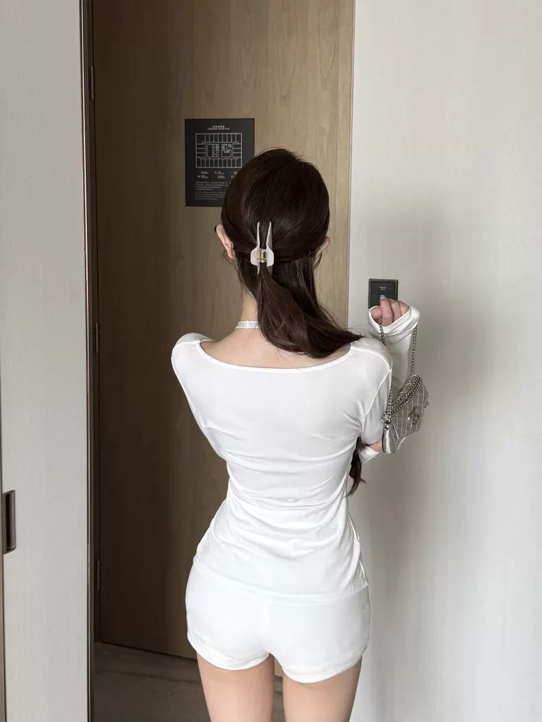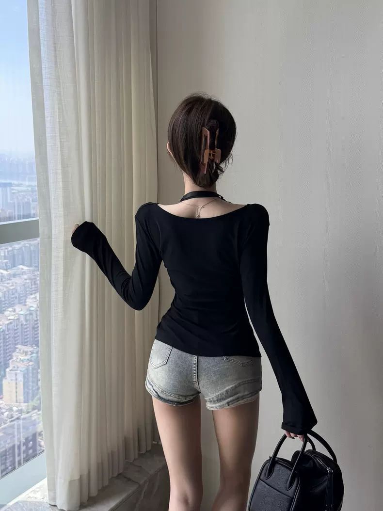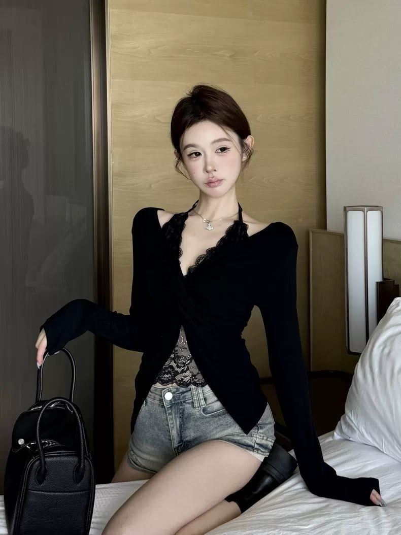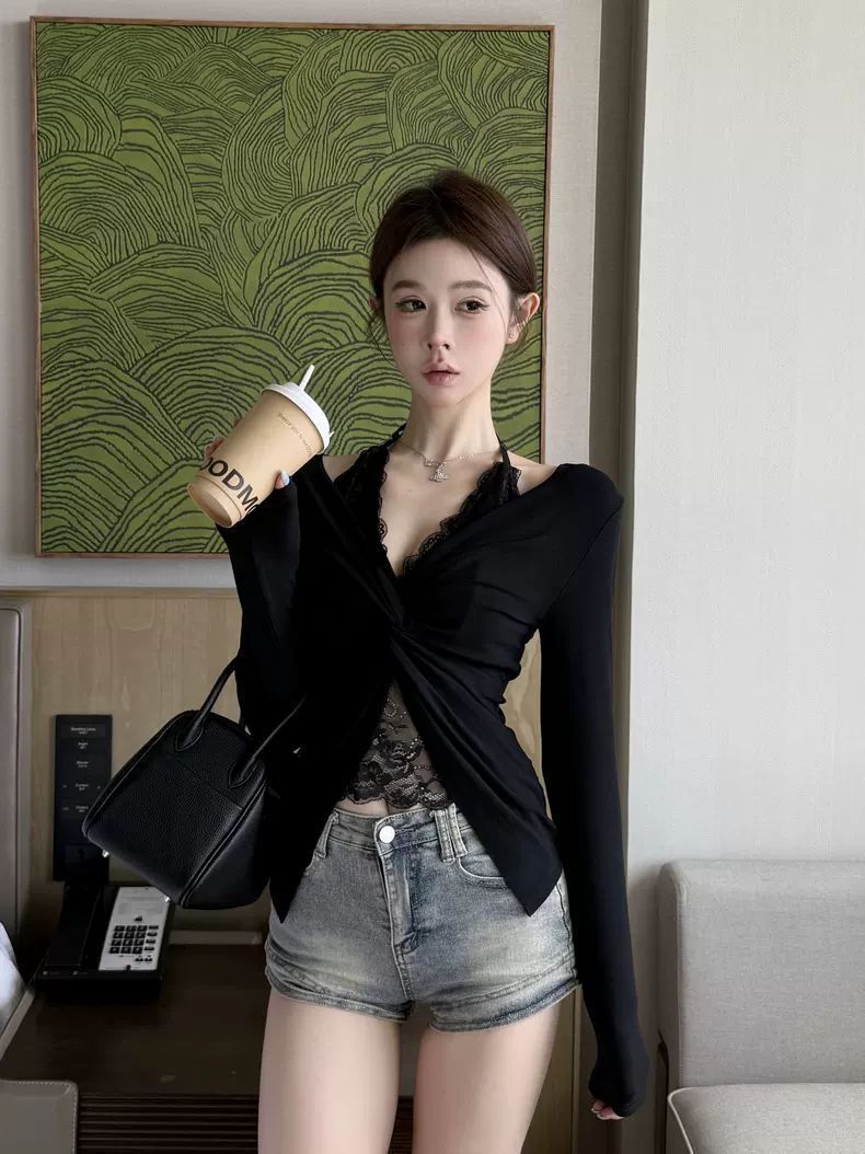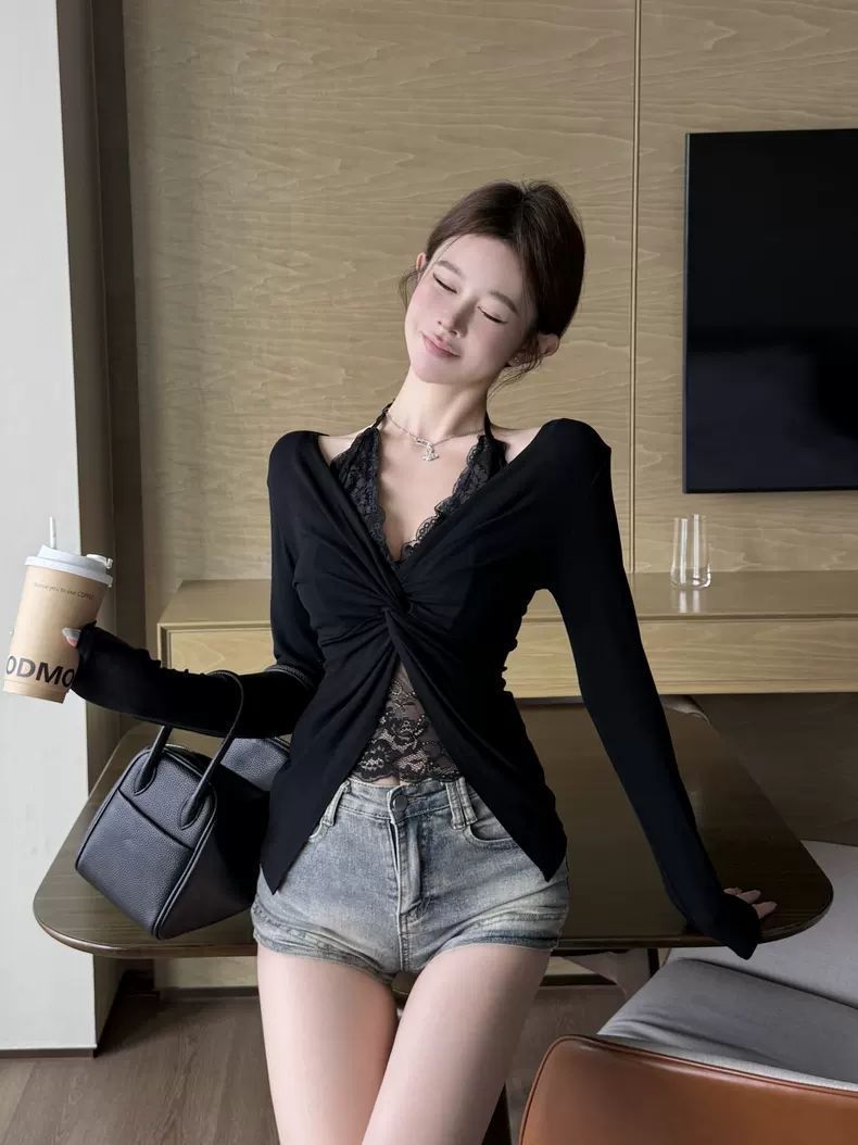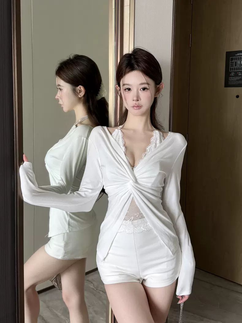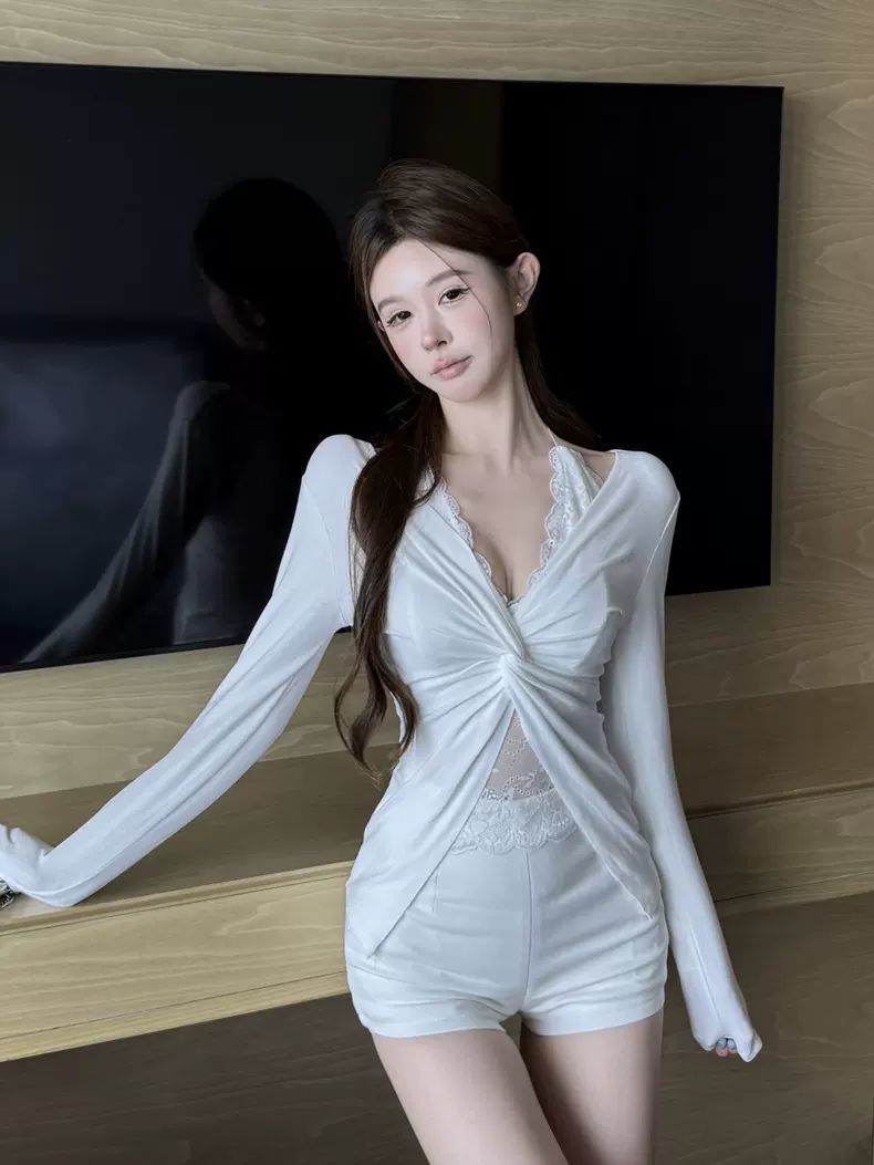 가을 핫걸 슬리밍 트위스트 탑 차 레이스 가짜 투피스 v 넥 긴팔 티셔츠 여성용 슬림 디자인