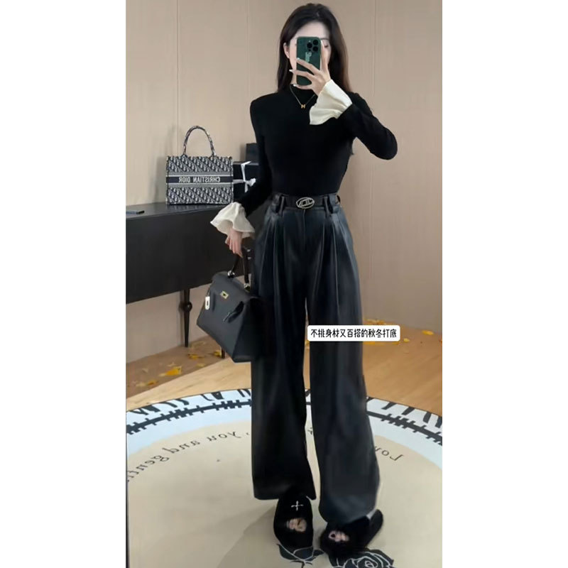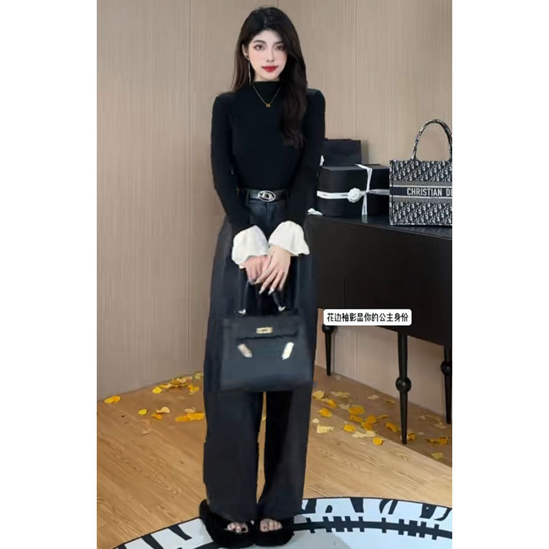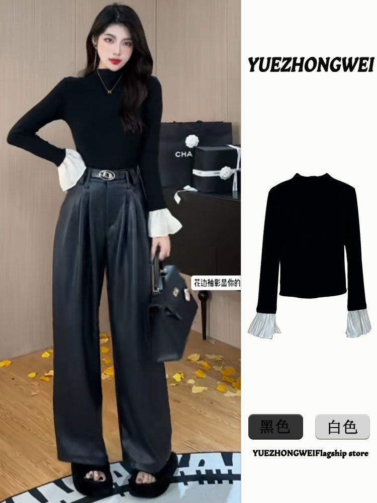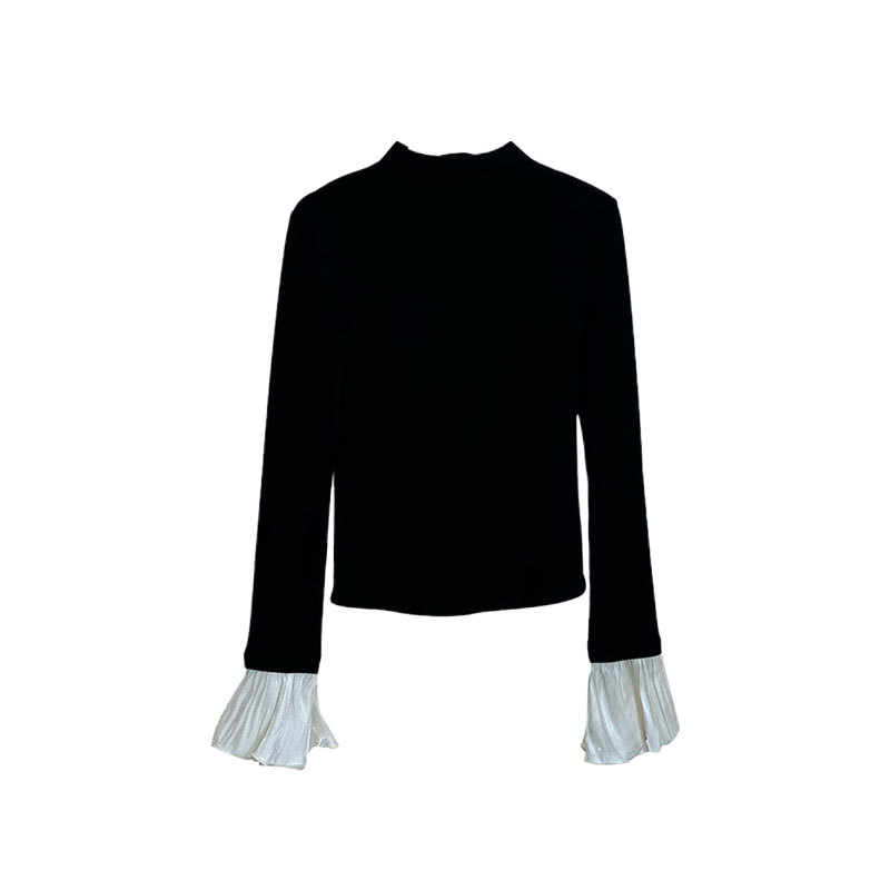 가을 겨울 여성용 블랙 하프 터틀넥 벨 슬리브 벨벳 바닥 셔츠, 고급 슬림핏 이너 긴팔 티셔츠 탑