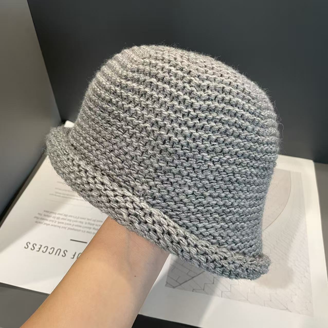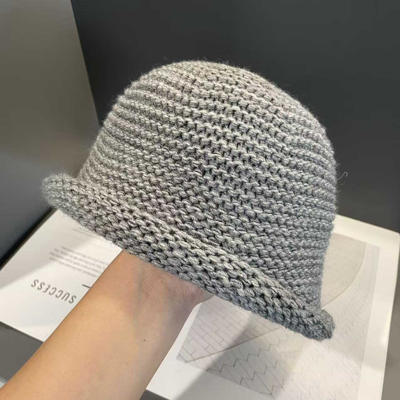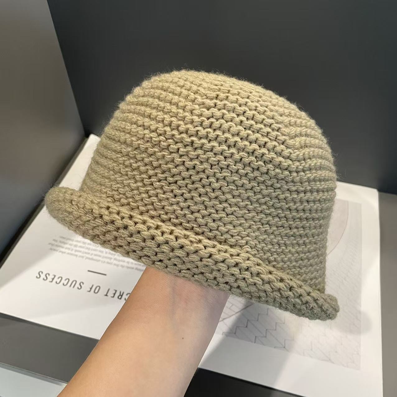 도매 한국 2025 새로운 가을, 겨울 수제 뜨개질 두꺼운 양모 컬링 버킷 모자 여성을위한 캐주얼 솔리드 컬러 버킷 모자