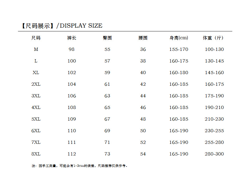 | 尺码 | M, L, XL, 2XL, 3XL, 4XL, 5XL, 6XL, 7XL, 8XL | 洗水工艺 | 水洗 |