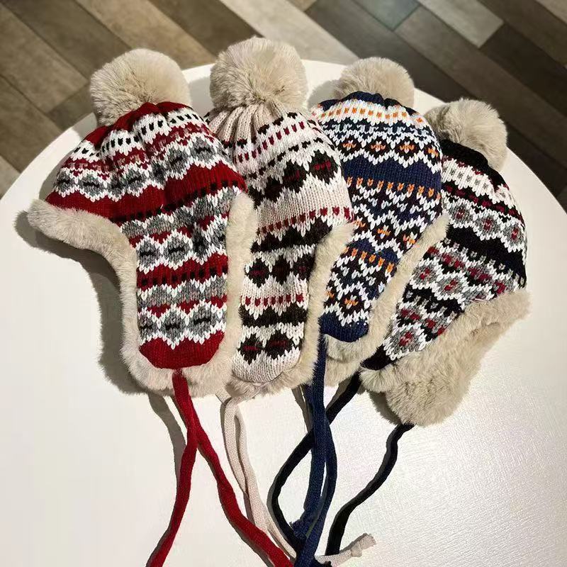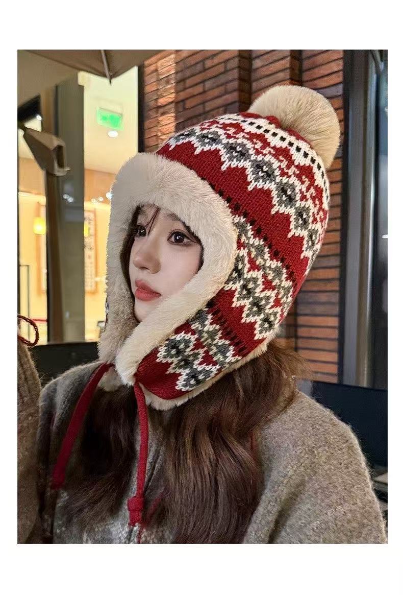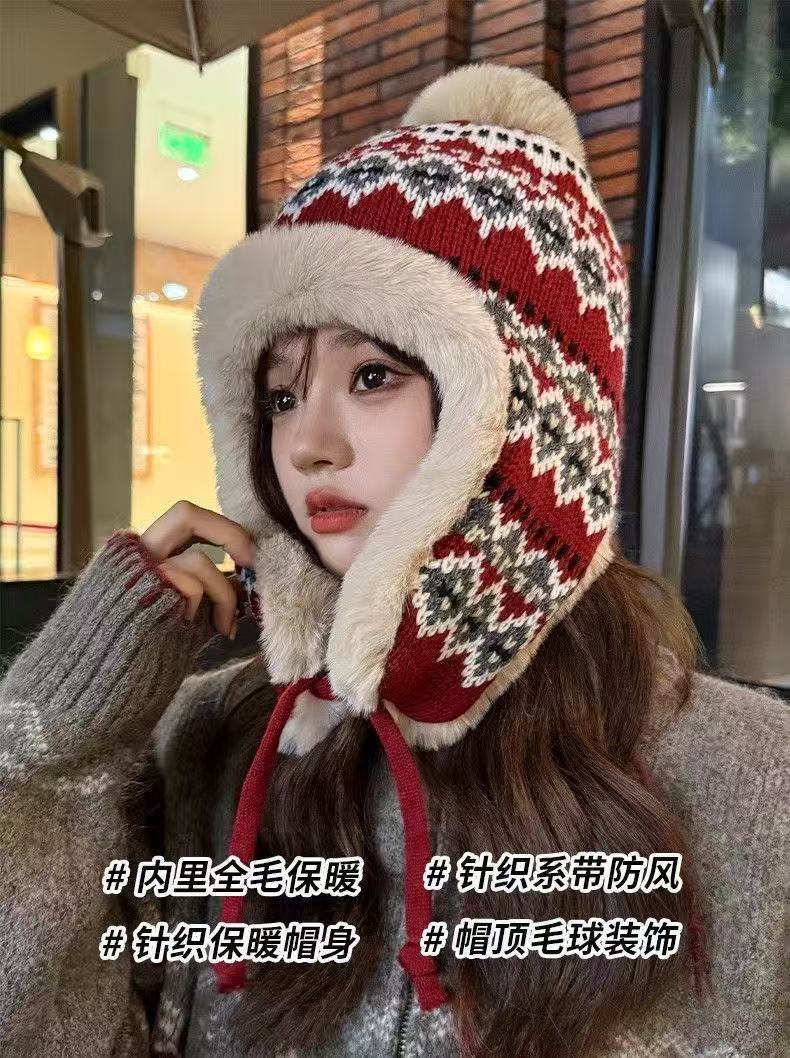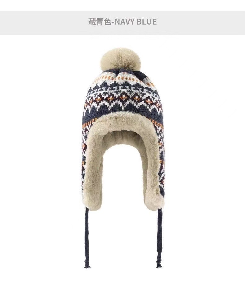 민족 스타일 모자 여성 겨울 니트 따뜻한 동북 방한 플러스 벨벳 두꺼운 얼굴 보호 귀 보호 면 모자 Lei Feng Hat