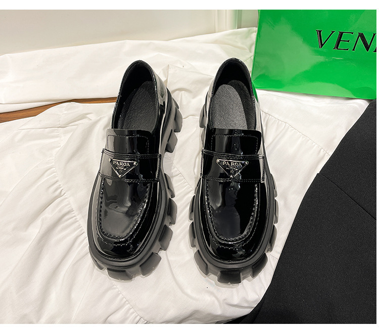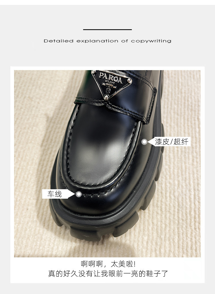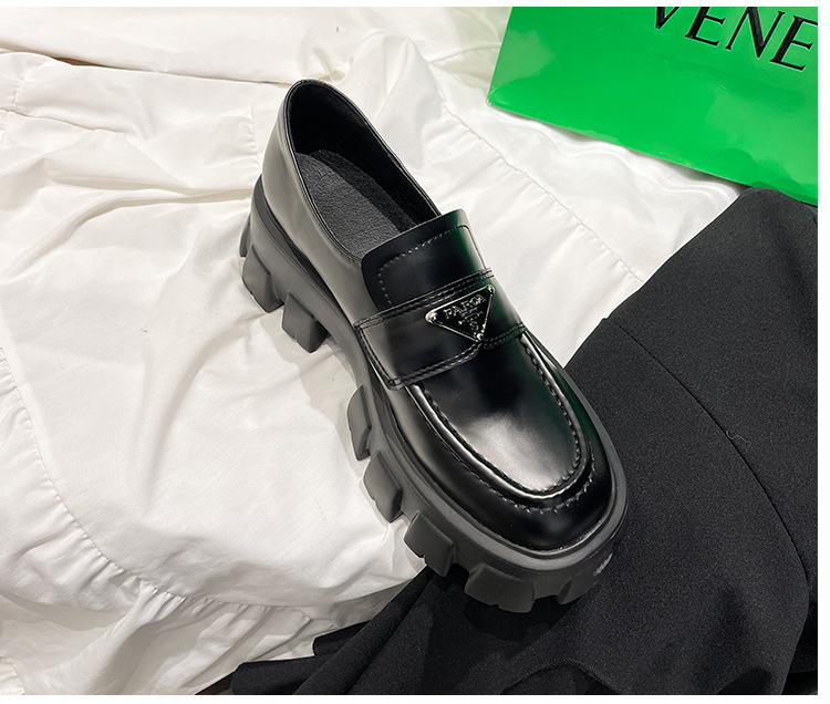 재고 있음 ~ 32-43 사이즈 여성용 작은 가죽 신발 디자인, 여성용 대형 및 소형 삼각형 로고, 두꺼운 밑창 플랫폼 로퍼