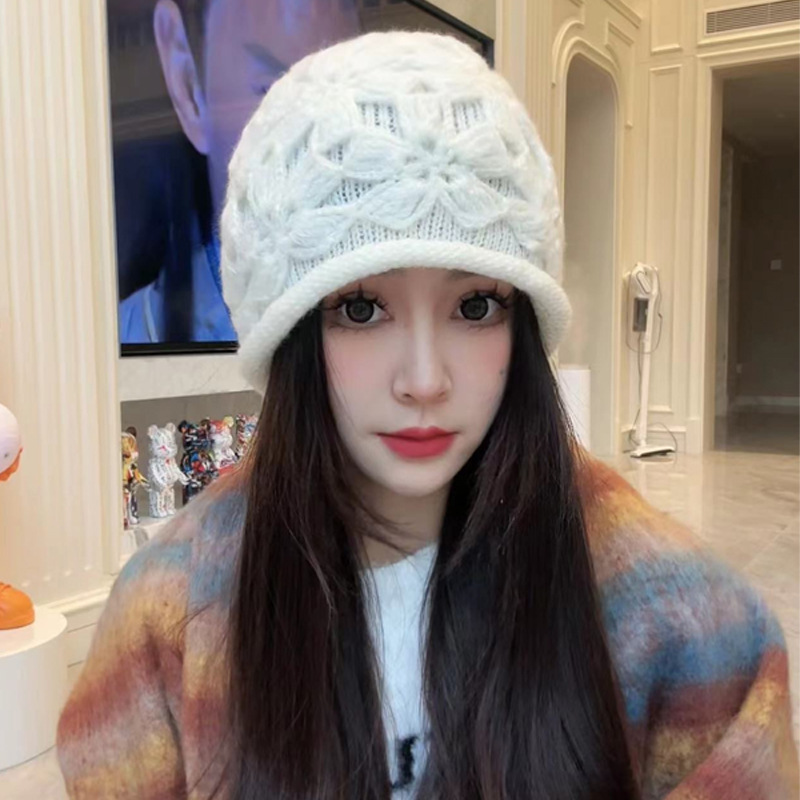 얼굴이 작은 여성을 위한 핸드메이드 입체 크로셰 해바라기 컬 니트 모자, 이중층 두껍고 따뜻한 귀 보호 풀오버 모자, 트렌디함