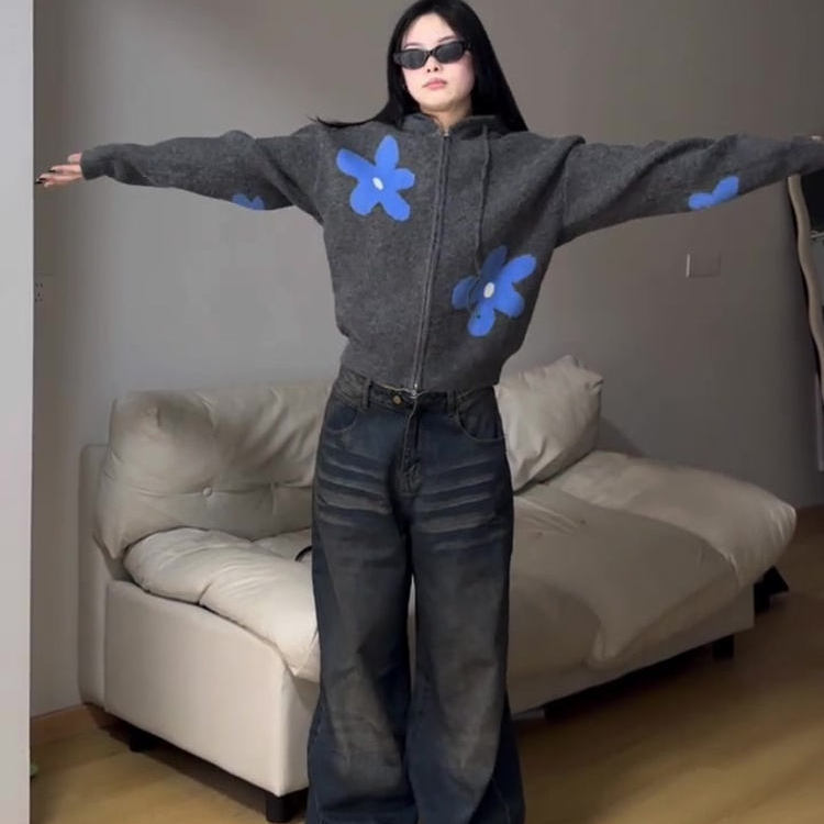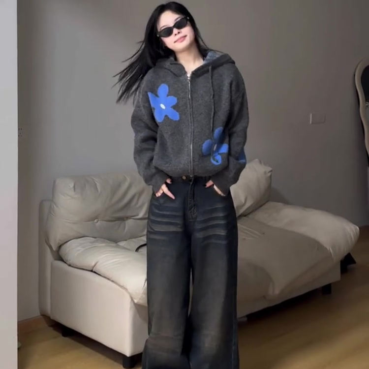 여성을위한 대학 스타일 회색 지퍼 후드 스웨터 카디건 스웨터 가을, 겨울 하이 엔드 게으른 느슨한 코트 탑
