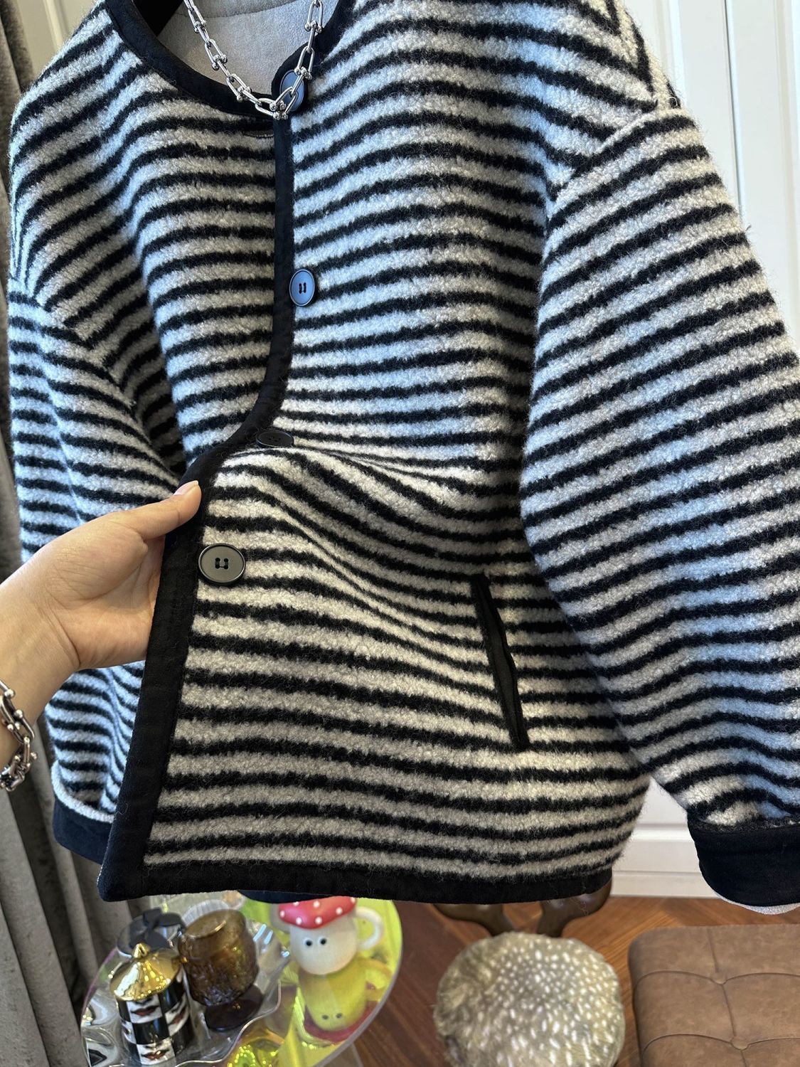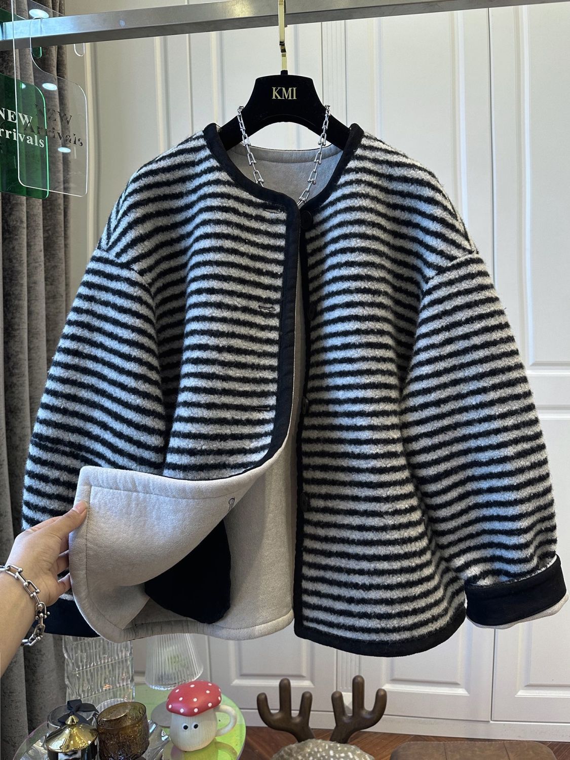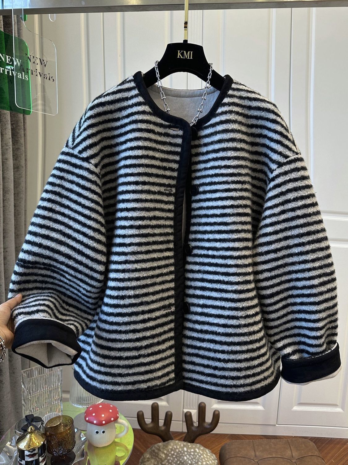 캐주얼 패션 모피 코트 루즈 2025 한국어 버전 스트라이프 겨울 신작 여성상의 유럽 역대 대비 스판덱스