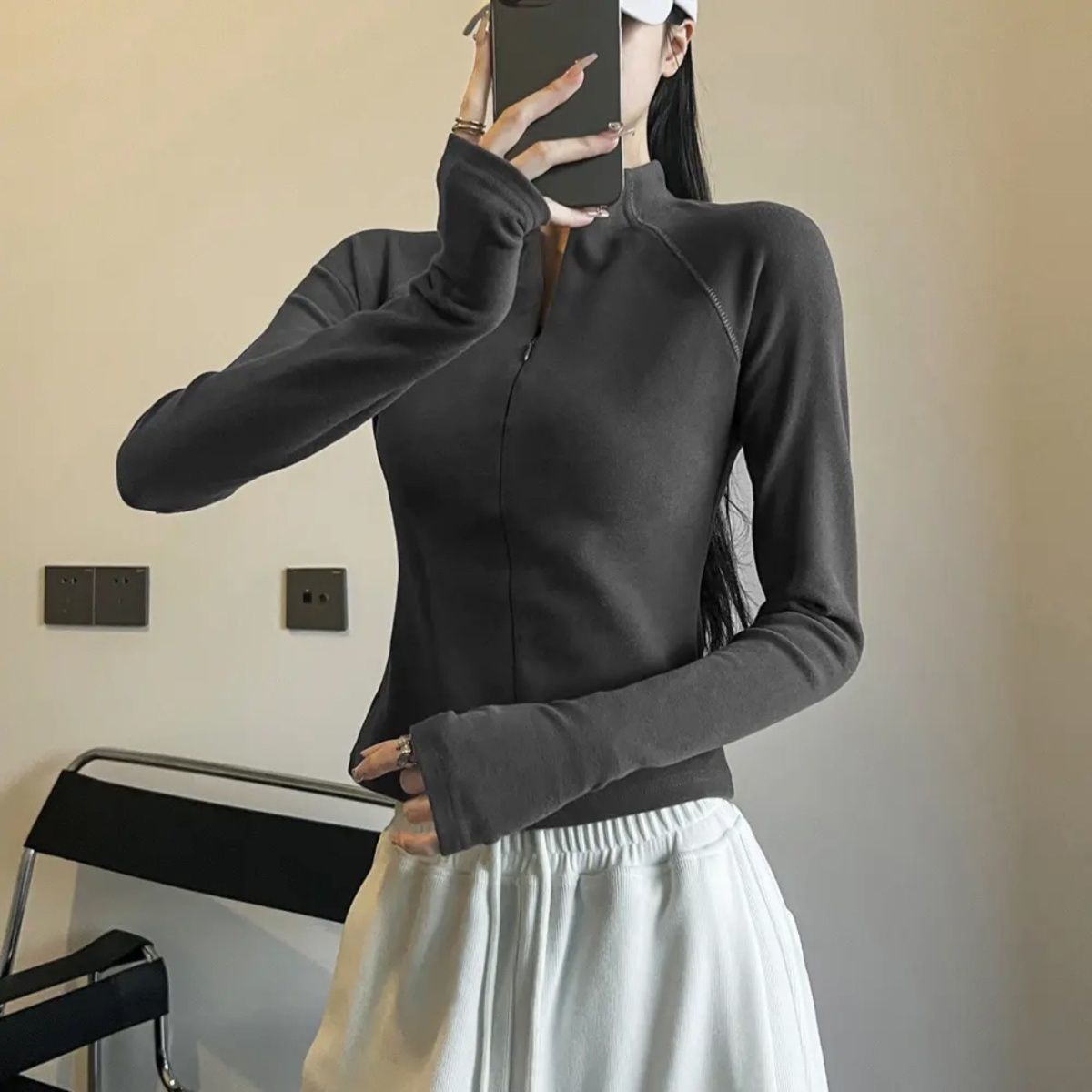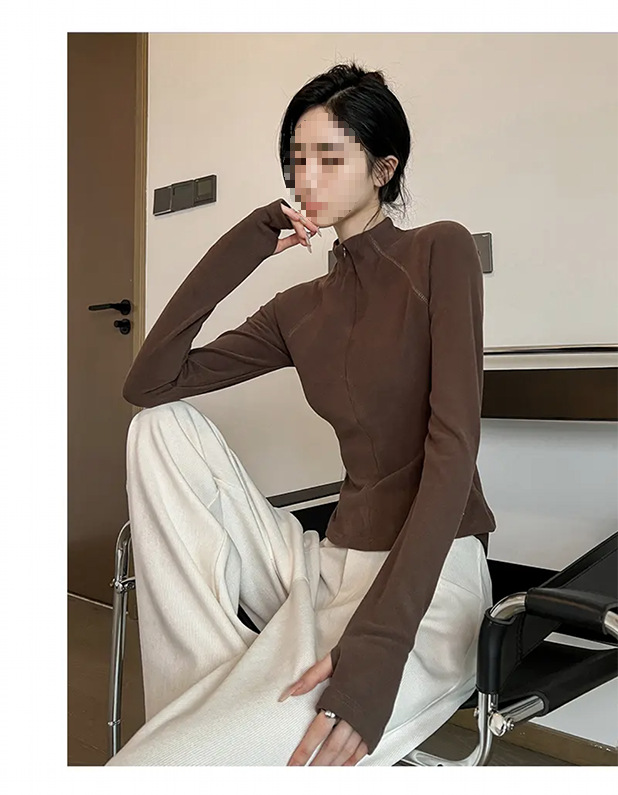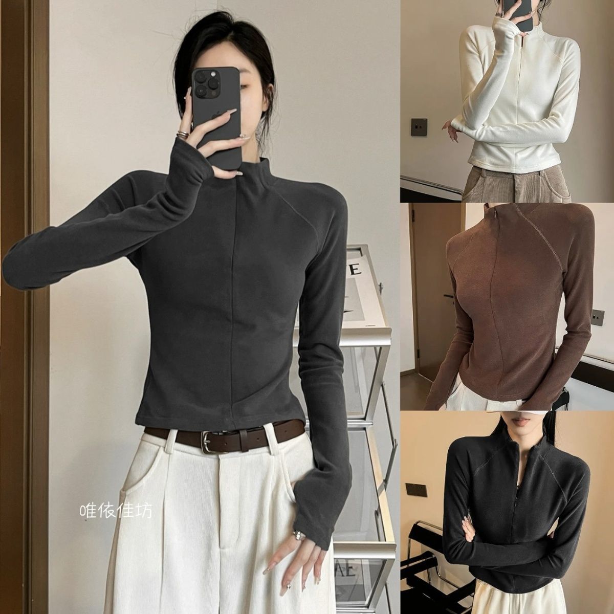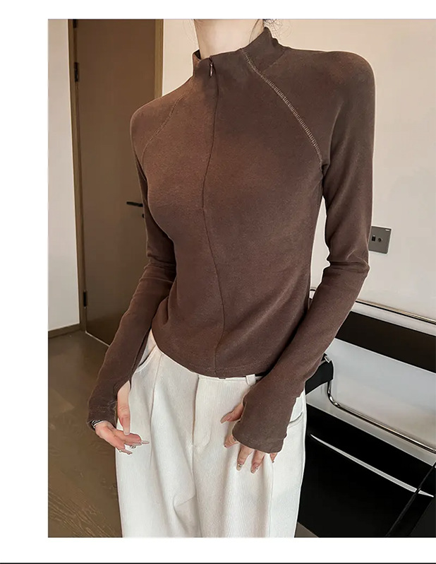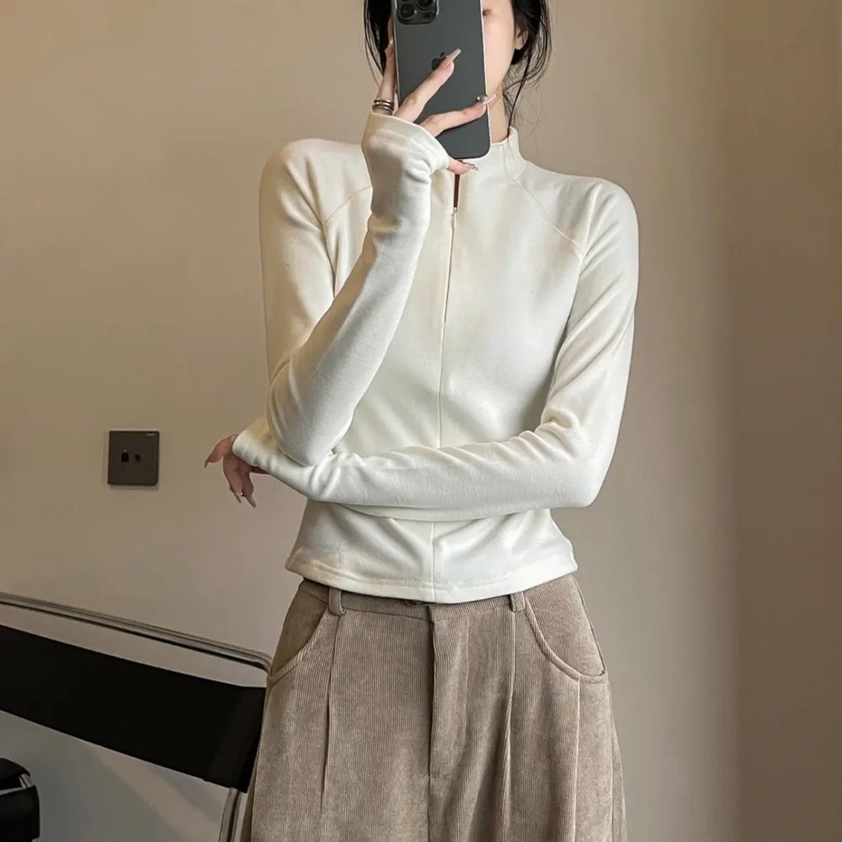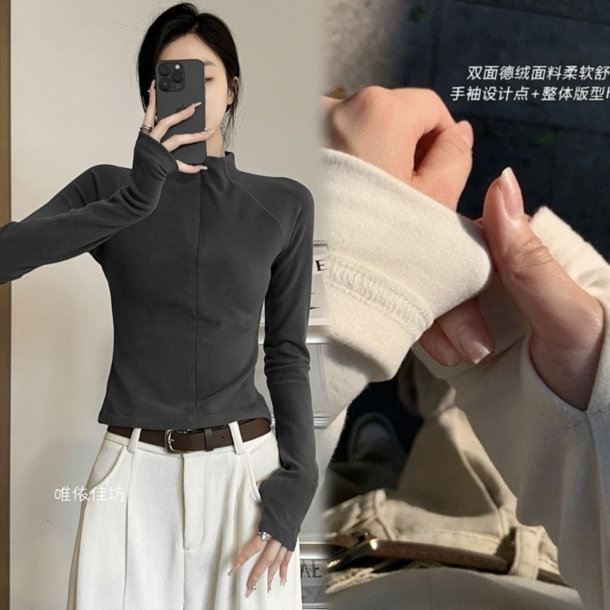 가을 겨울 여성용 따뜻하고 활용도가 높은 독일 벨벳 긴팔 티셔츠, 슬림핏 지퍼 플러스 벨벳 밑단 셔츠, 핫탑 트렌디
