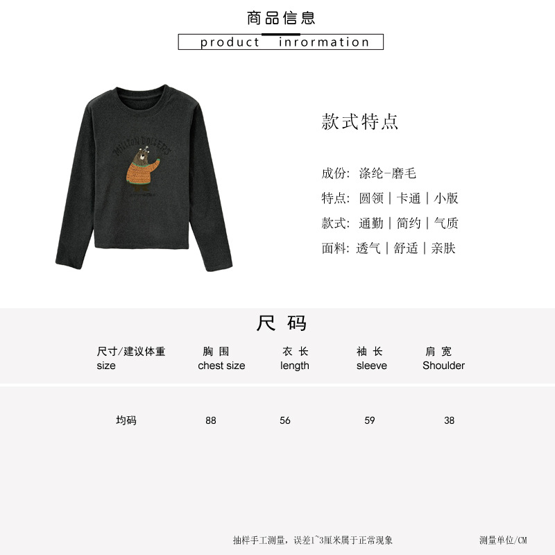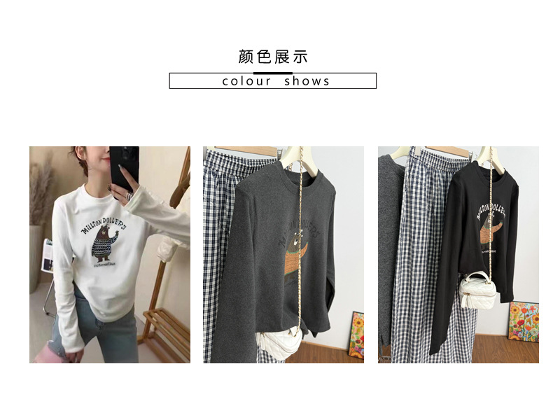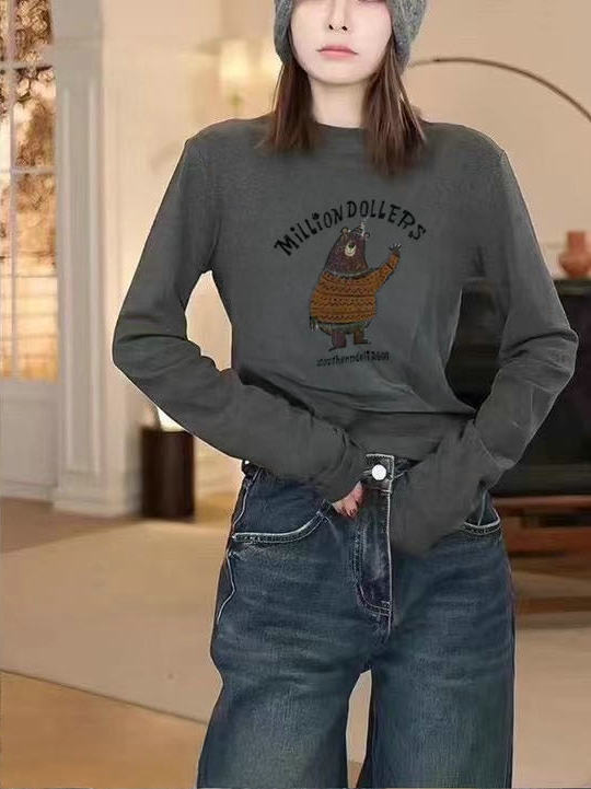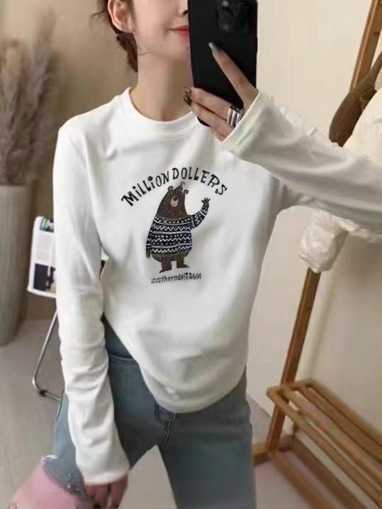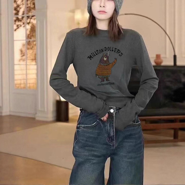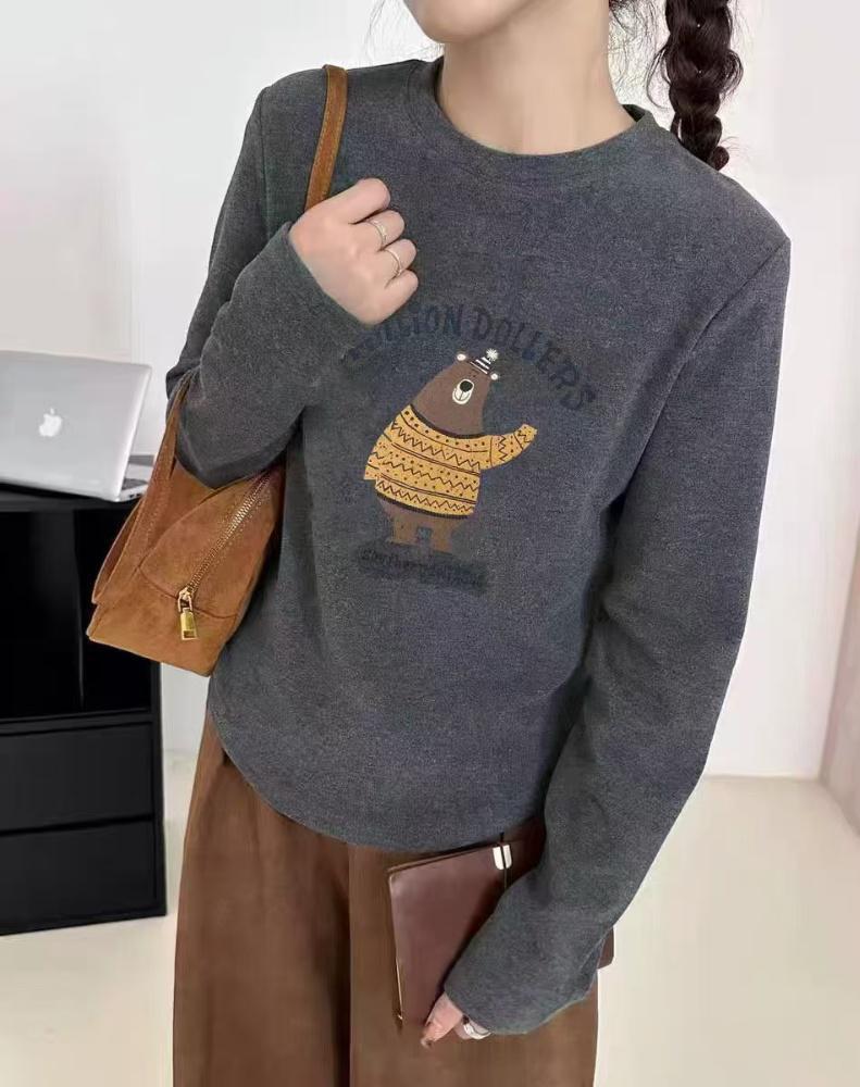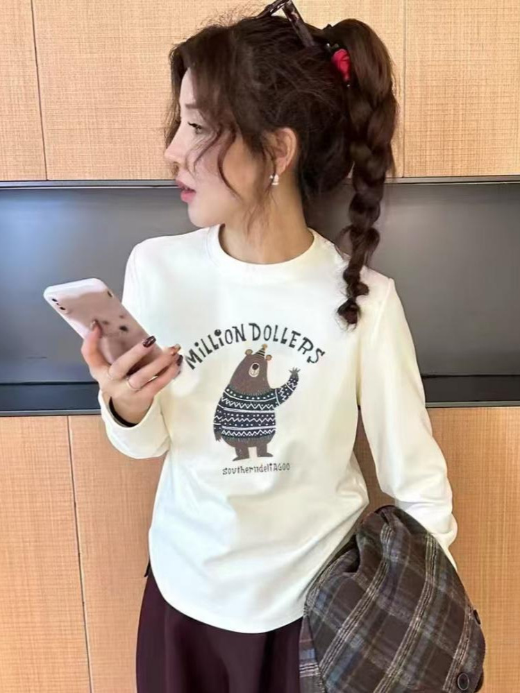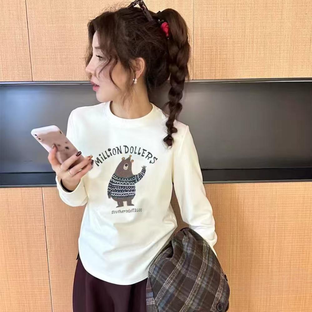 2025 겨울 신상 한국판 만화 곰돌이 오버숄더 긴팔 기모 티셔츠 여성용 베이직 상의