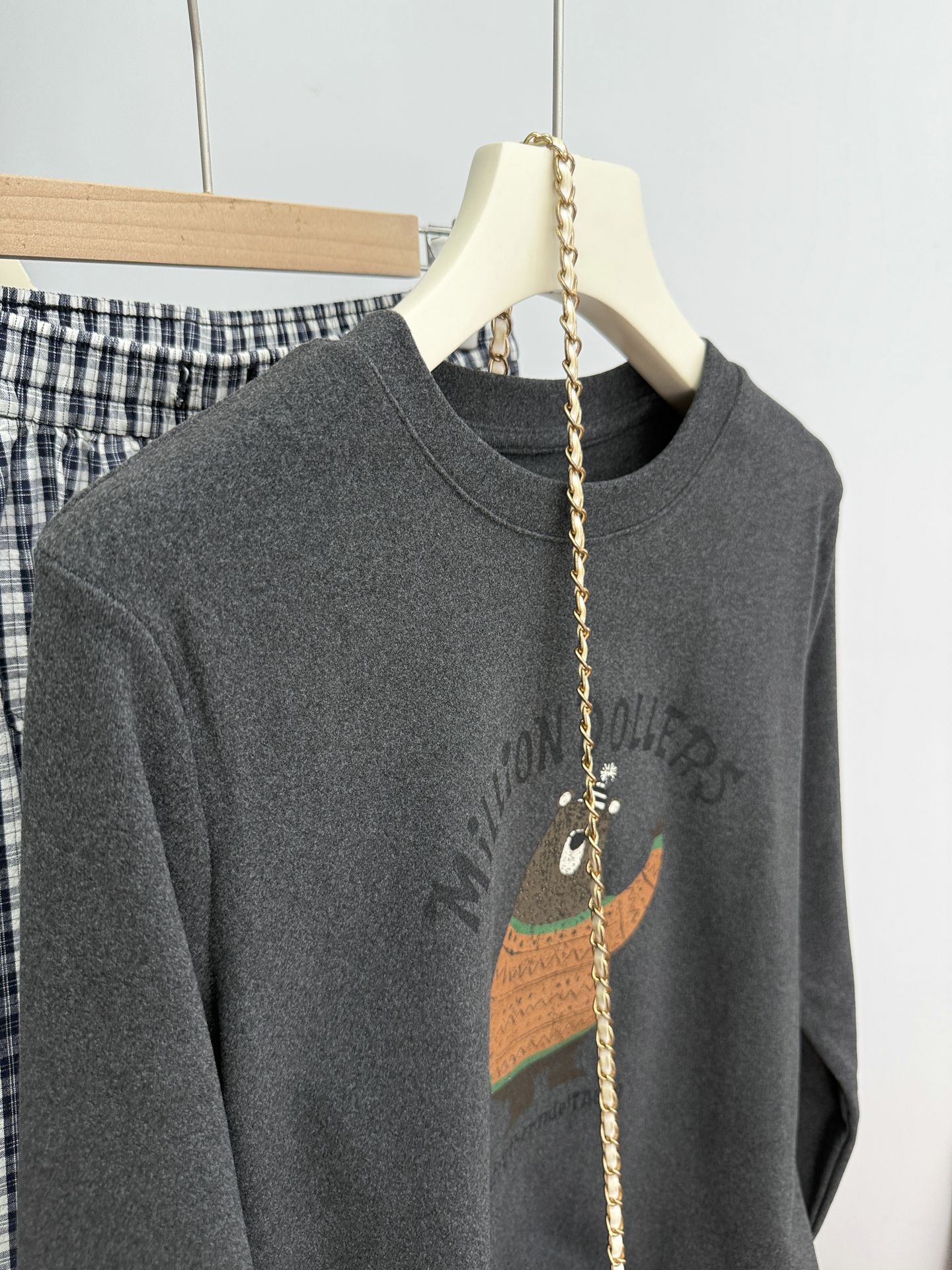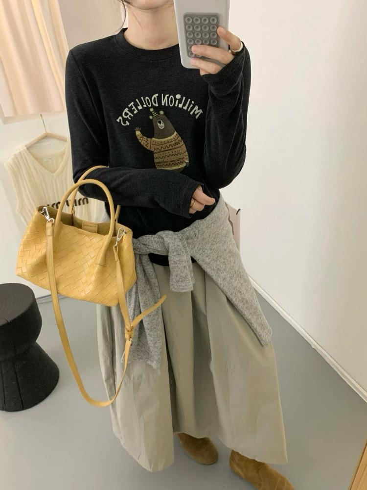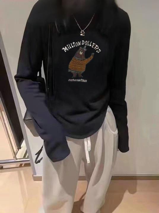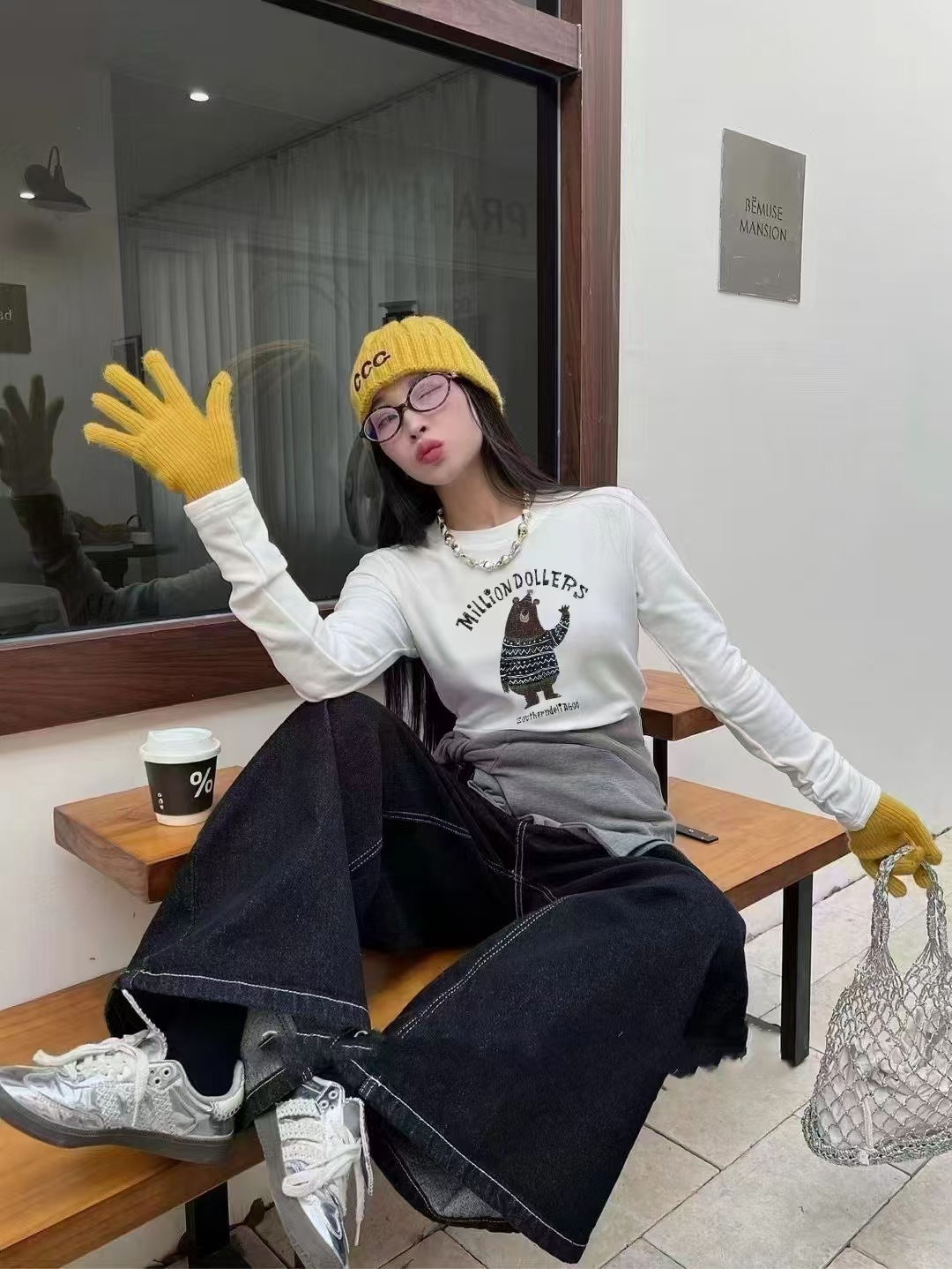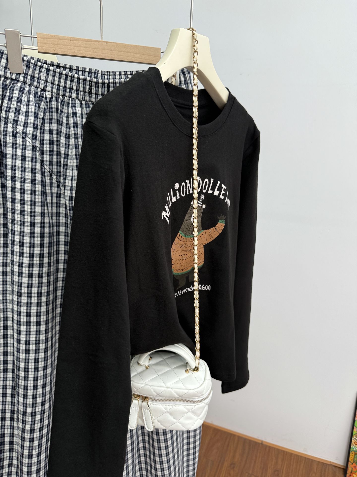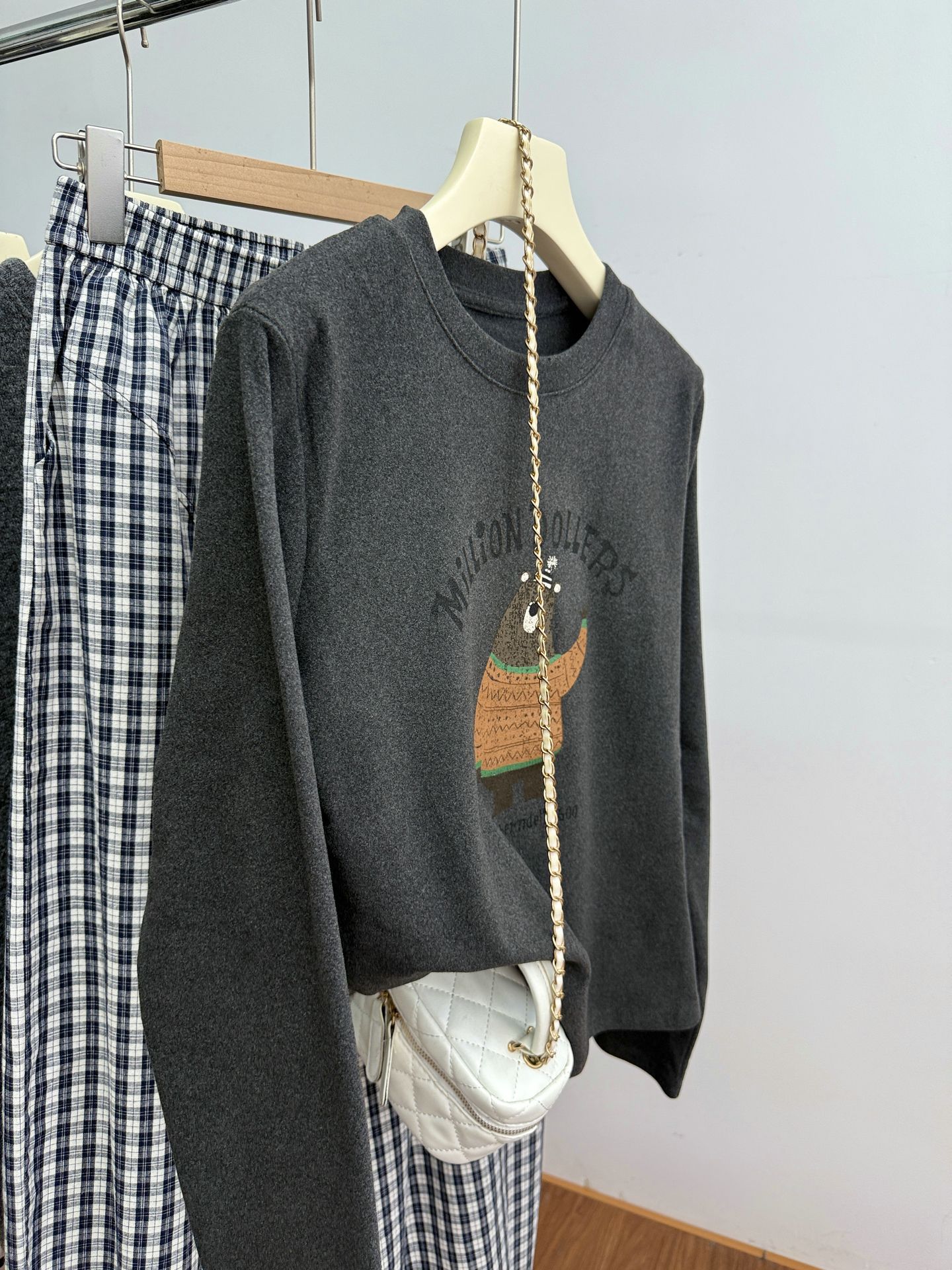 2025 겨울 신상 한국판 만화 곰돌이 오버숄더 긴팔 기모 티셔츠 여성용 베이직 상의
