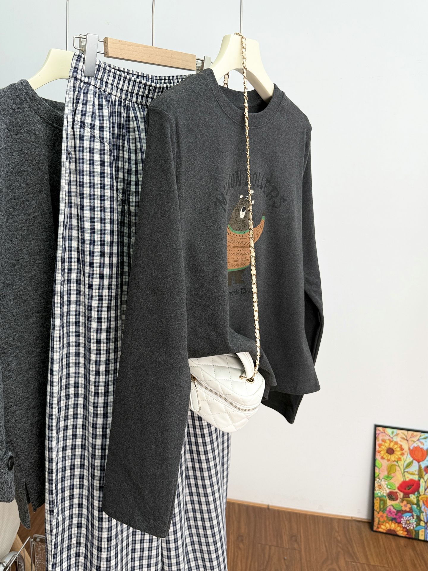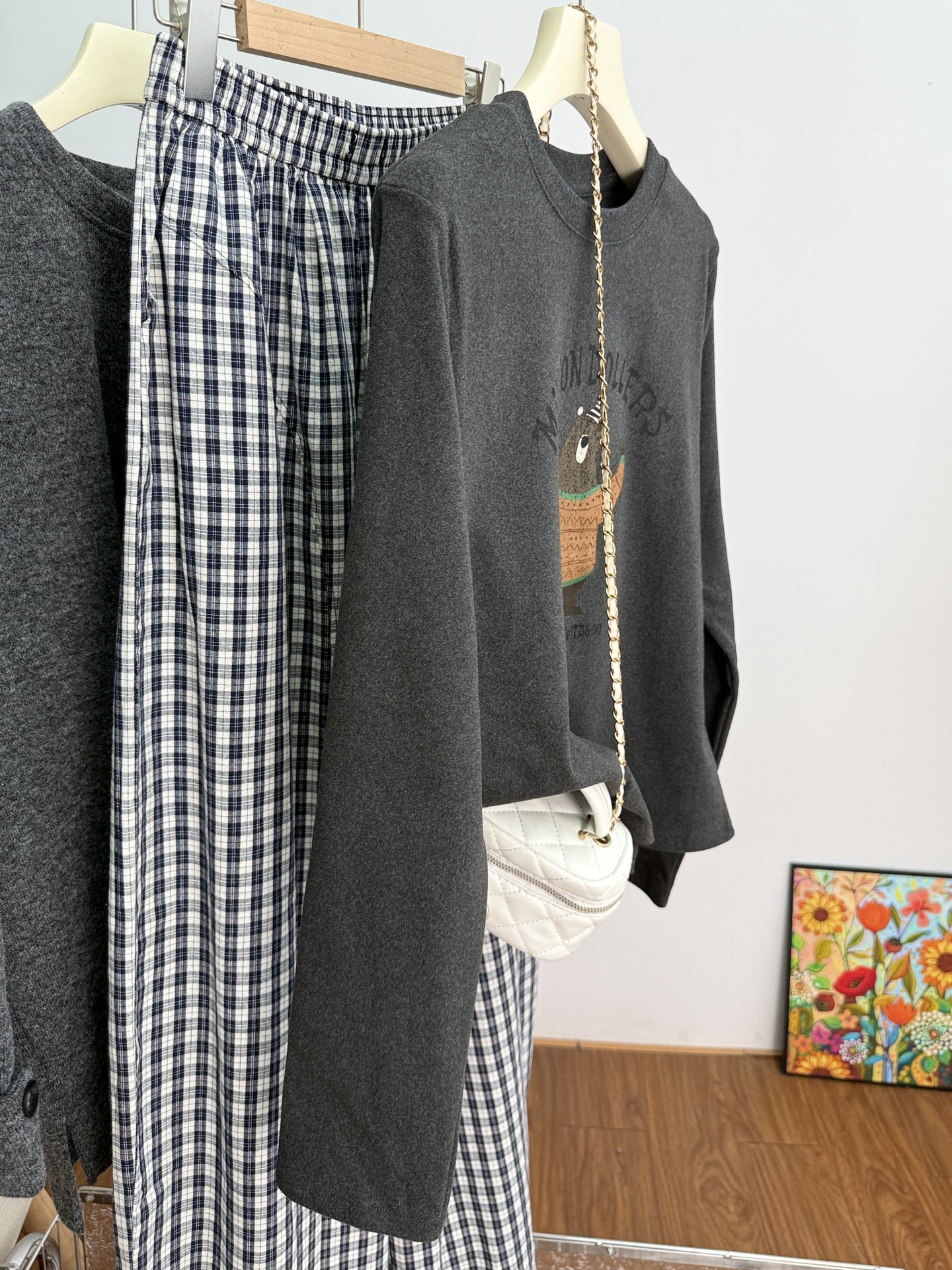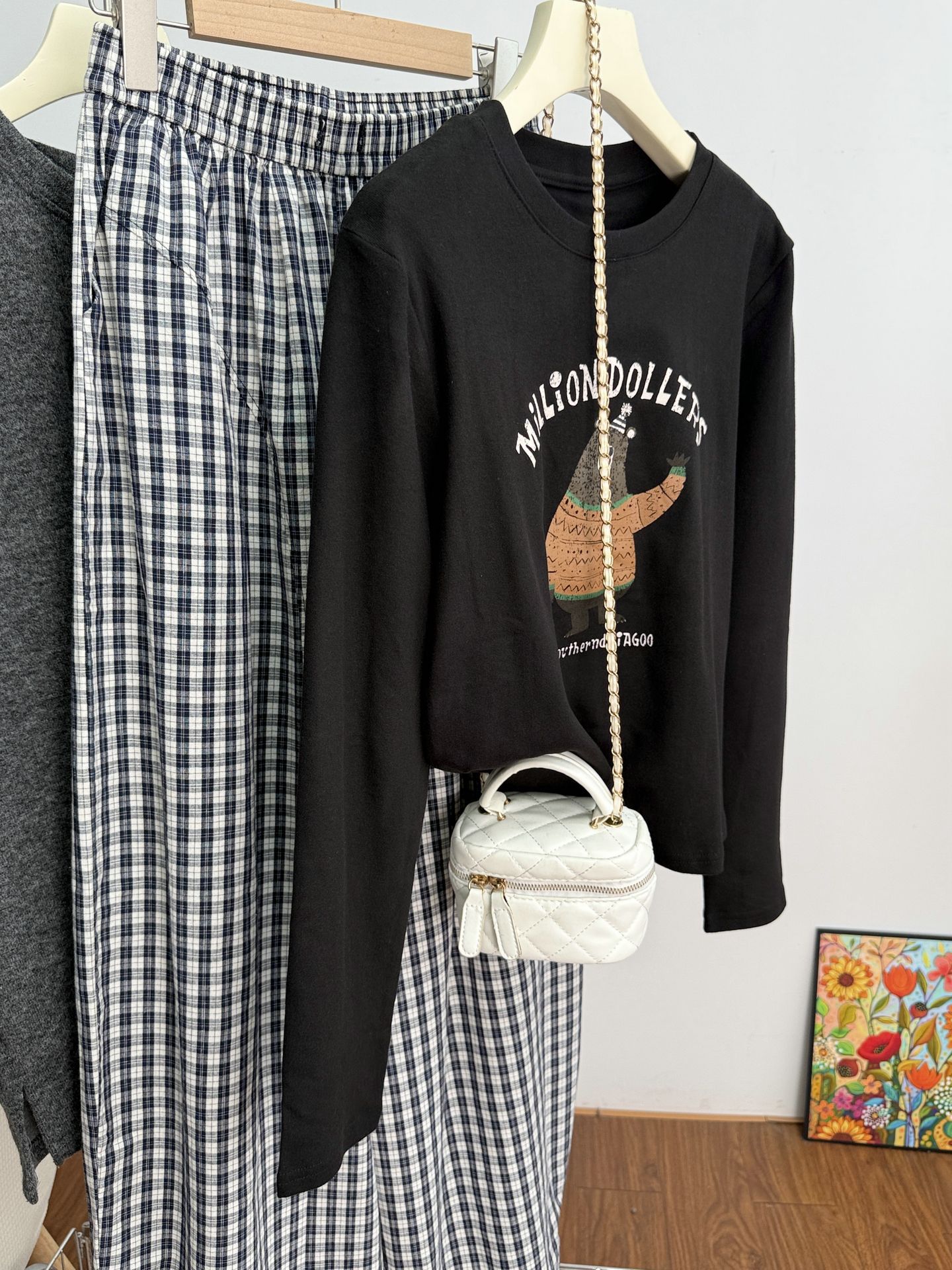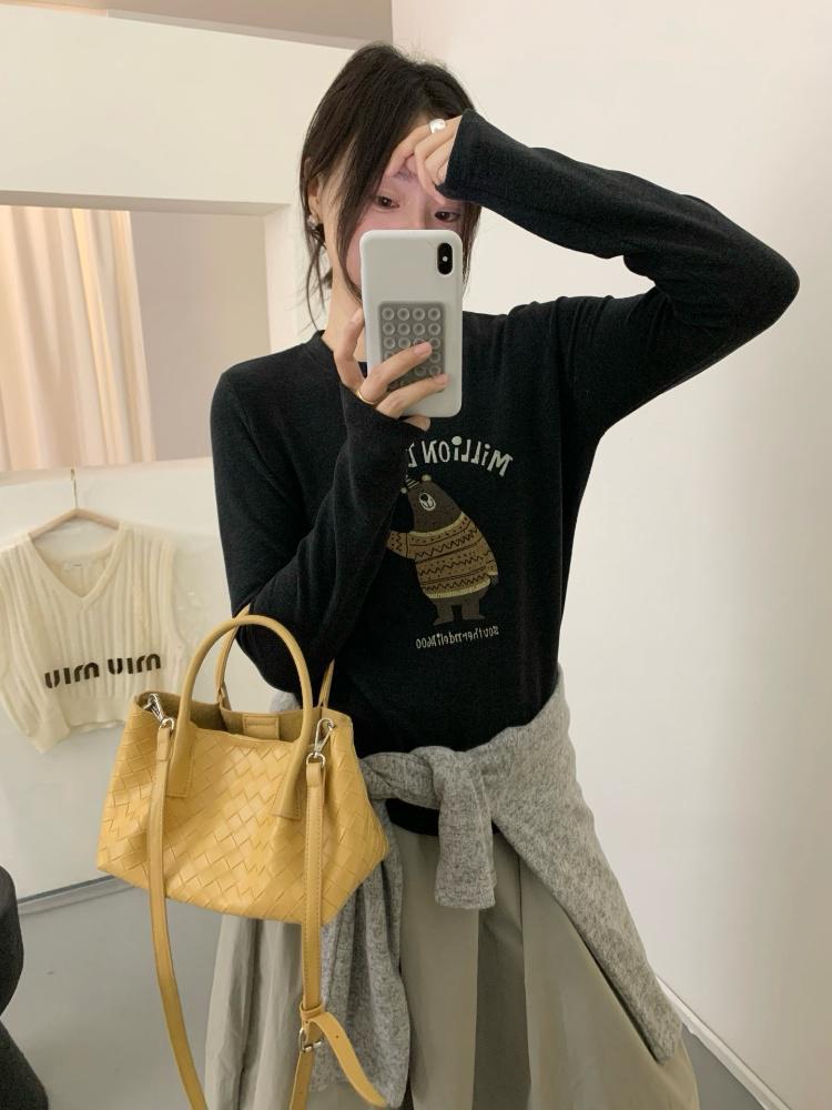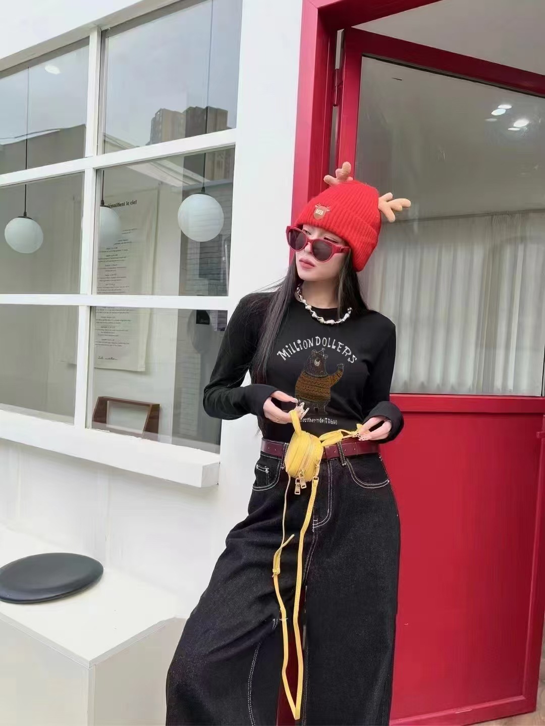 2025 겨울 신상 한국판 만화 곰돌이 오버숄더 긴팔 기모 티셔츠 여성용 베이직 상의
