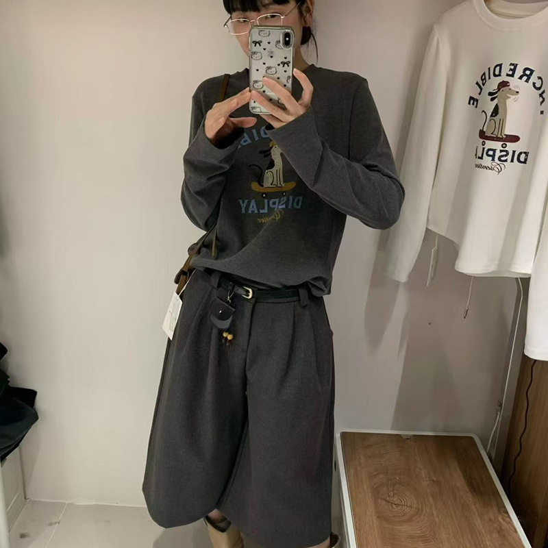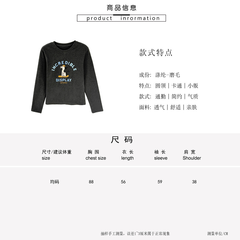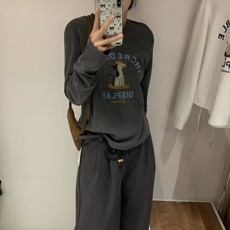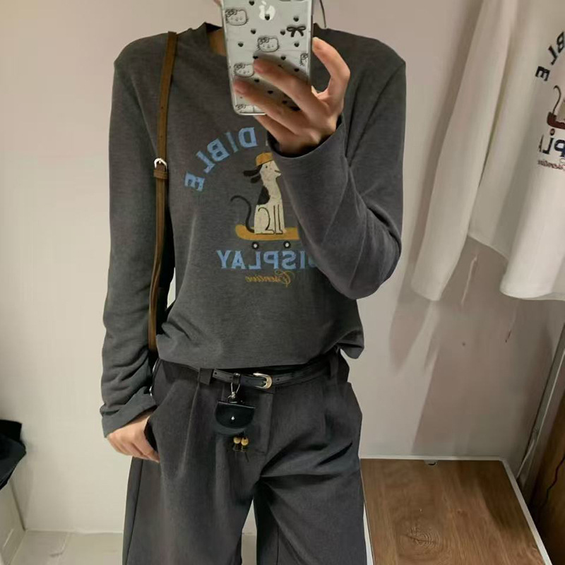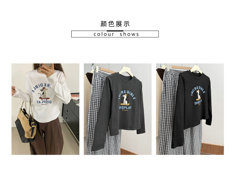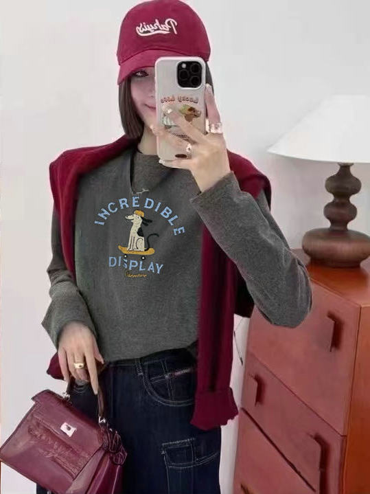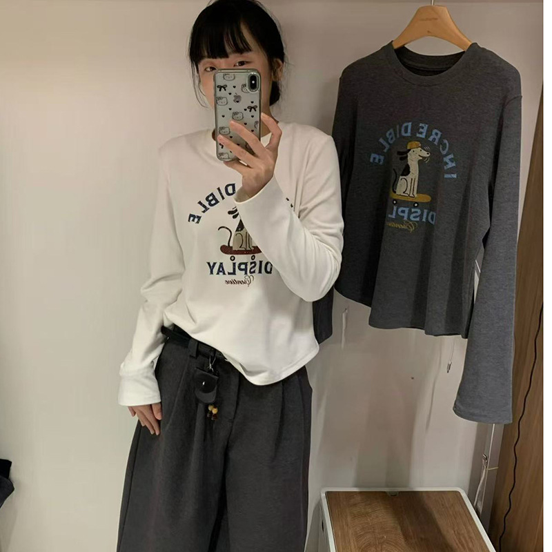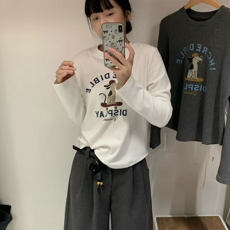 2025 가을 겨울 재미있는 알파벳 강아지 프린트 긴팔 독일산 벨벳 기모 티셔츠 여성용 나이 감소 다용도 기본 상의 트렌디