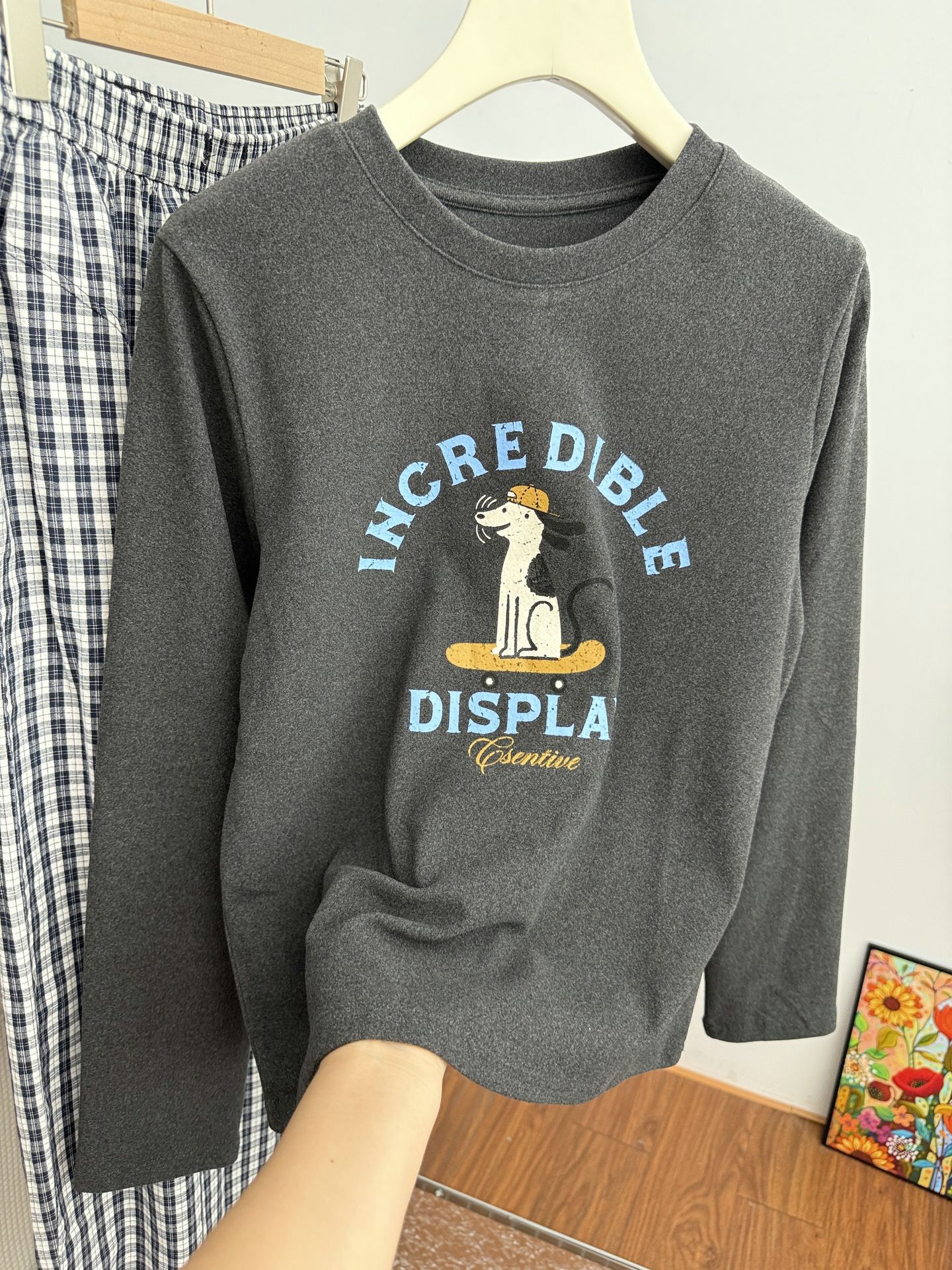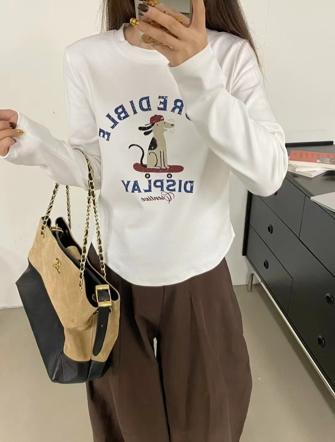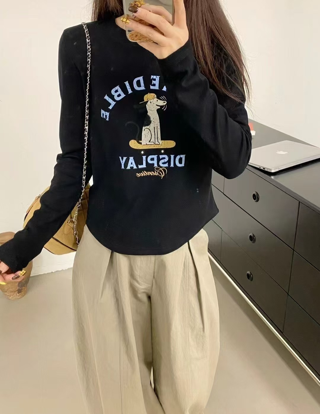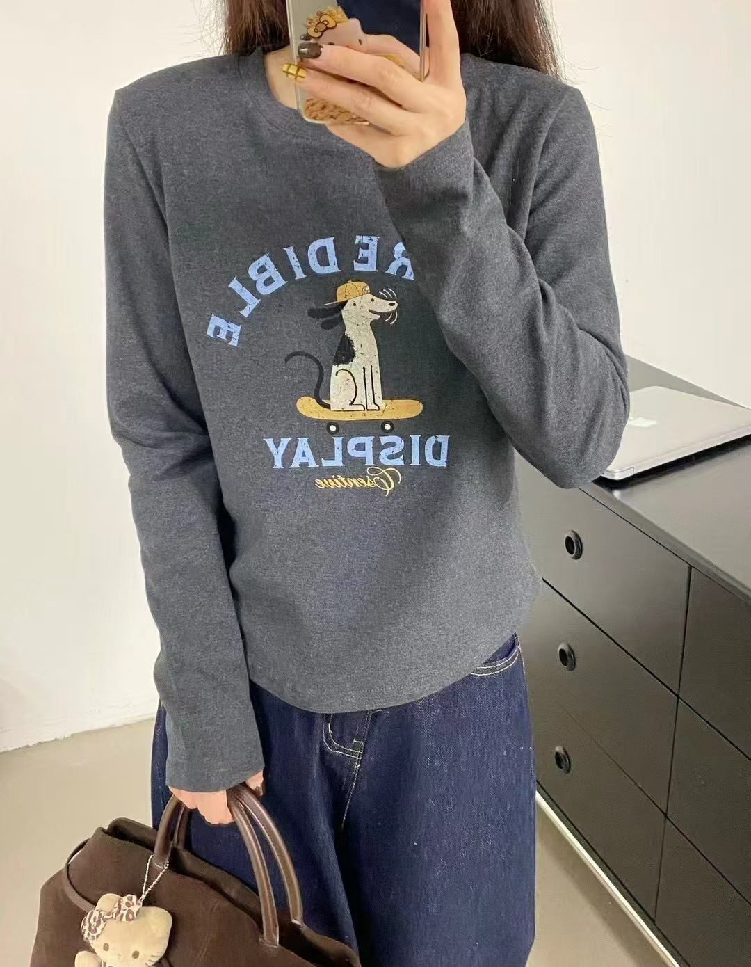 2025 가을 겨울 재미있는 알파벳 강아지 프린트 긴팔 독일산 벨벳 기모 티셔츠 여성용 나이 감소 다용도 기본 상의 트렌디
