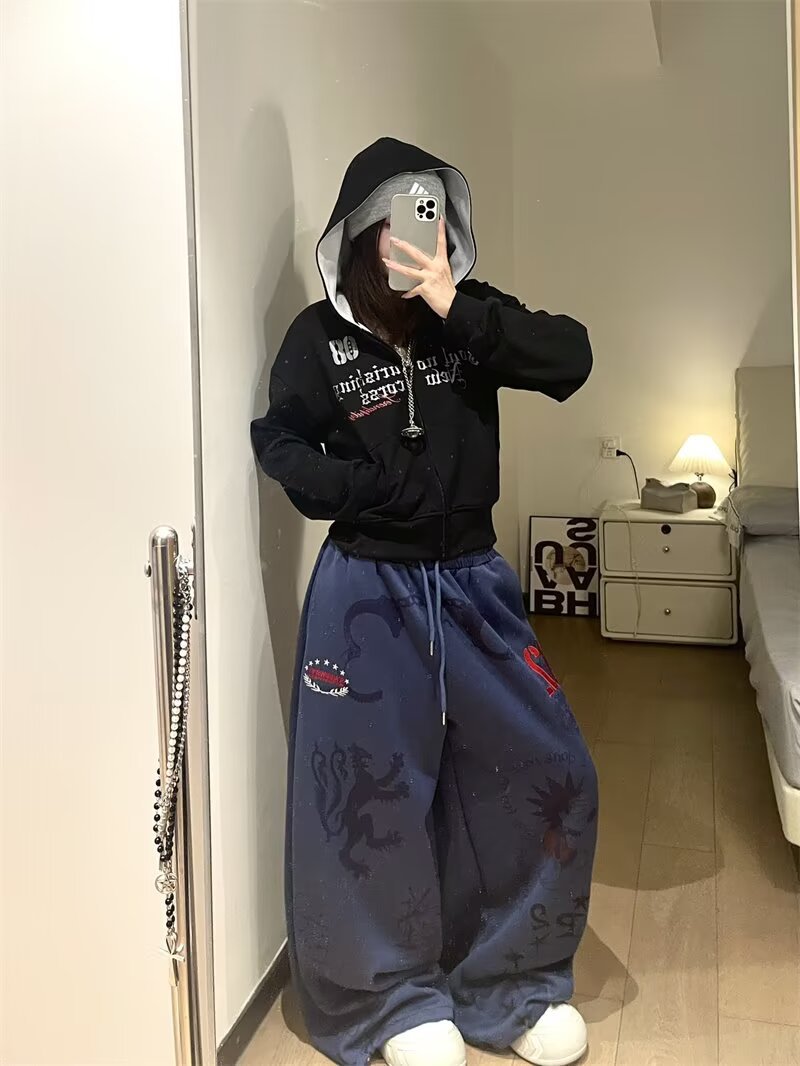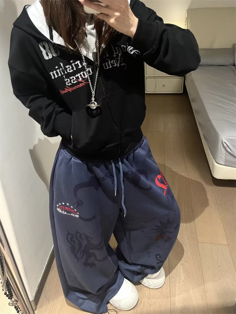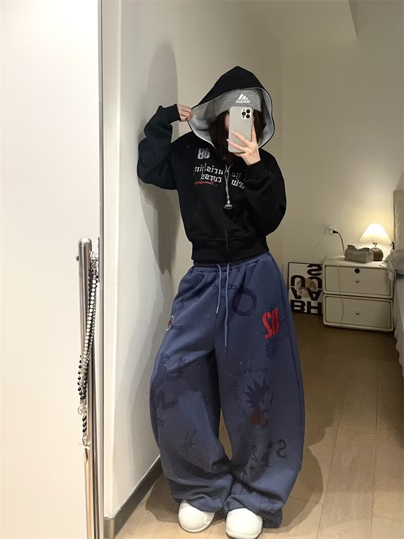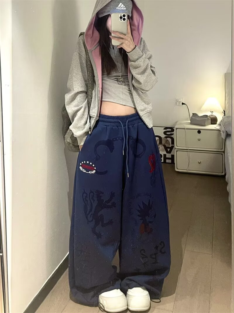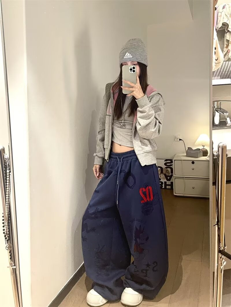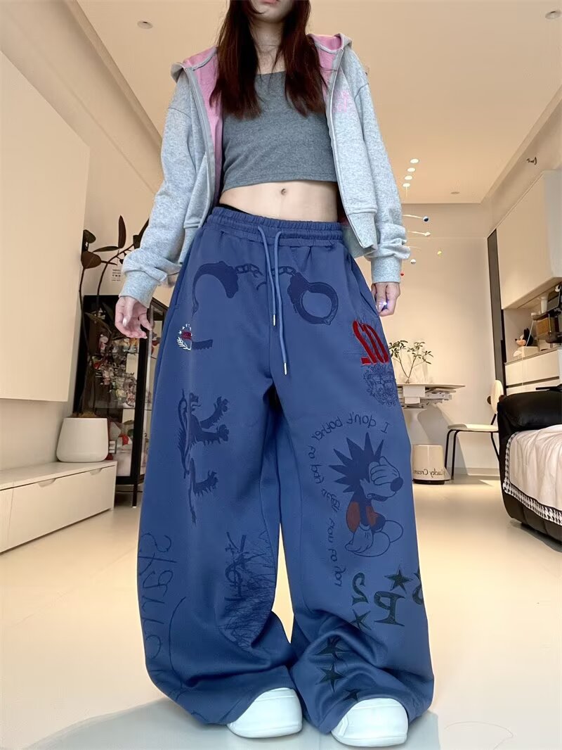 여성을위한 워시 블루 만화 와이드 레그 팬츠 2025 가을, 겨울 레트로 하이 웨이스트 슬림 스트레이트 바지 캐주얼 바지