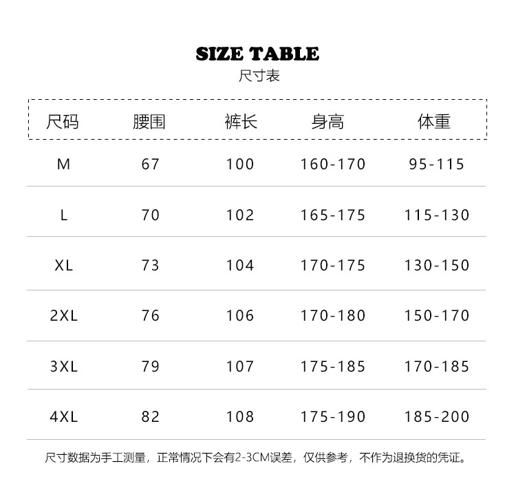 | 颜色 | 深咖, 黑色, 深咖加绒, 黑色加绒, 黑色+深咖【2件装 更优惠】, 黑色加绒+深咖加绒【2件装 更优惠】 | 尺码 | M(95-115)斤, L(115-130)斤, XL(130-150)斤, 2XL(150-170)斤, 3XL(170-185)斤, 4XL(185-200)斤 |