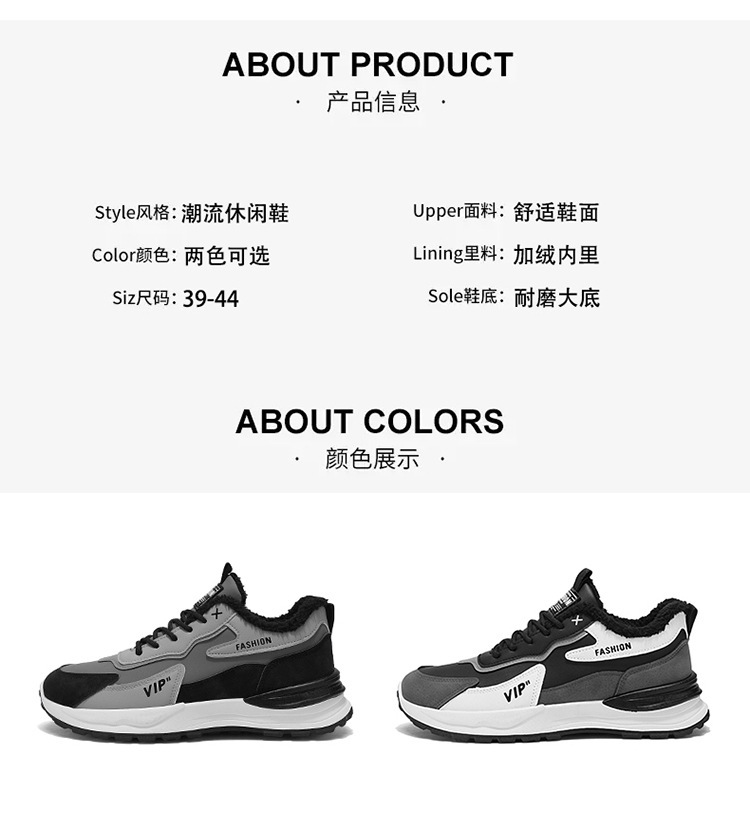 | 颜色 | M7337黑灰加绒, M7337卡其加绒, M7337白黑加绒 | 尺码 | 39, 40, 41, 42, 43, 44 |