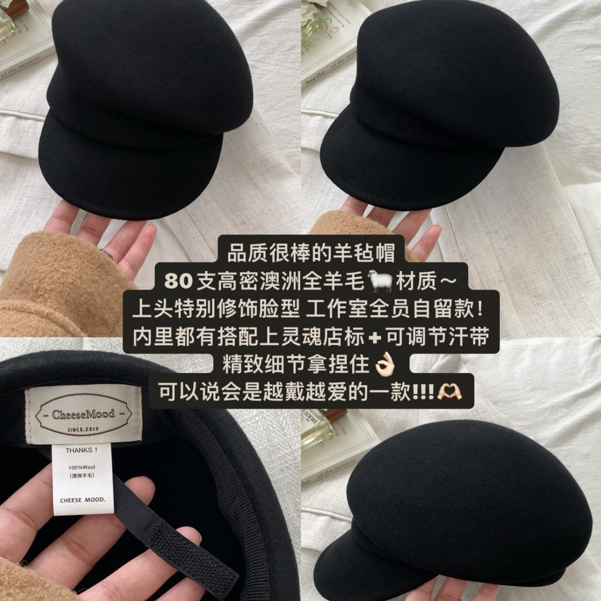 fever~ 프렌치 스타일 블랙 순모 뉴스보이 여성용 얼굴을 작아 보이게 하는 양모 펠트 모자, 고급스러운 틈새 시장 화가 모자