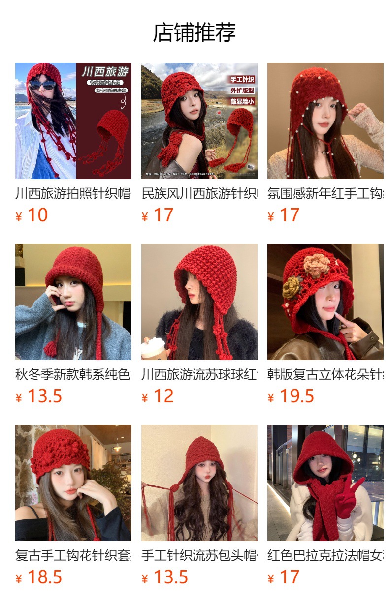 | 颜色 | 复古手勾花朵-红色, 巴拉克拉法围巾一体帽-红色, 流苏球球帽-红色, 立体团花针织帽-红色, 立体彩色花朵-红色, 珍珠流苏钩针帽-红色, 方块纹流苏-红色, 麻花流苏针织帽-红色, 纽扣贴布流苏-红色 | 功能 | 保暖, 防风 |