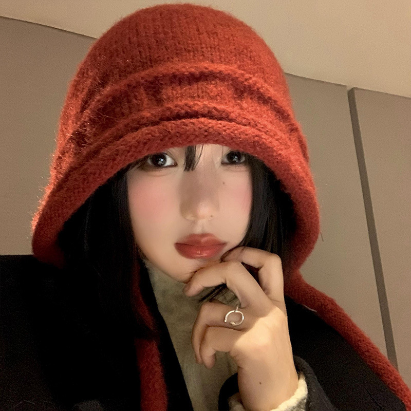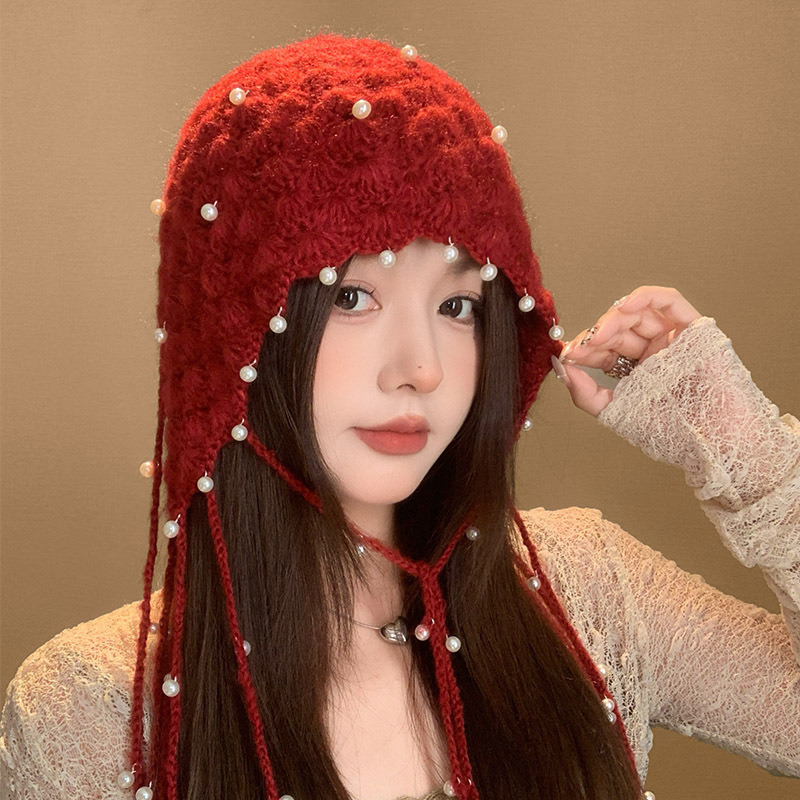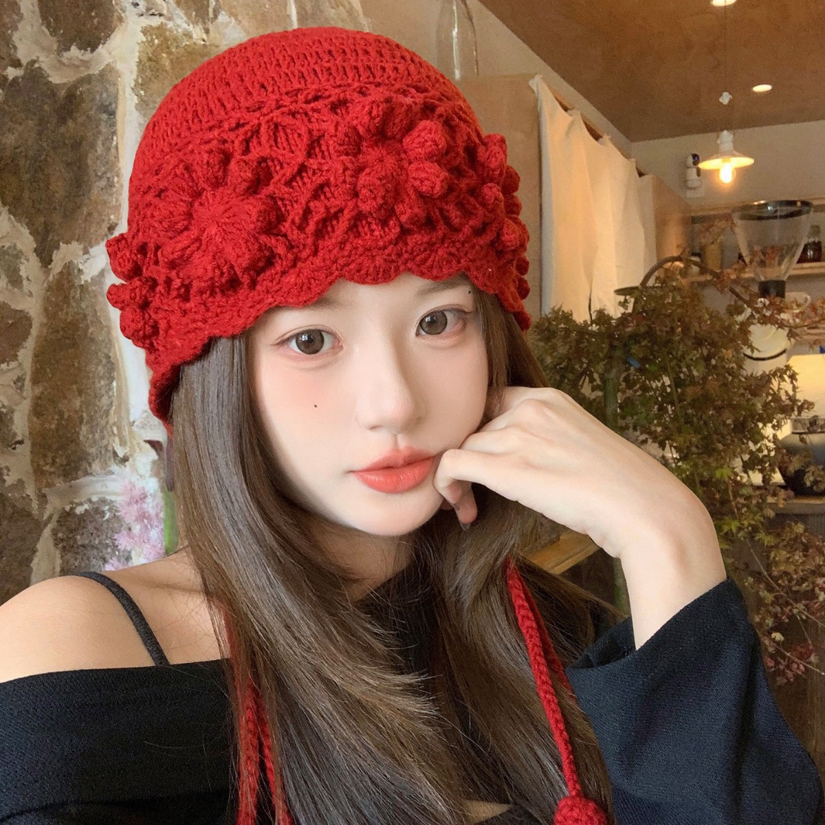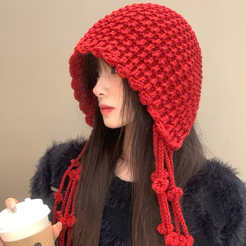 새해 빨간 모자 여성 가을, 겨울 따뜻한 양모 술 귀여운 풀오버 모자 손으로 짠 귀 보호 모자 일본 유행