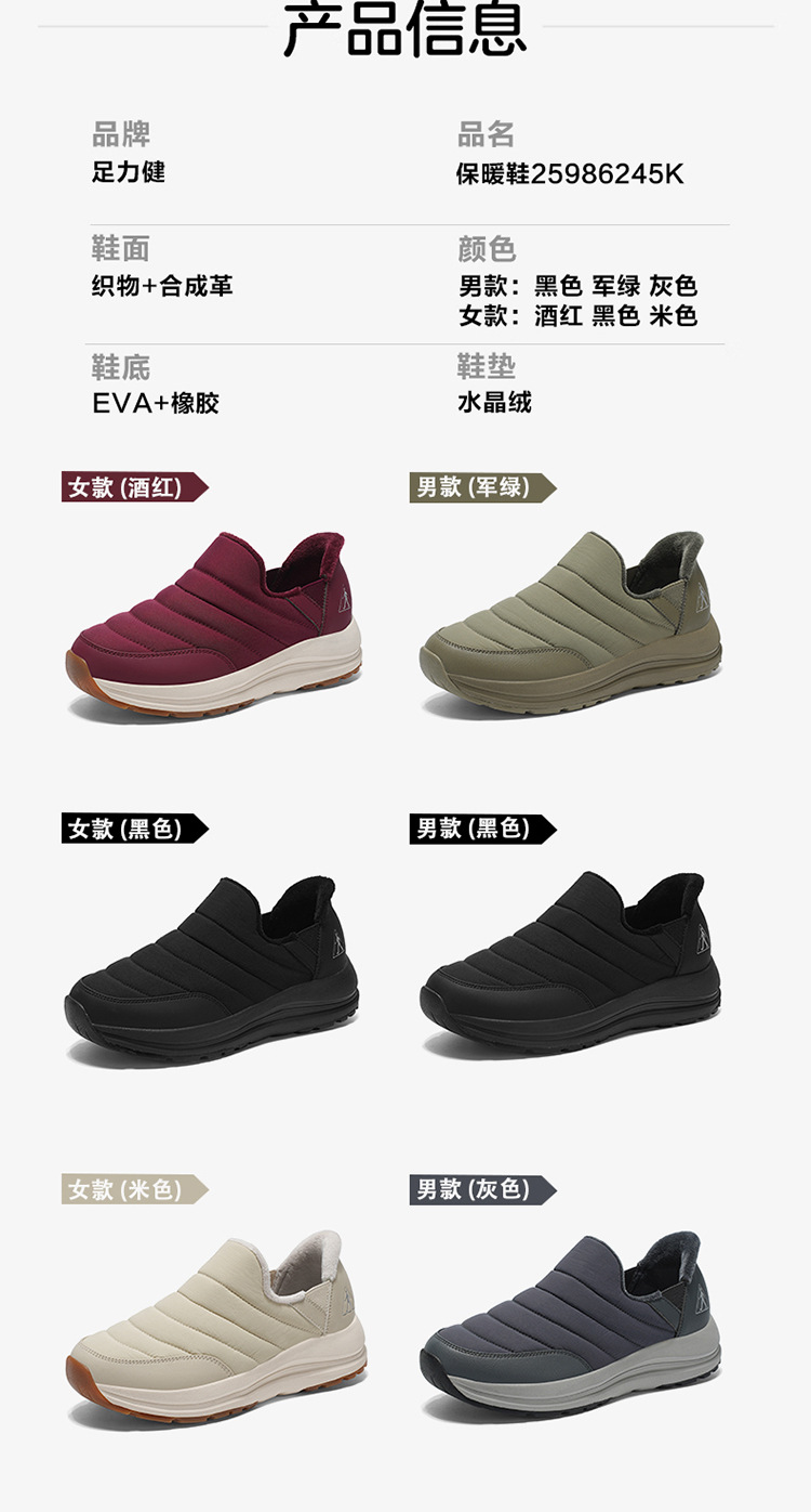 | 颜色 | 酒红女款, 米色女款, 黑色女款, 灰色男款, 军绿男款, 黑色男款 | 尺码 | 35, 36, 37, 38, 39, 40, 41, 42, 43, 44, 45 |