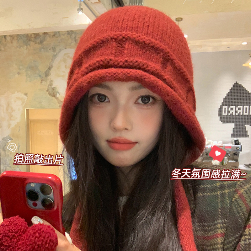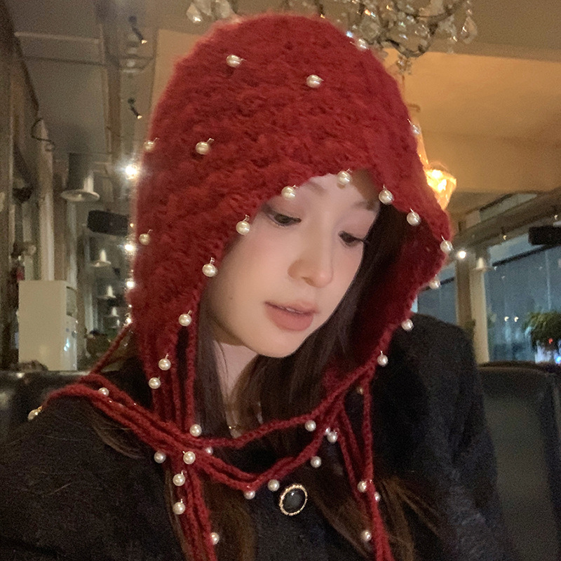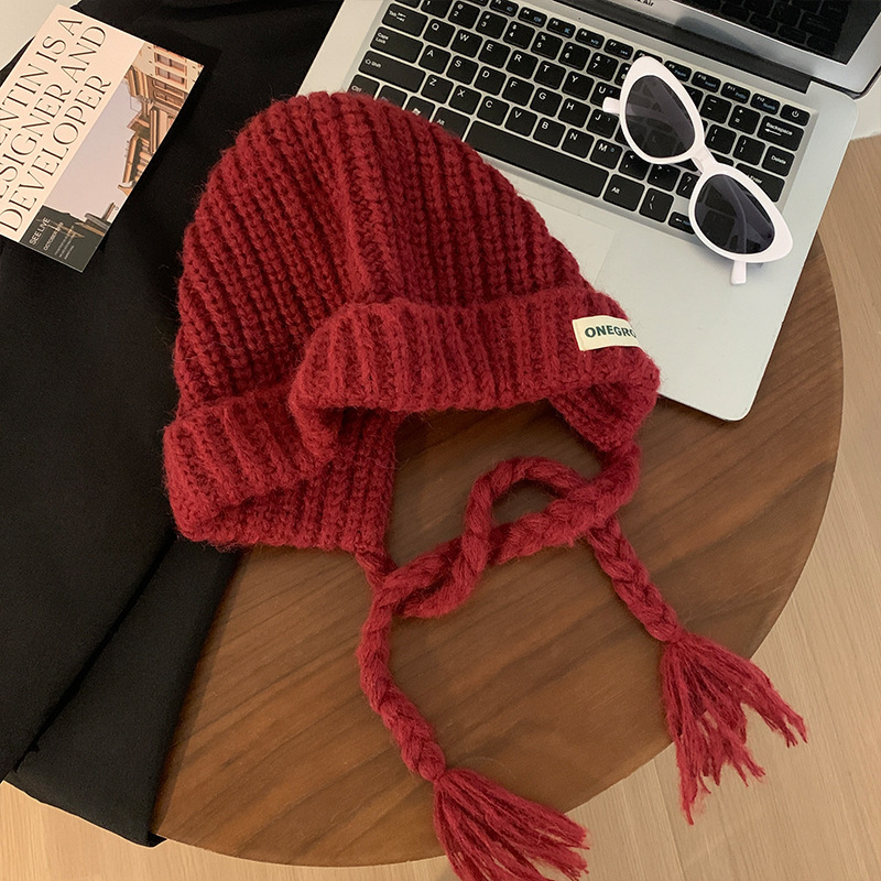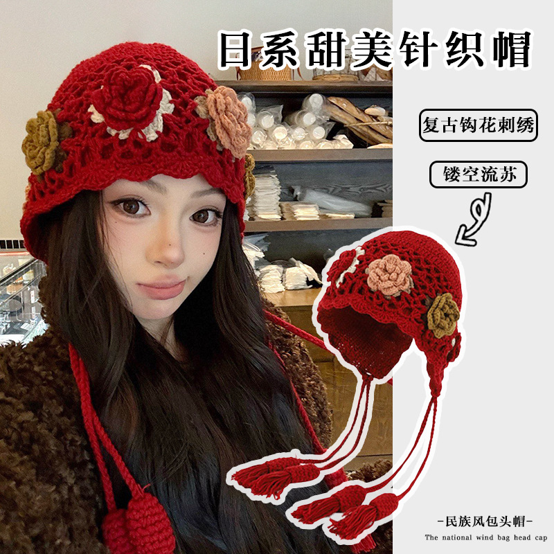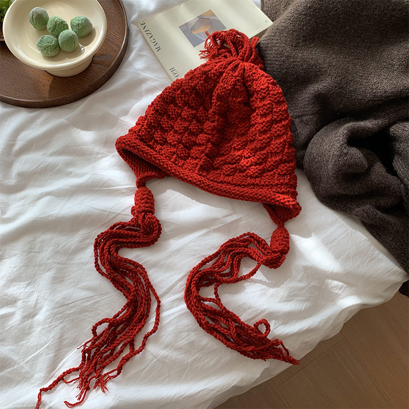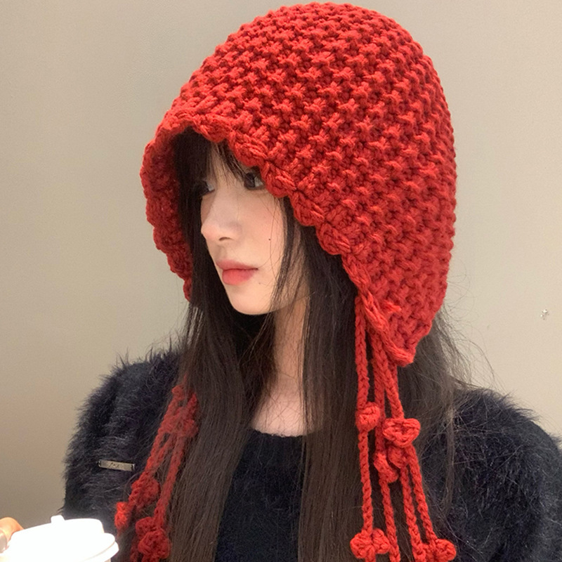 가을 겨울 여성용 새해 빨간색 술 모직 모자, 복고풍 따뜻한 귀 보호 니트 모자, 방한 및 얼굴 노출 방지 작은 풀오버 모자