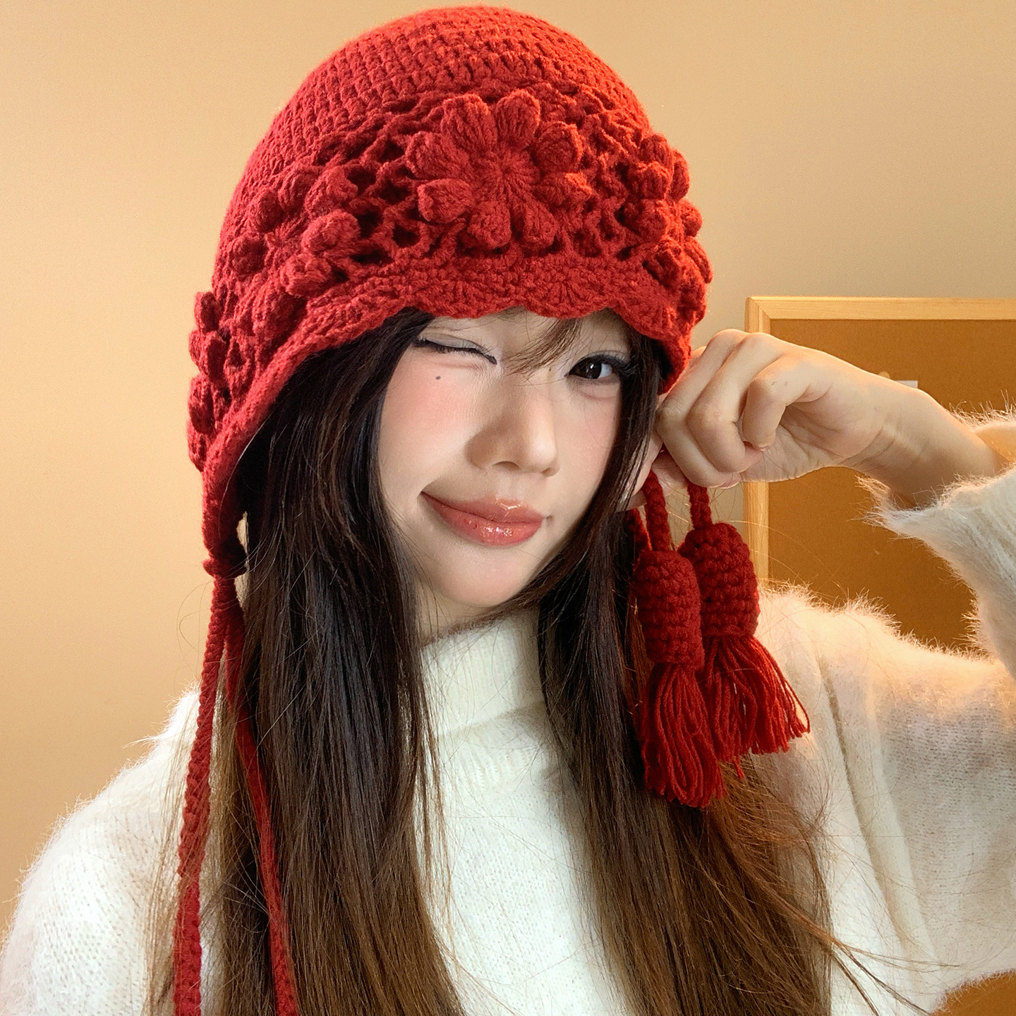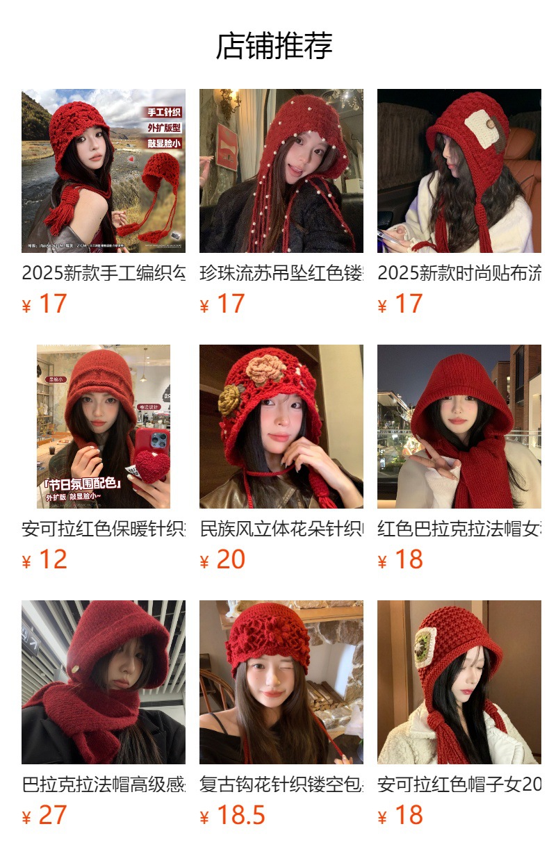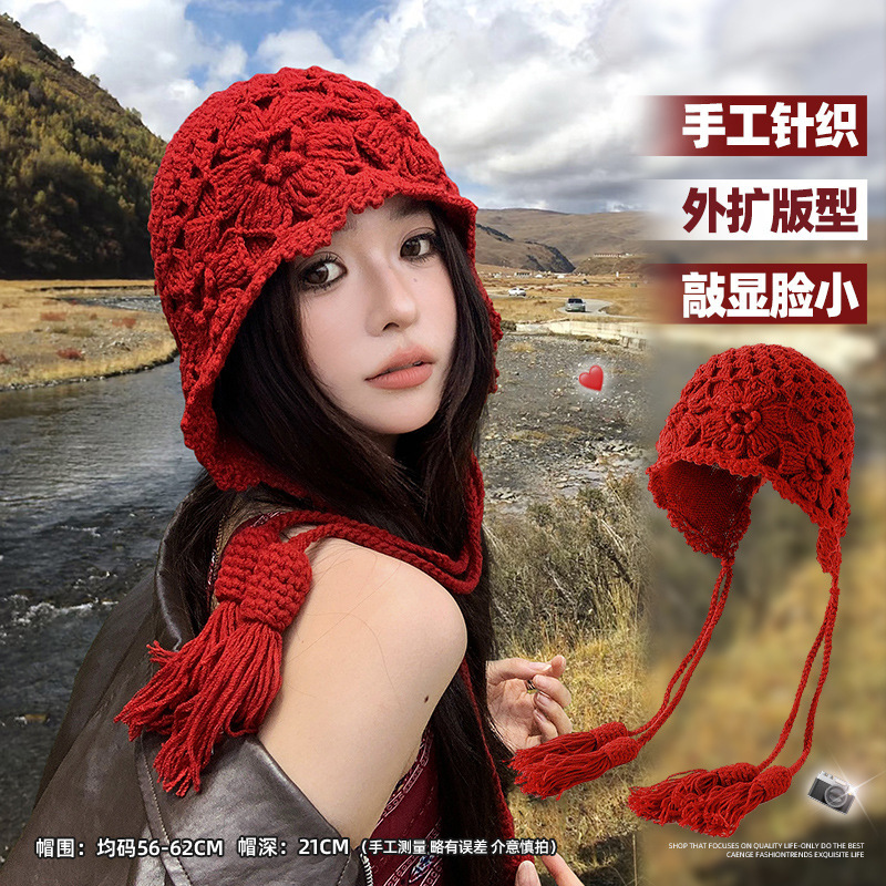| 颜色 | 纽扣贴布护耳帽-红色, 川西旅游流苏帽-红色, 球球流苏护耳帽-红色, 流苏珍珠钩针帽-红色, 彩色花朵针织帽-红色, 钩针花流苏帽-红色, 压纹流苏针织帽-红色, 连帽围巾套装-红色, 纽扣围巾一体帽-红色, 立体花朵毛线帽-红色, 花朵钩针流苏帽-红色, 方块压纹毛线帽-红色 | 功能 | 保暖, 防风 |