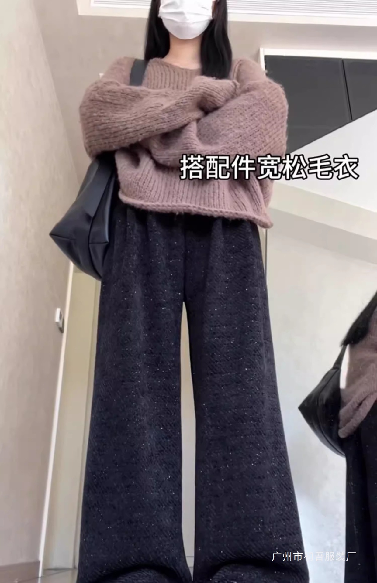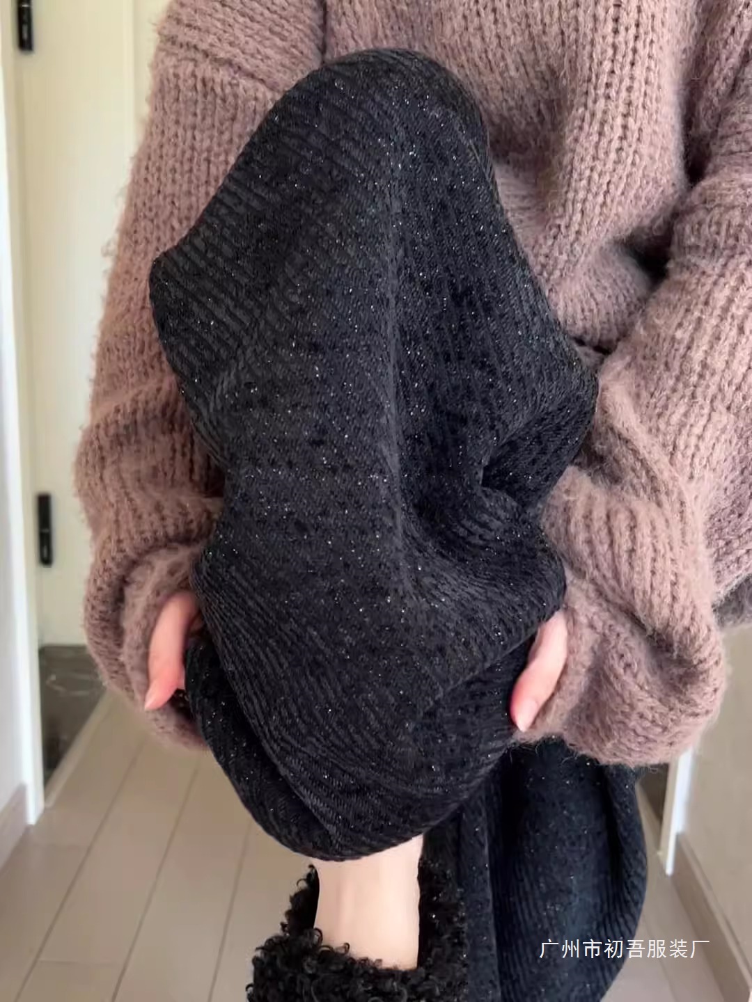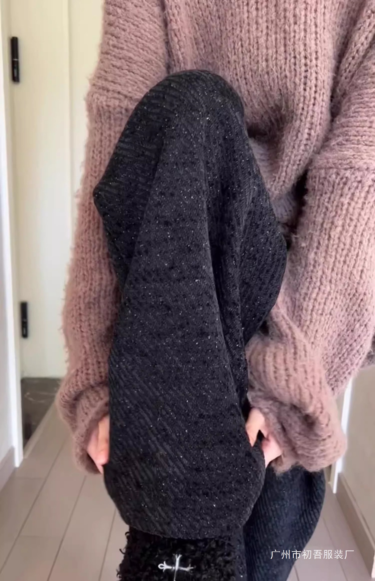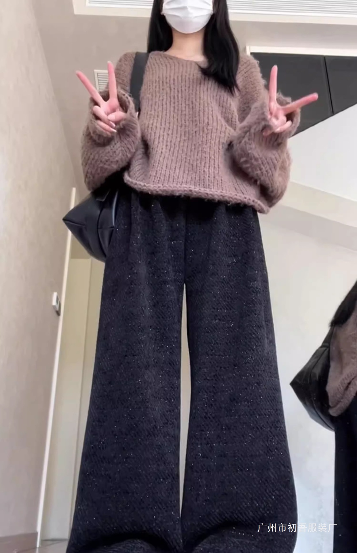 가을 겨울 여성용 고급 블랙 파인 글리터 와이드 팬츠, 벨벳과 두꺼운 게으른 스타일, 부드럽고 왁시한 드레이프, 루즈한 스트레이트 팬츠