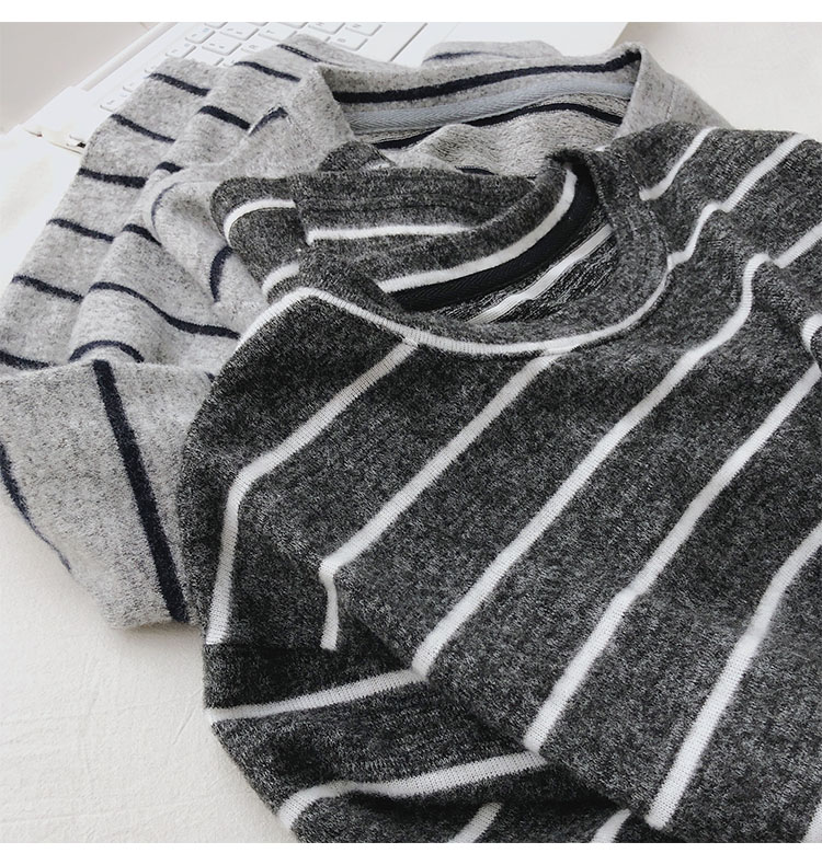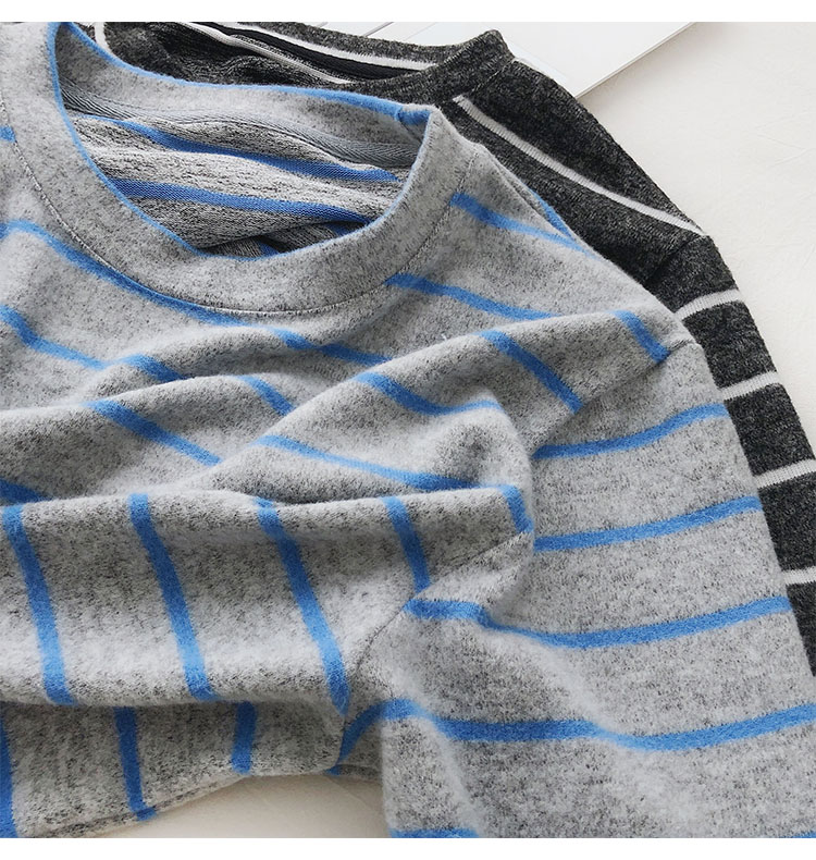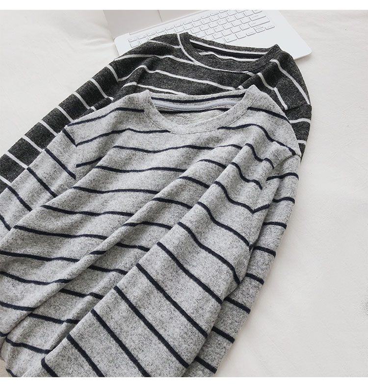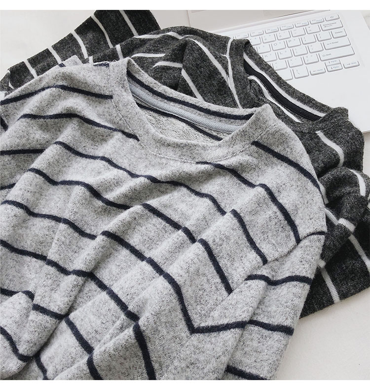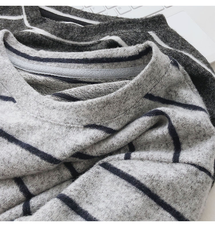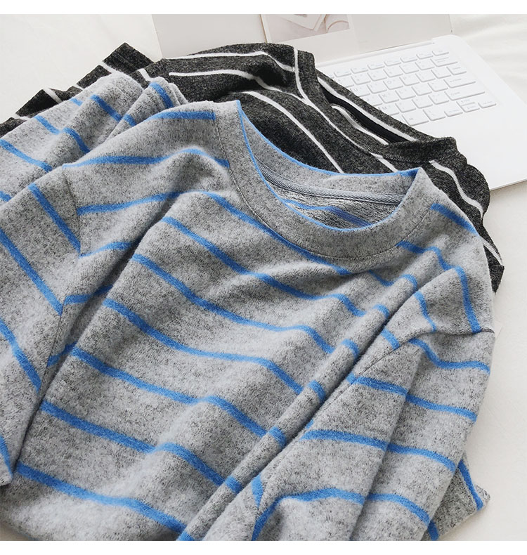 가을 겨울 여성용 부드러운 캐시미어 느낌의 플러시 스트라이프 니트 바닥 셔츠 캐주얼 루즈한 두꺼운 긴팔 티셔츠