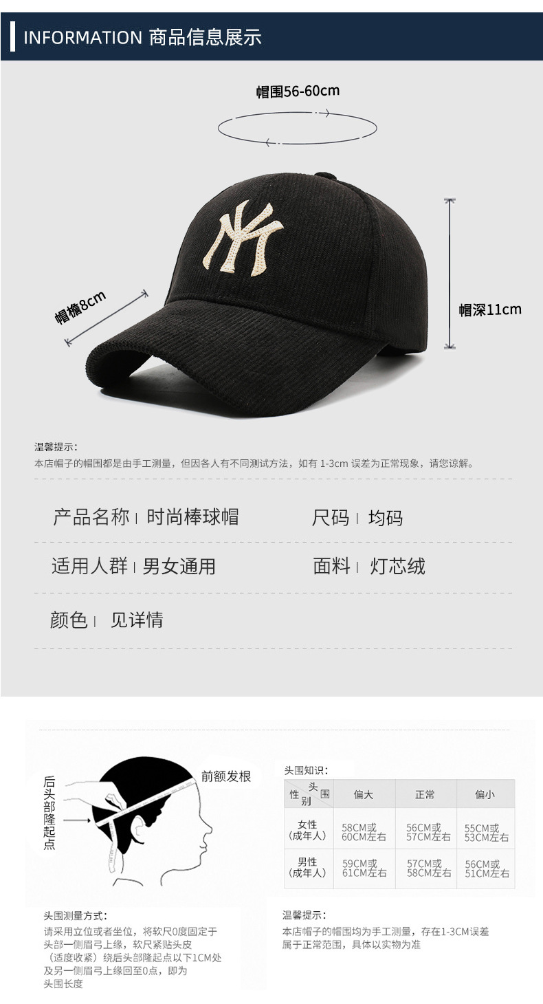 秋冬新款帽子男女士户外防风保暖棒球帽细条绒遮阳防晒鸭舌帽网红