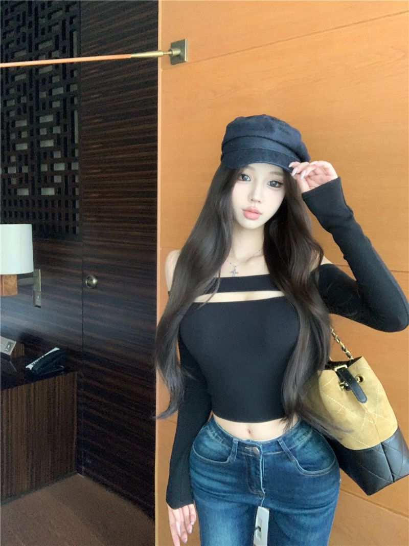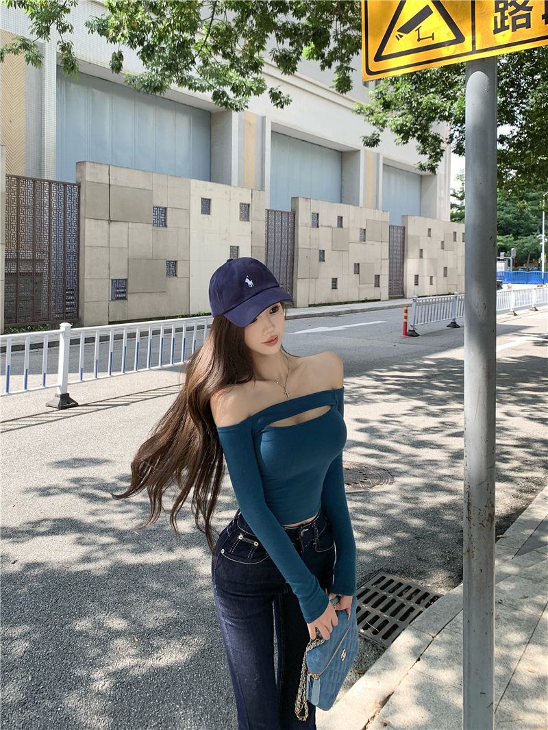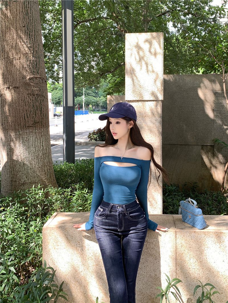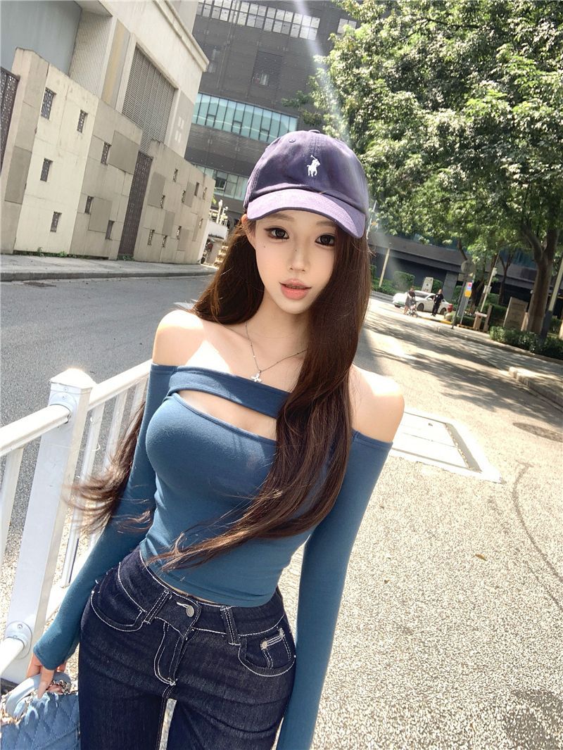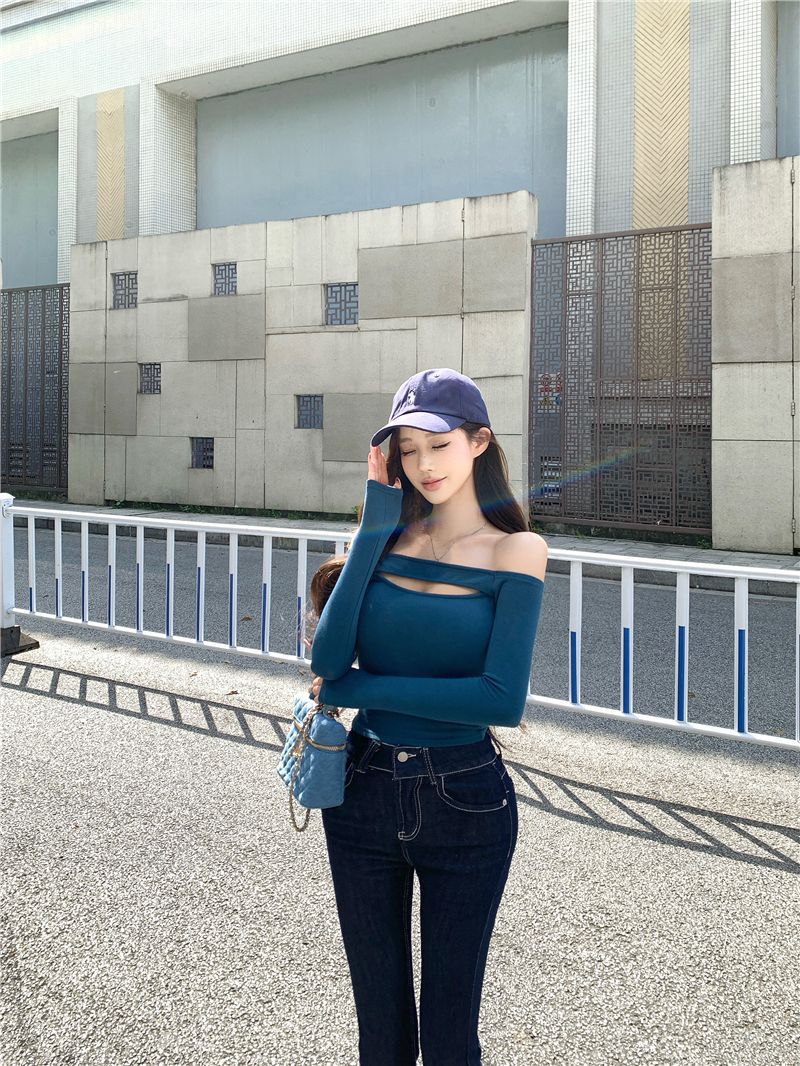 가을 순수한 욕망 스타일 슬림핏 이너 타이트 웨이스트 밑단 셔츠 탑 여성용 원 숄더 중공 블루 긴팔 티셔츠