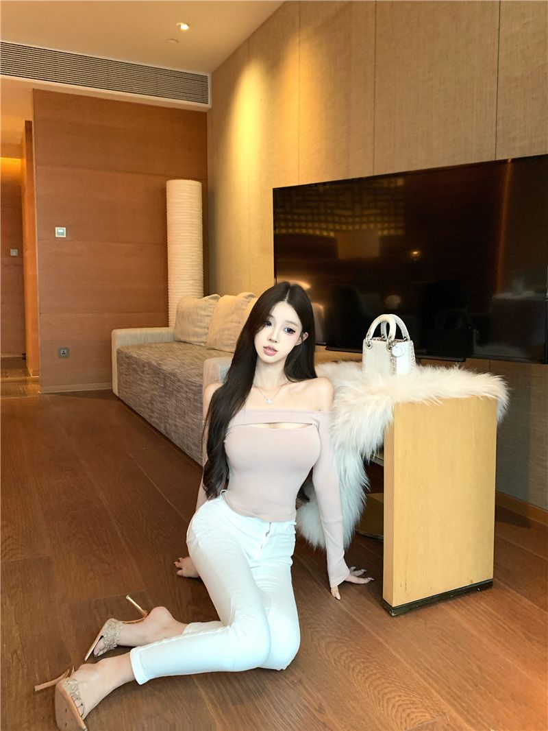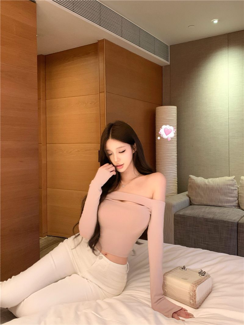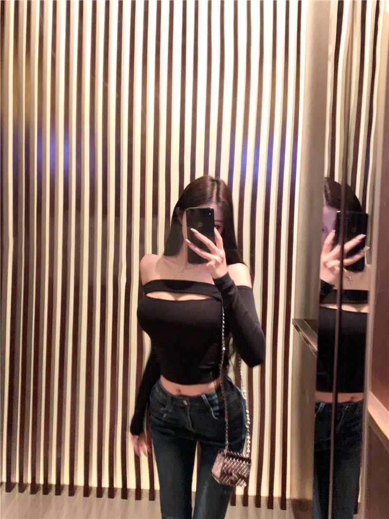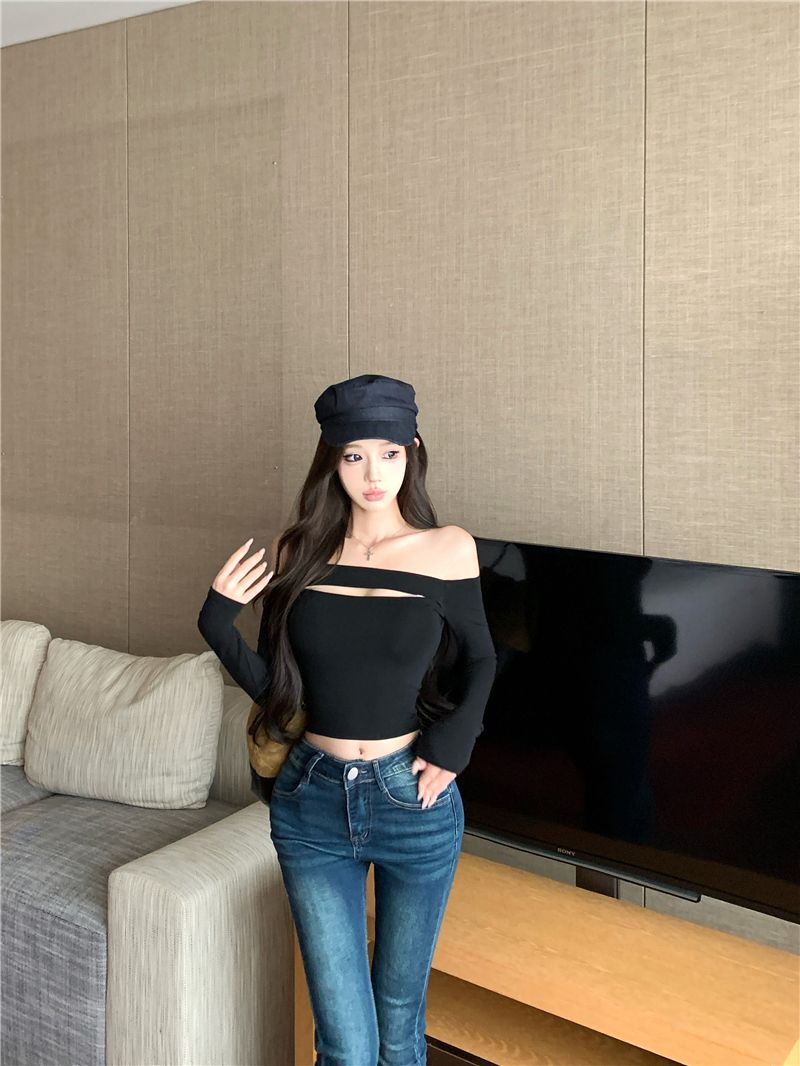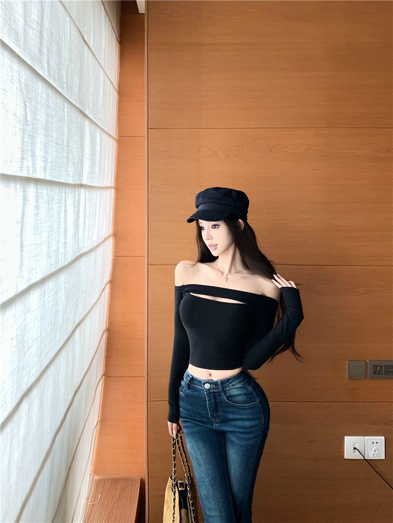 가을 순수한 욕망 스타일 슬림핏 이너 타이트 웨이스트 밑단 셔츠 탑 여성용 원 숄더 중공 블루 긴팔 티셔츠