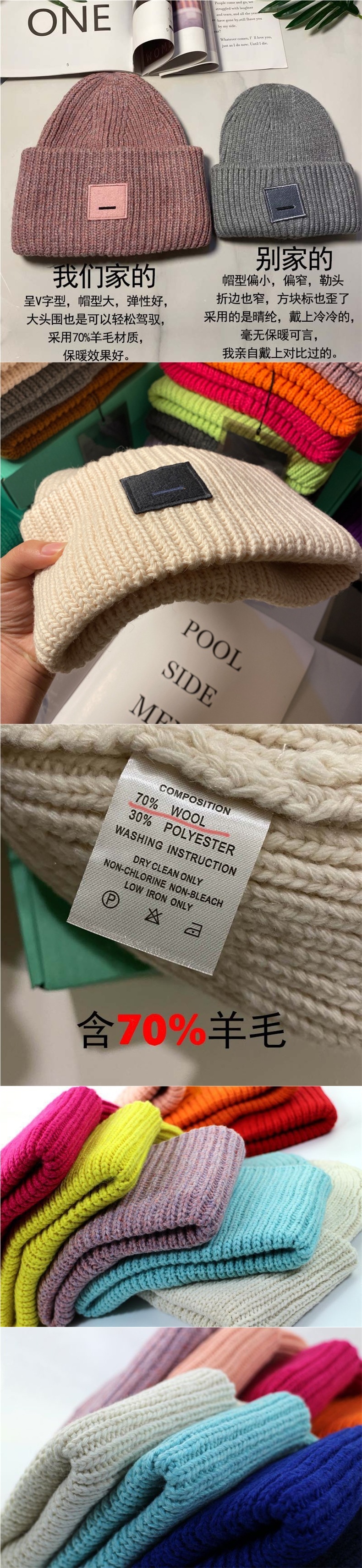 | 帽檐款式 | 无檐 | 颜色 | 混粉色, 果绿, 湖蓝色, 黑色, 香芋紫, 中灰色, 米白色, 黄色, 亮橙色, 圣诞红, 玫红, 紫色, 深灰色, 新色 米色+黑方块, 新色 焦糖色, 粉色, 蓝色, 荧光绿, 新色 浅麻灰, 新色 矿物蓝, 新色 米白白标, 酒红色, 藏青色, 新色 藏蓝+粉色方块, 红色黑标, 橙色米标, 蓝色橘标, 米色棕标 |