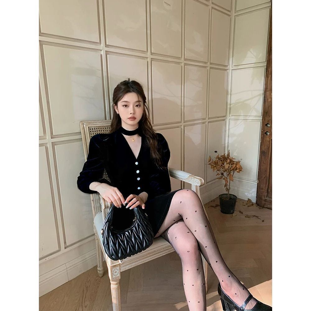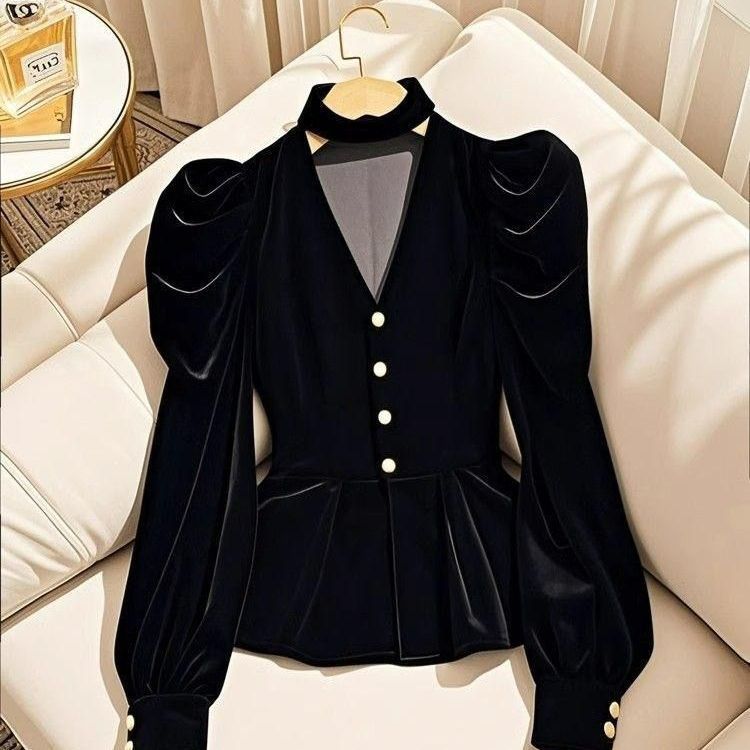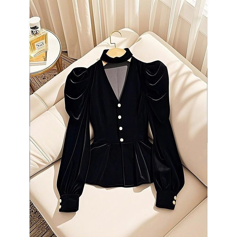Xiaoxiangfeng 블랙 벨벳 긴팔 허리 슬리밍 셔츠 여성 2025 가을 새로운 프랑스 스타일 독특하고 아름다운 탑