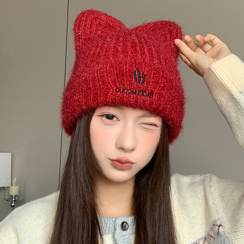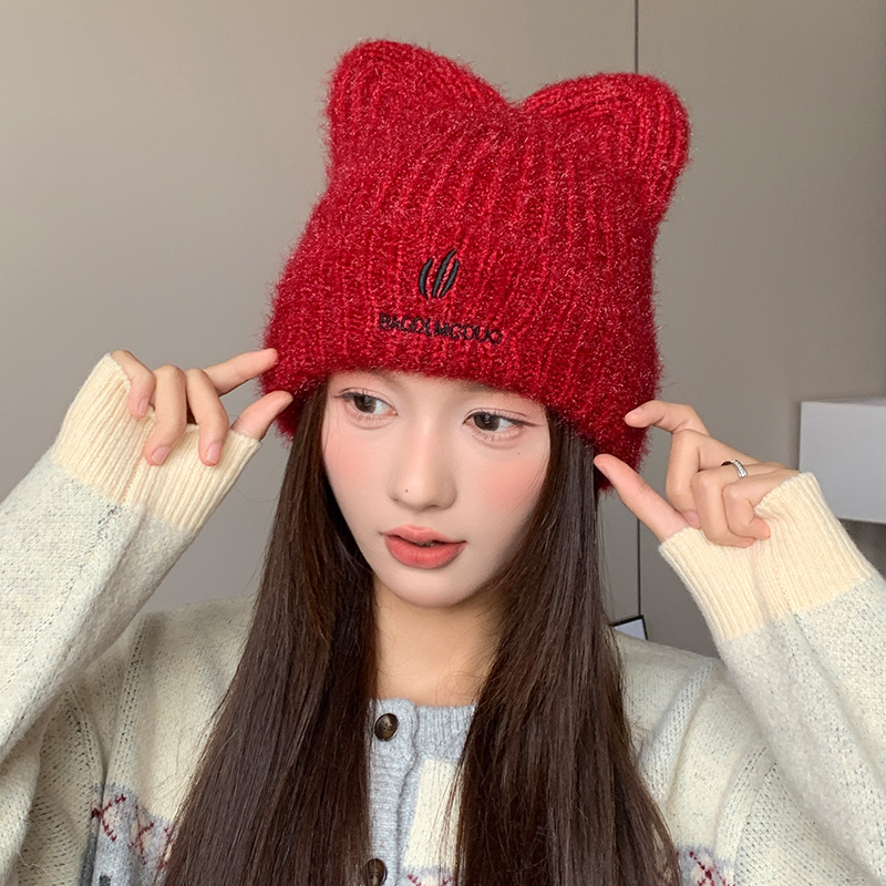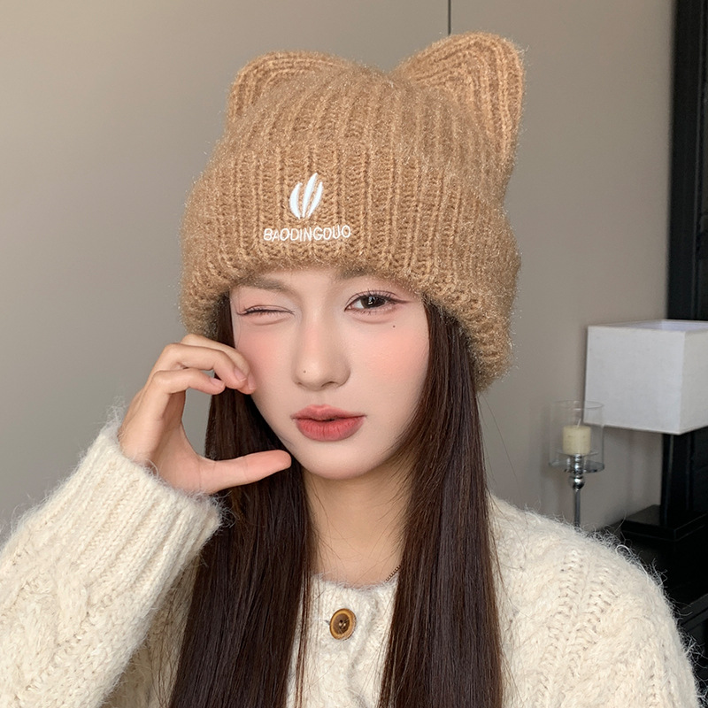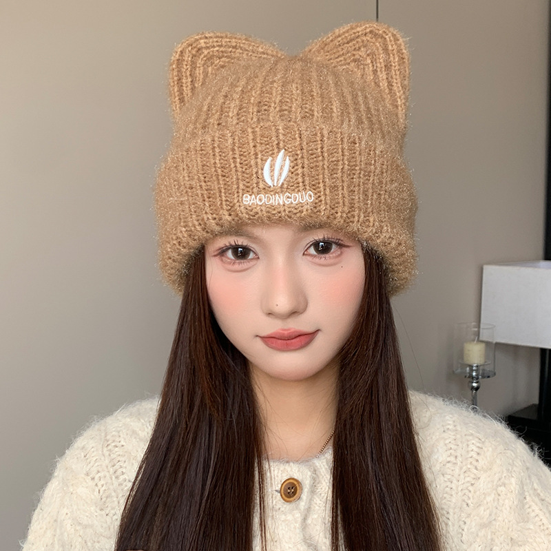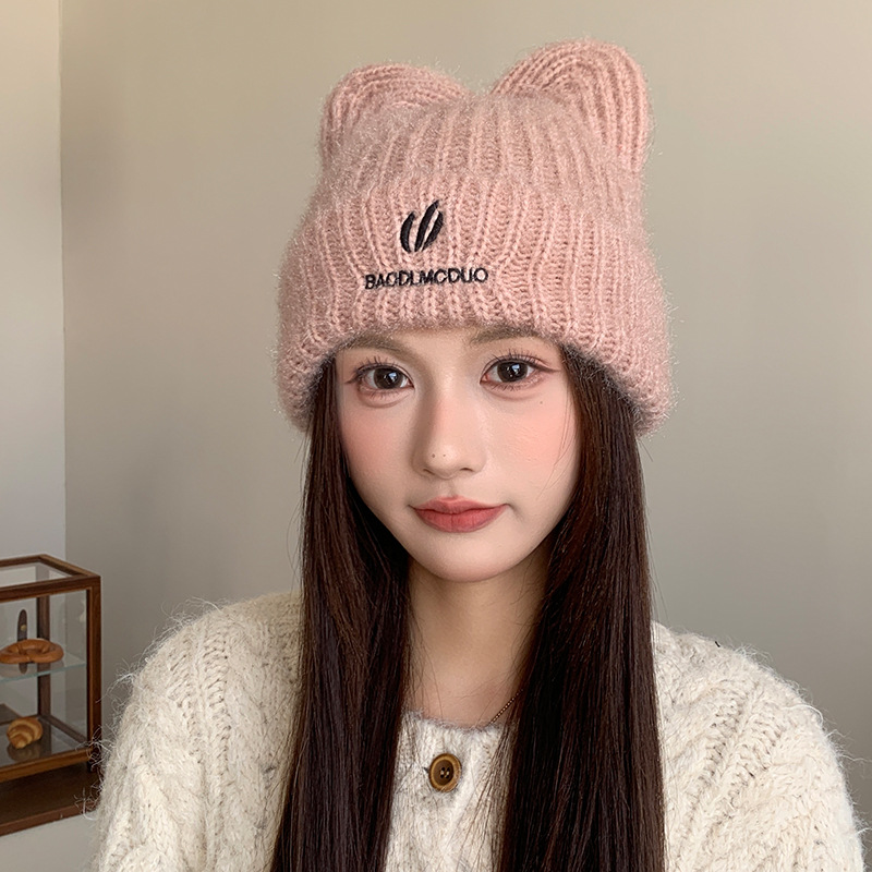 달콤하고 귀여운 고양이 귀 모직 모자, 가을 겨울 따뜻한 귀 보호 니트 모자, 일본식 얼굴이 보이는 작은 풀오버 모자, 여성용