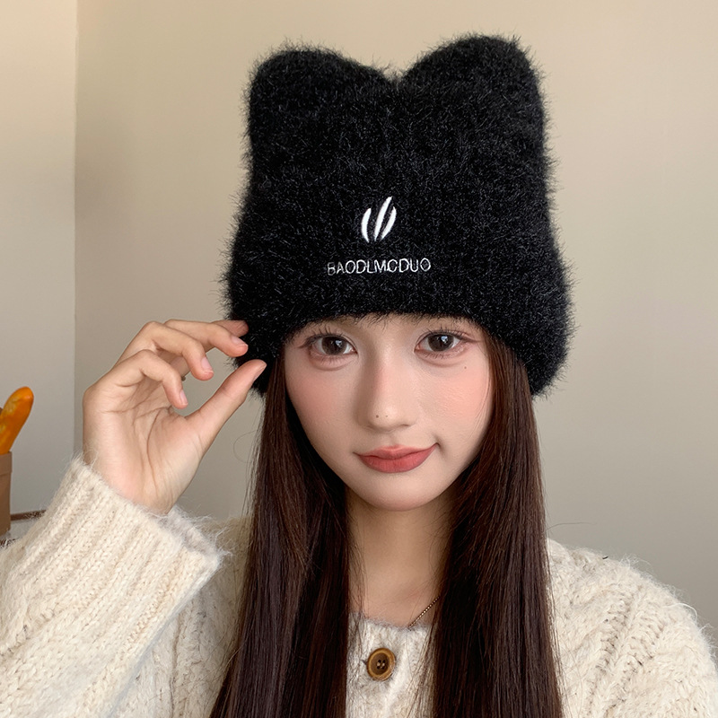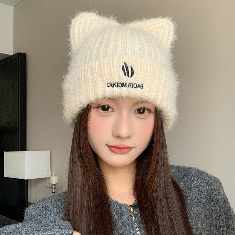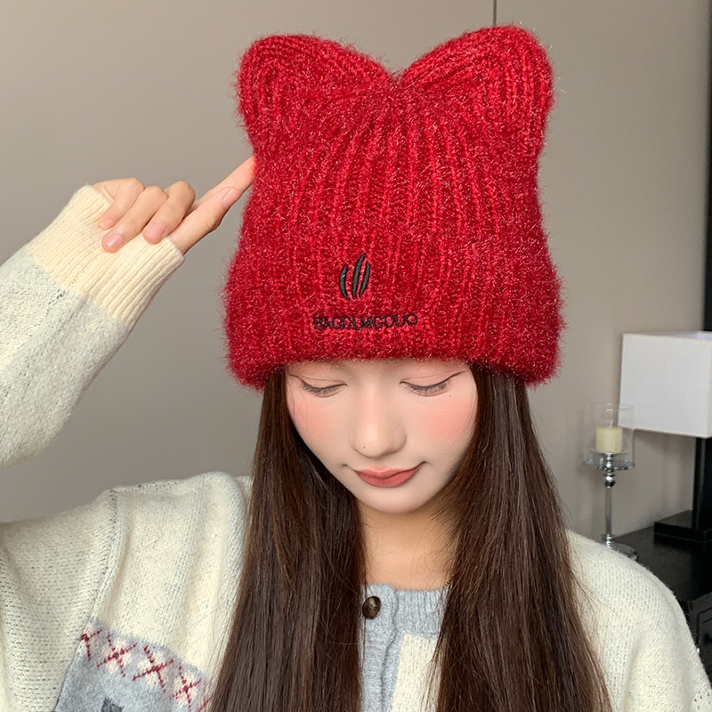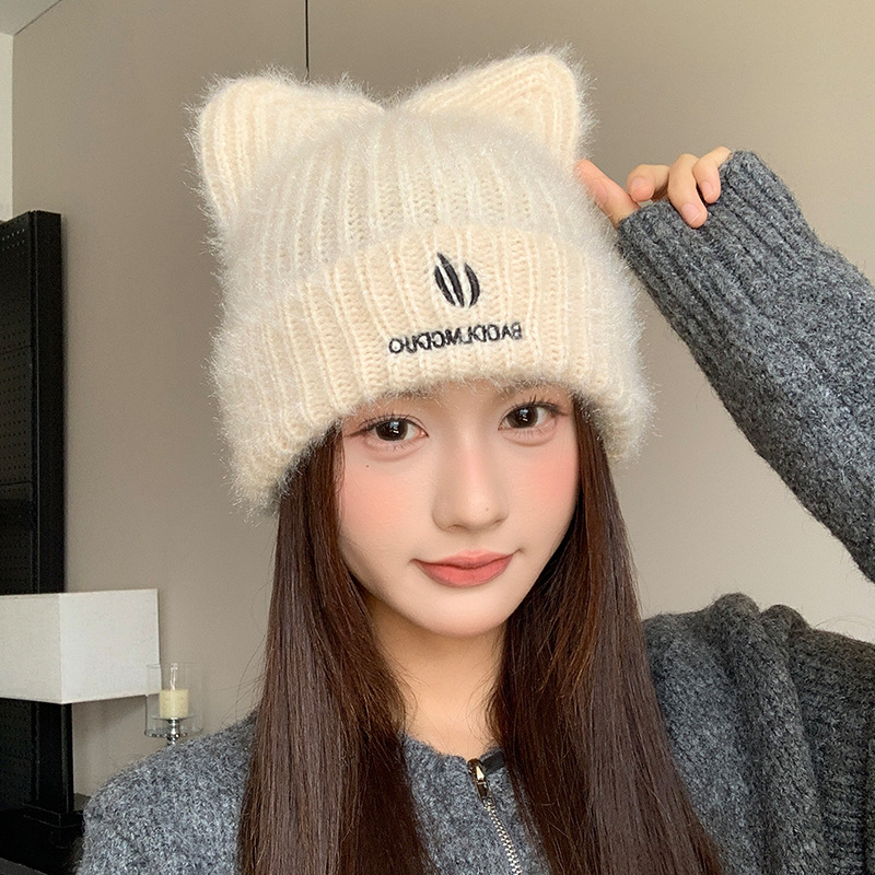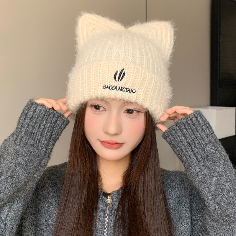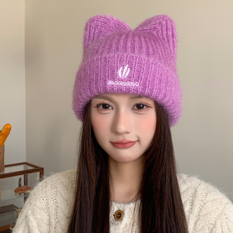 달콤하고 귀여운 고양이 귀 모직 모자, 가을 겨울 따뜻한 귀 보호 니트 모자, 일본식 얼굴이 보이는 작은 풀오버 모자, 여성용