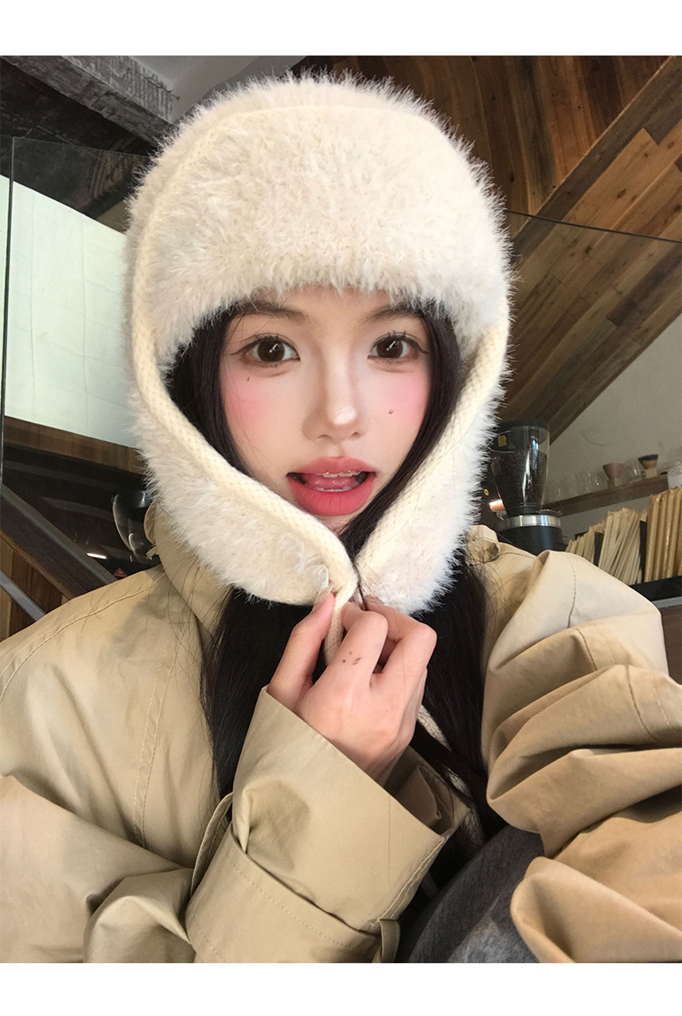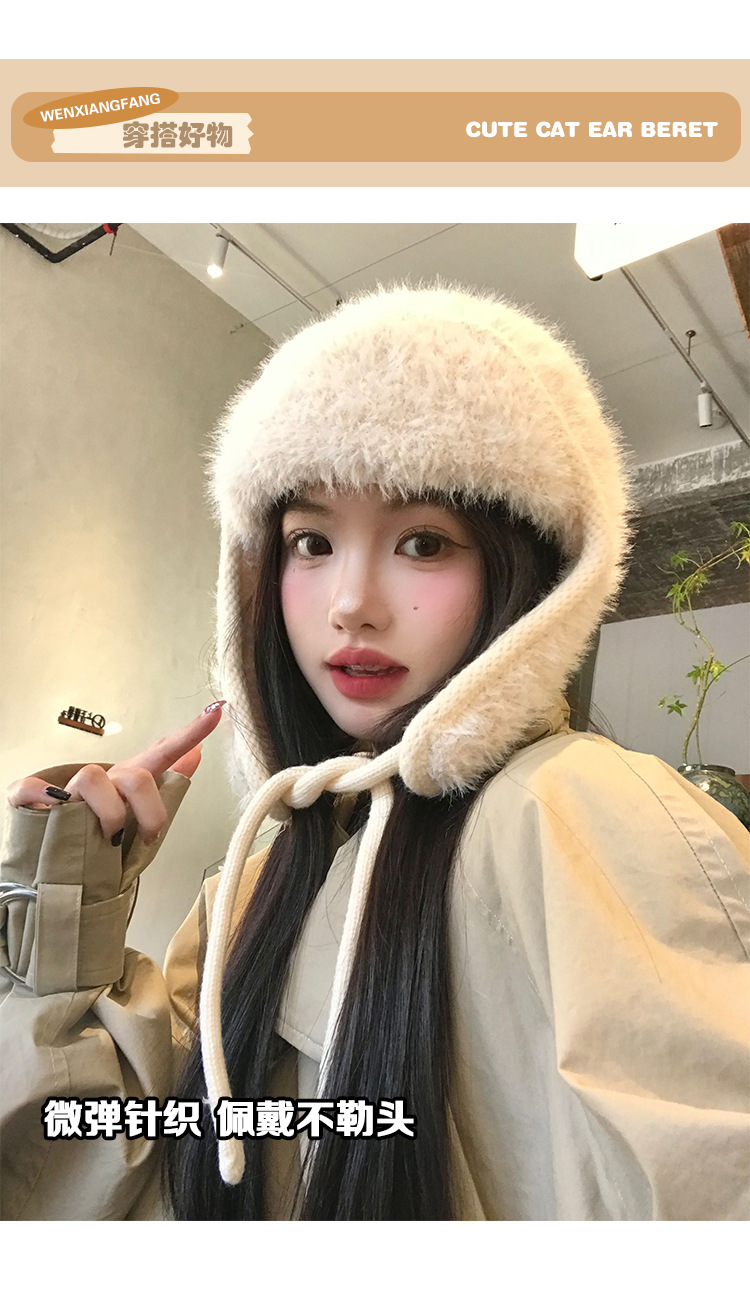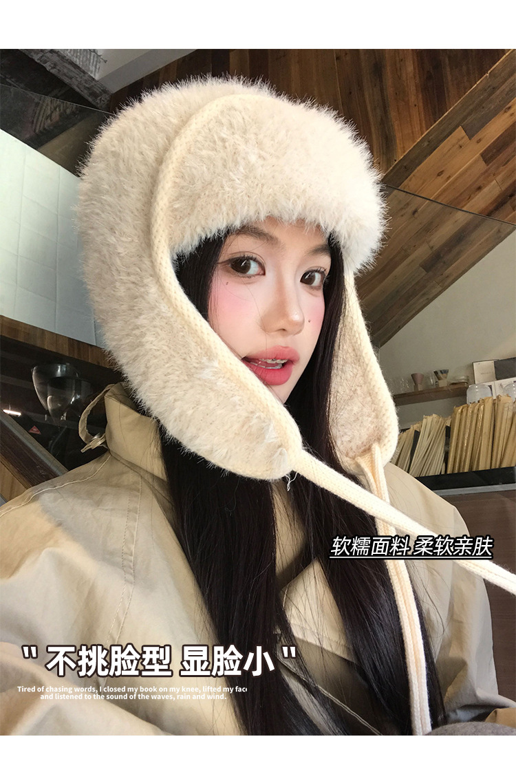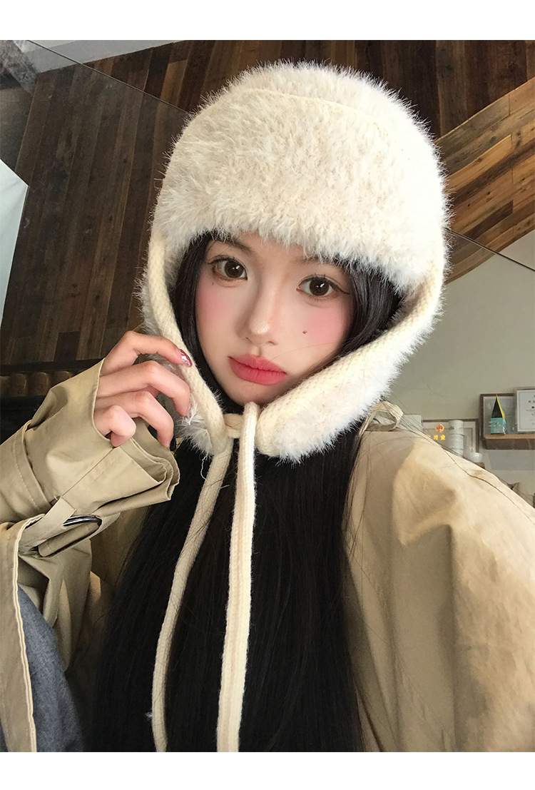 가을 겨울 여성용 흰색 플러시 니트 귀 보호 모자, 얼굴이 보이는 따뜻하고 방한 레이펑 모자, 작은 머리 둘레 모직 모자