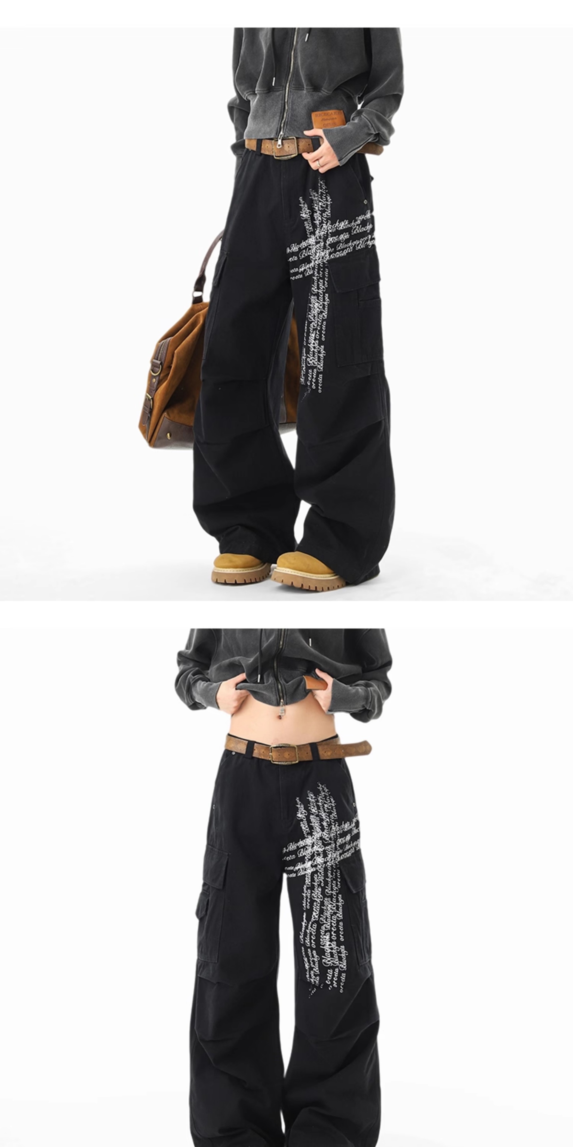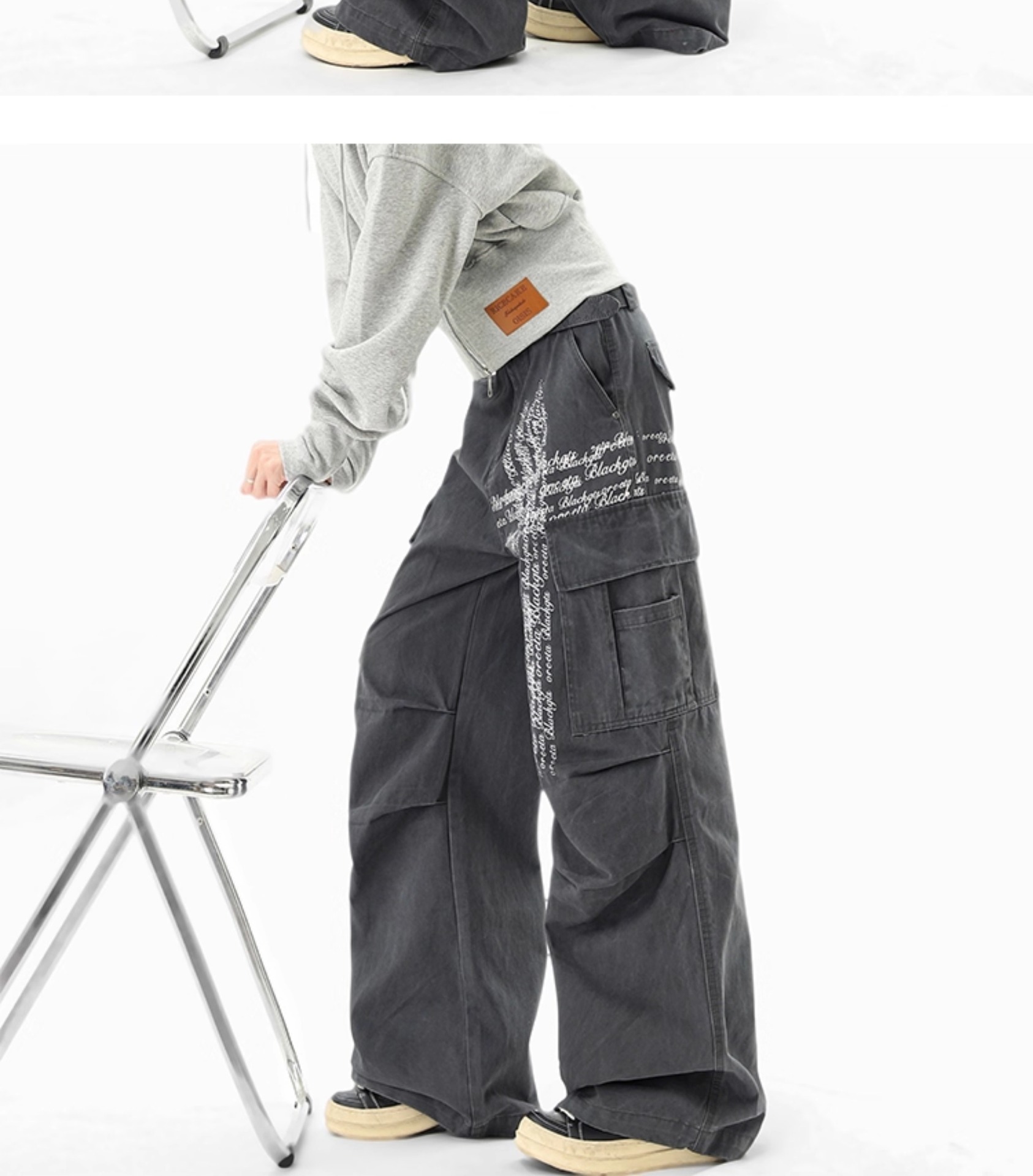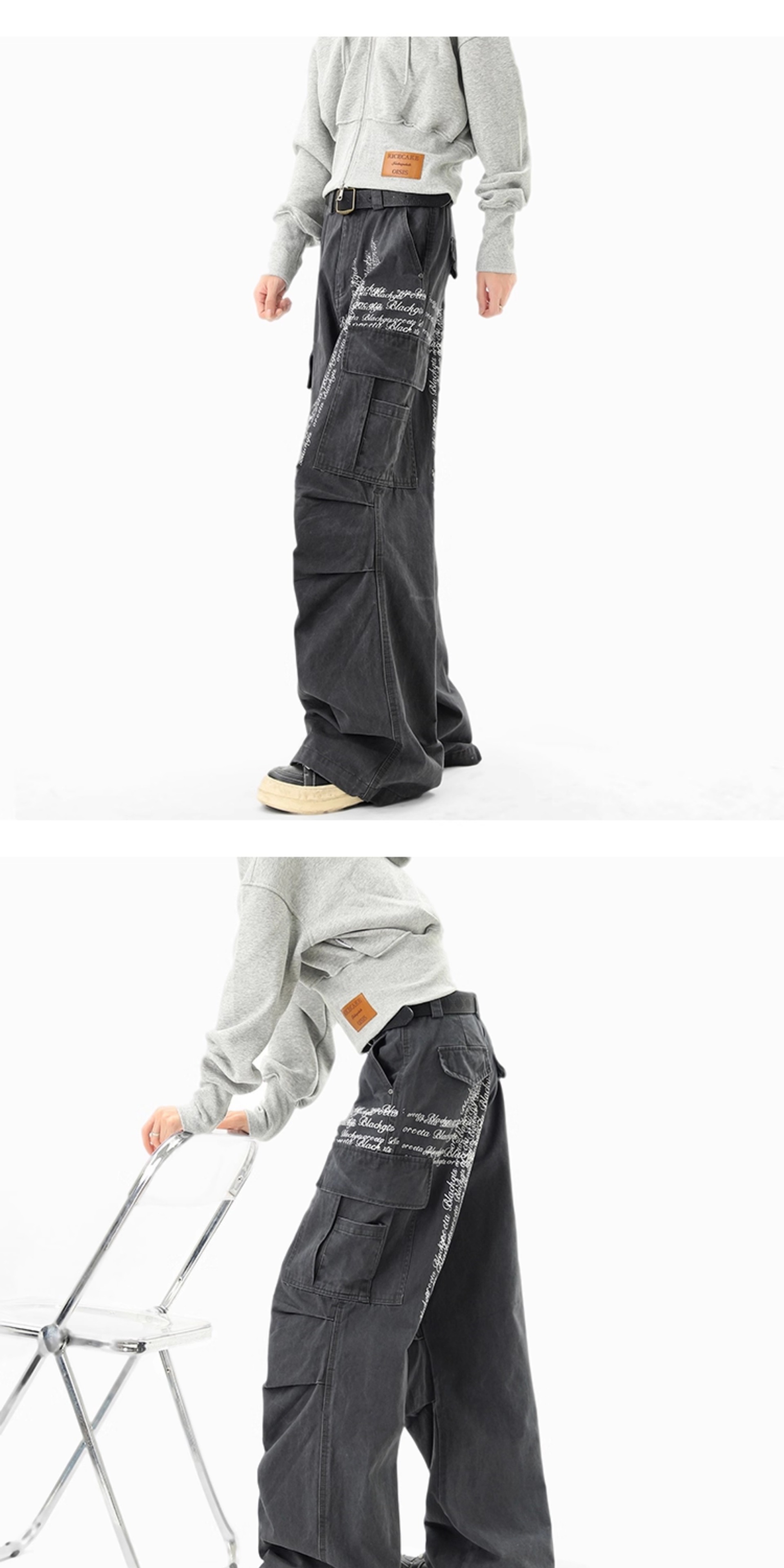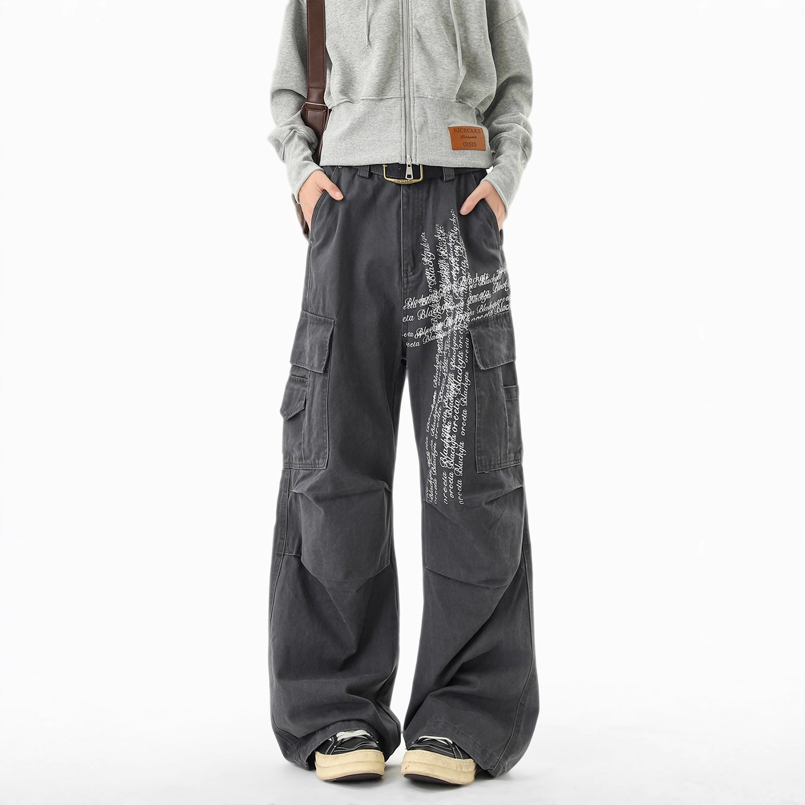 가을에 남성과 여성을 위한 아메리칸 스트리트 크로스 레터 프린트 오버올, 멋진 워싱 멀티 포켓 루즈 캐주얼 팬츠