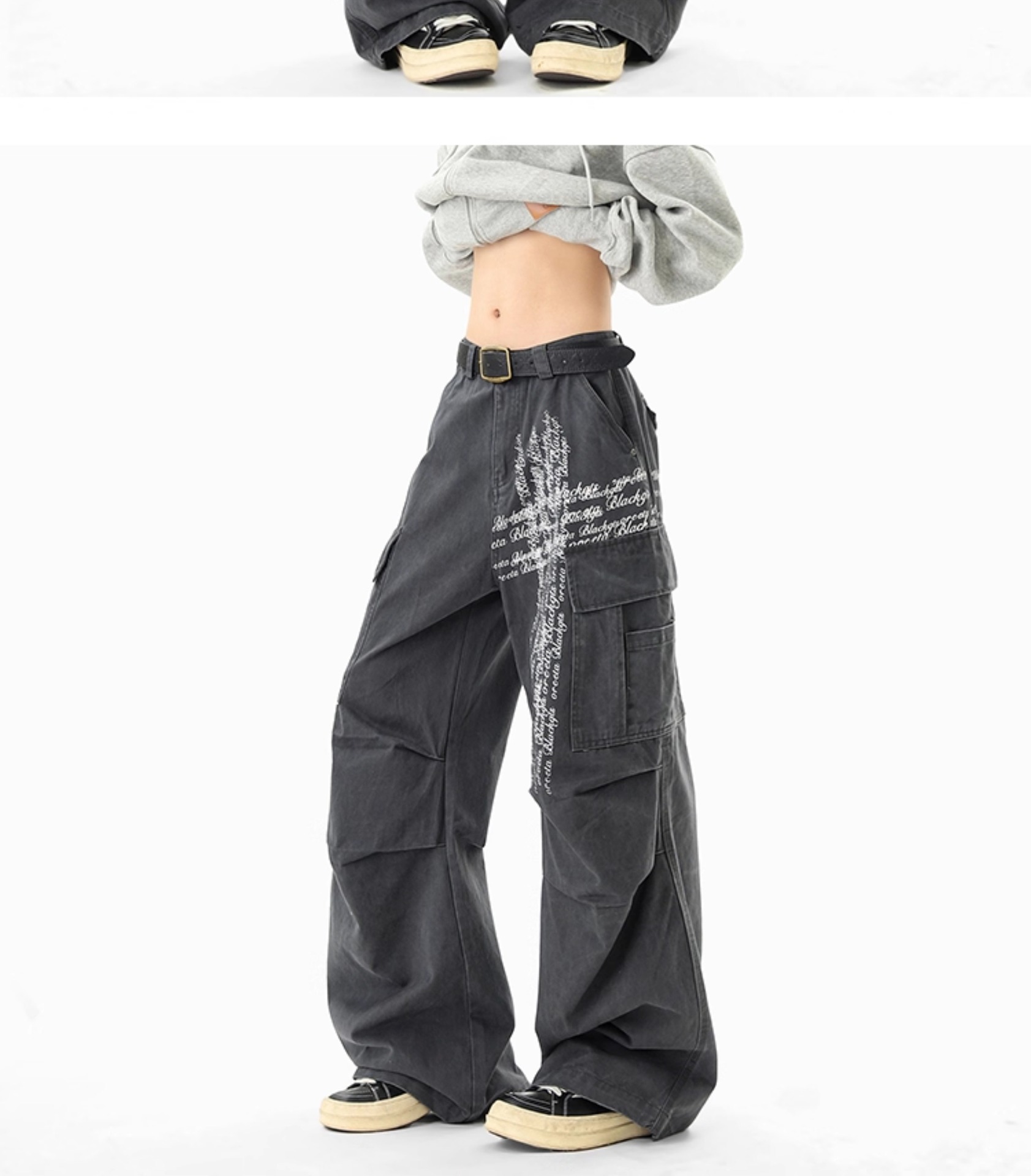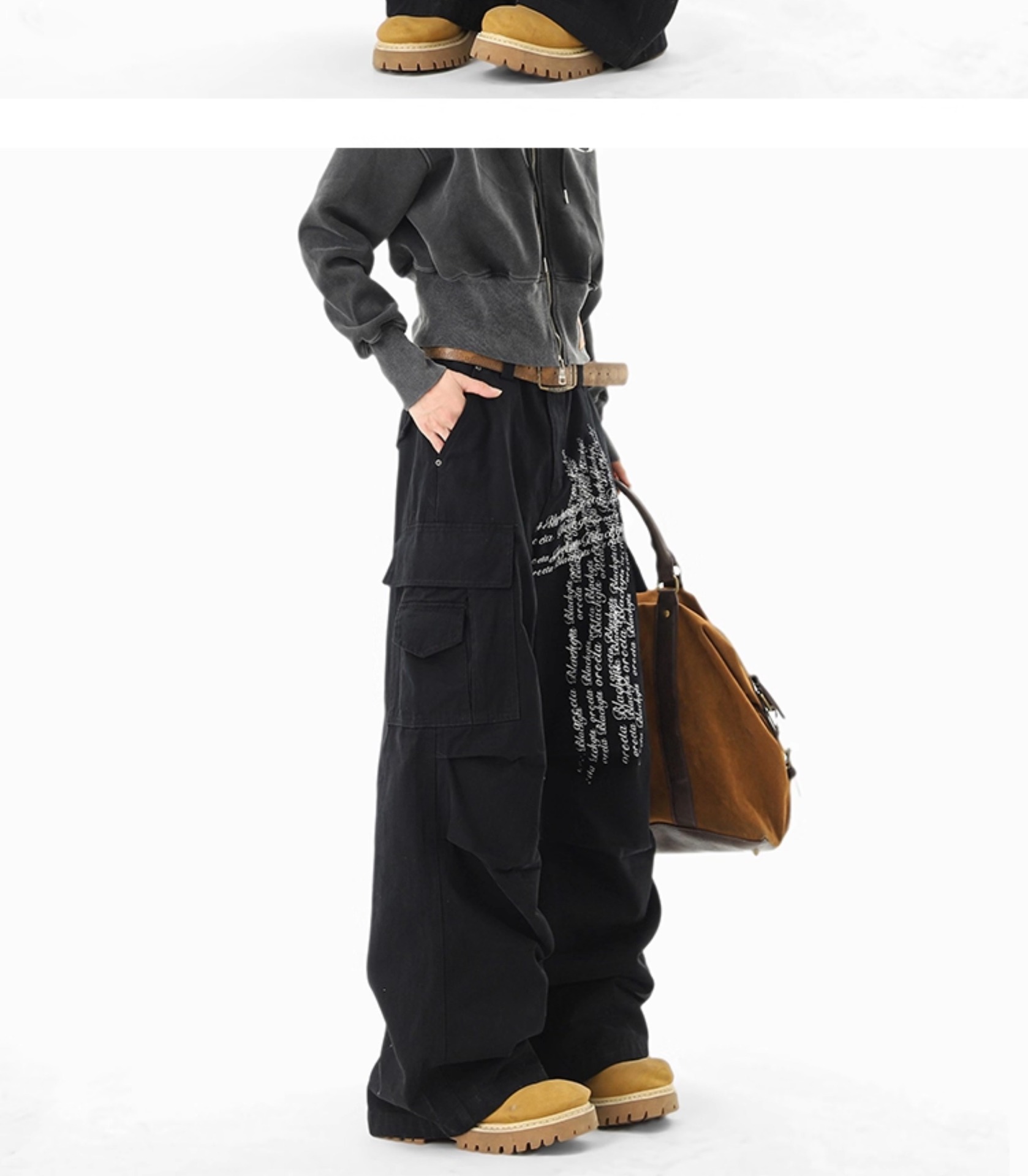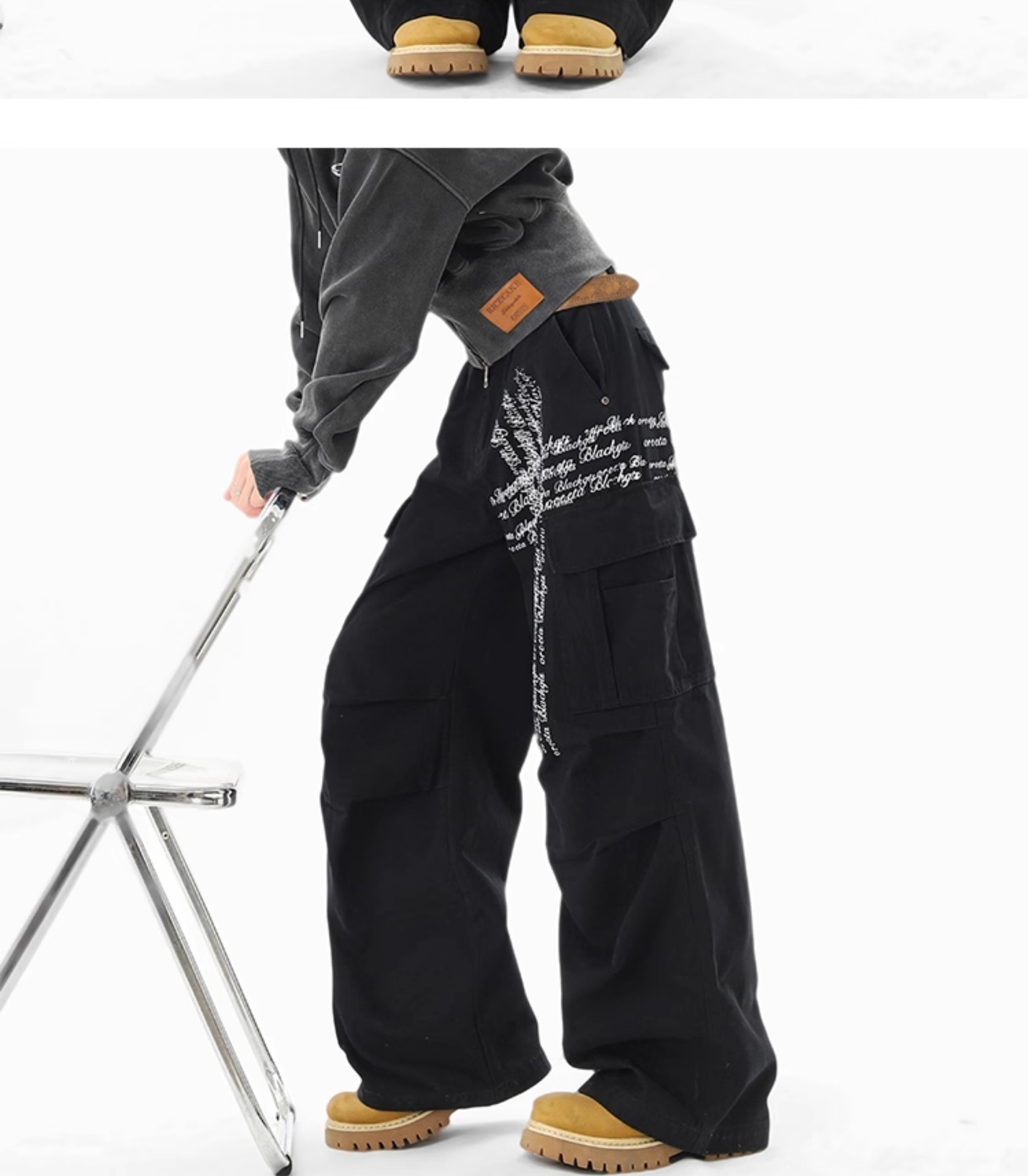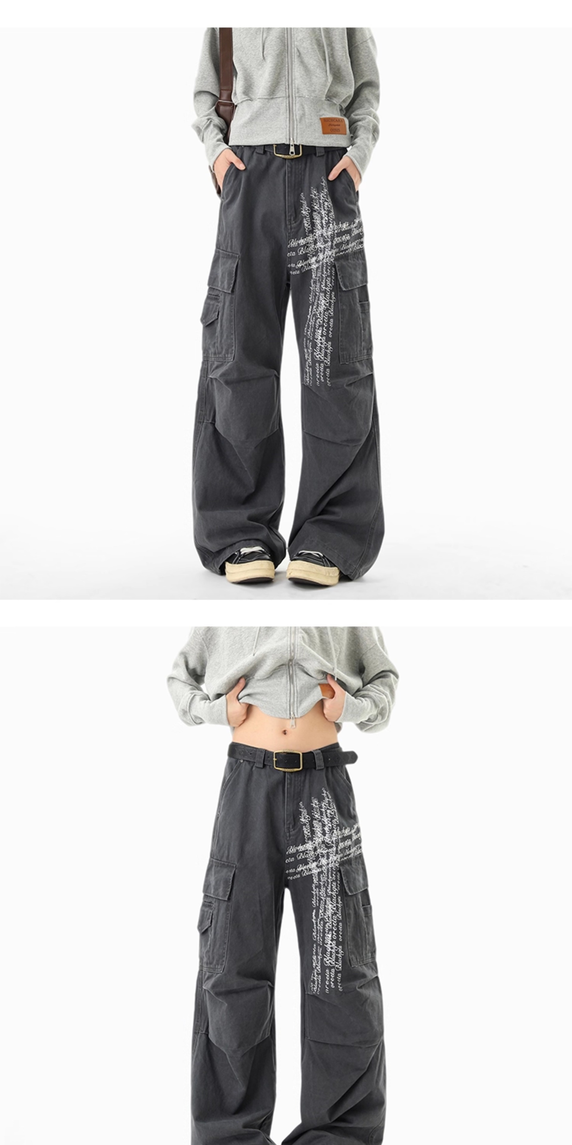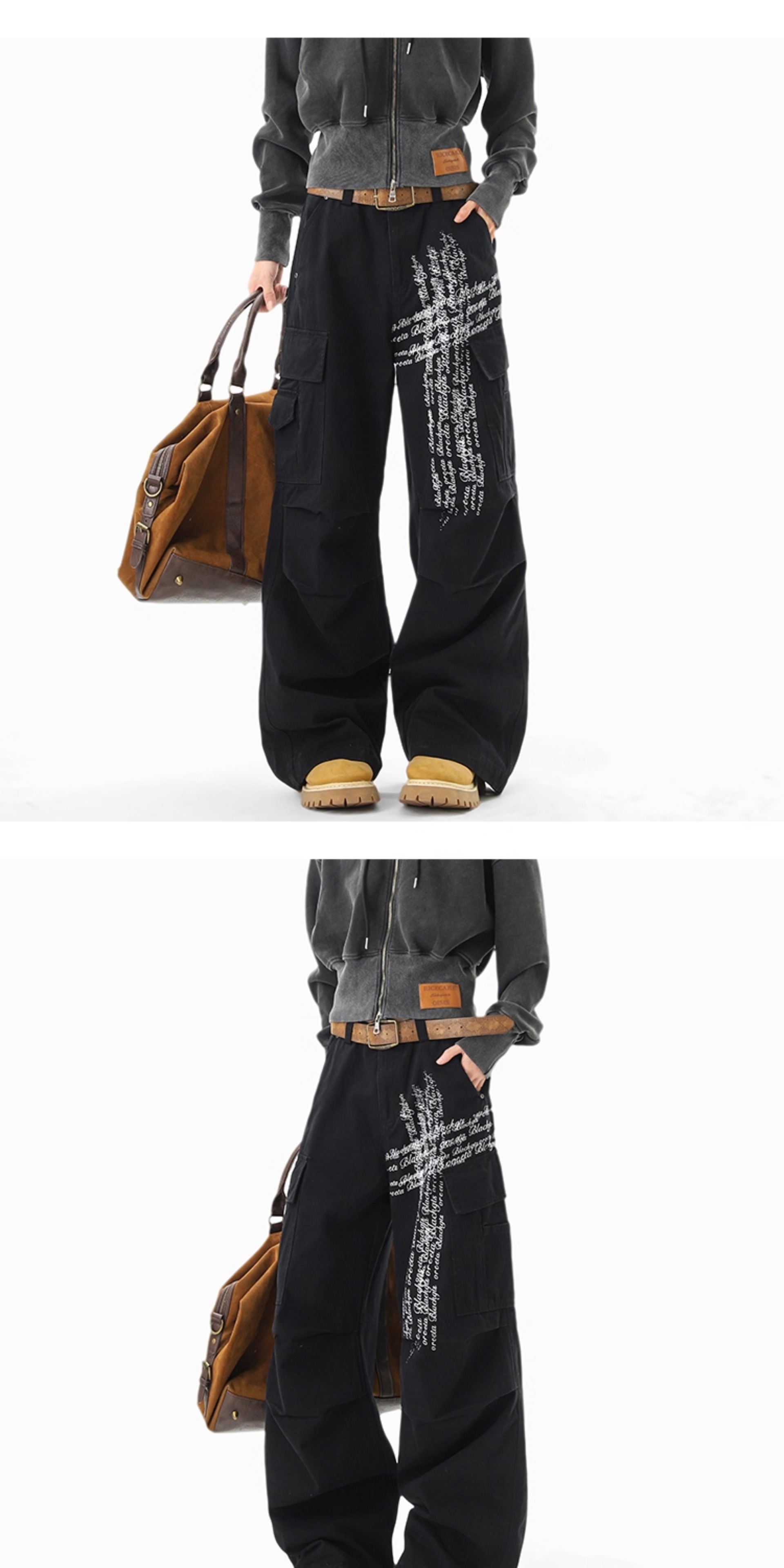 가을에 남성과 여성을 위한 아메리칸 스트리트 크로스 레터 프린트 오버올, 멋진 워싱 멀티 포켓 루즈 캐주얼 팬츠