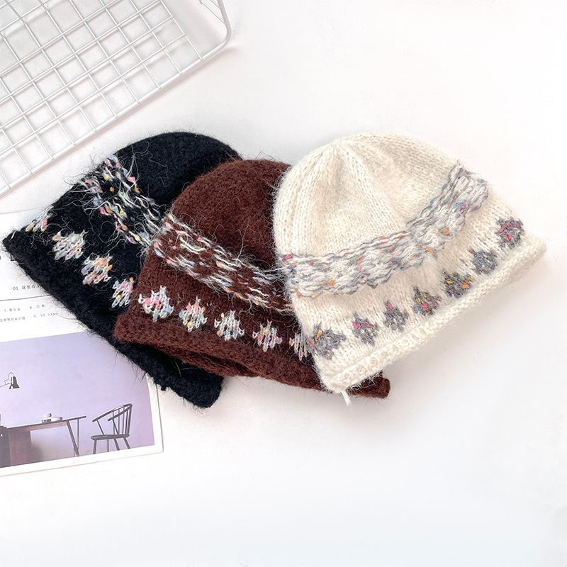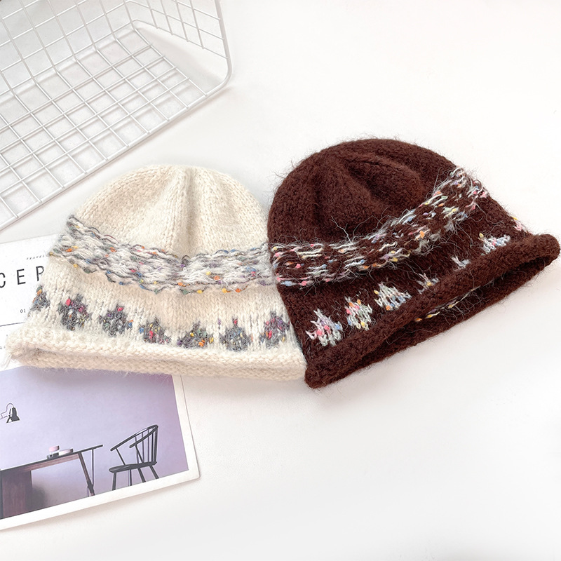 겨울철 여성을 위한 한국 복고풍 페어 아일 자카드 니트 모자, 따뜻한 귀 보호, 얼굴이 보이는 작은 모직 모자