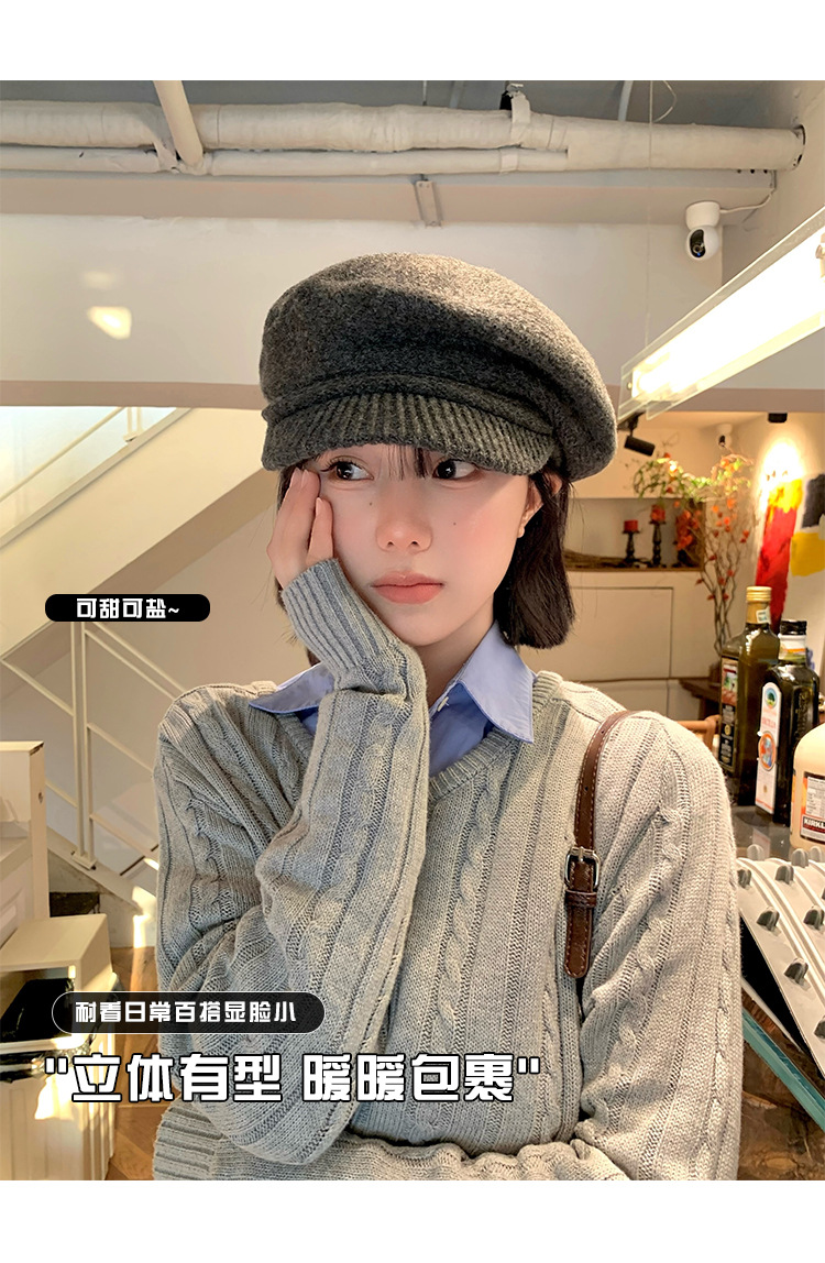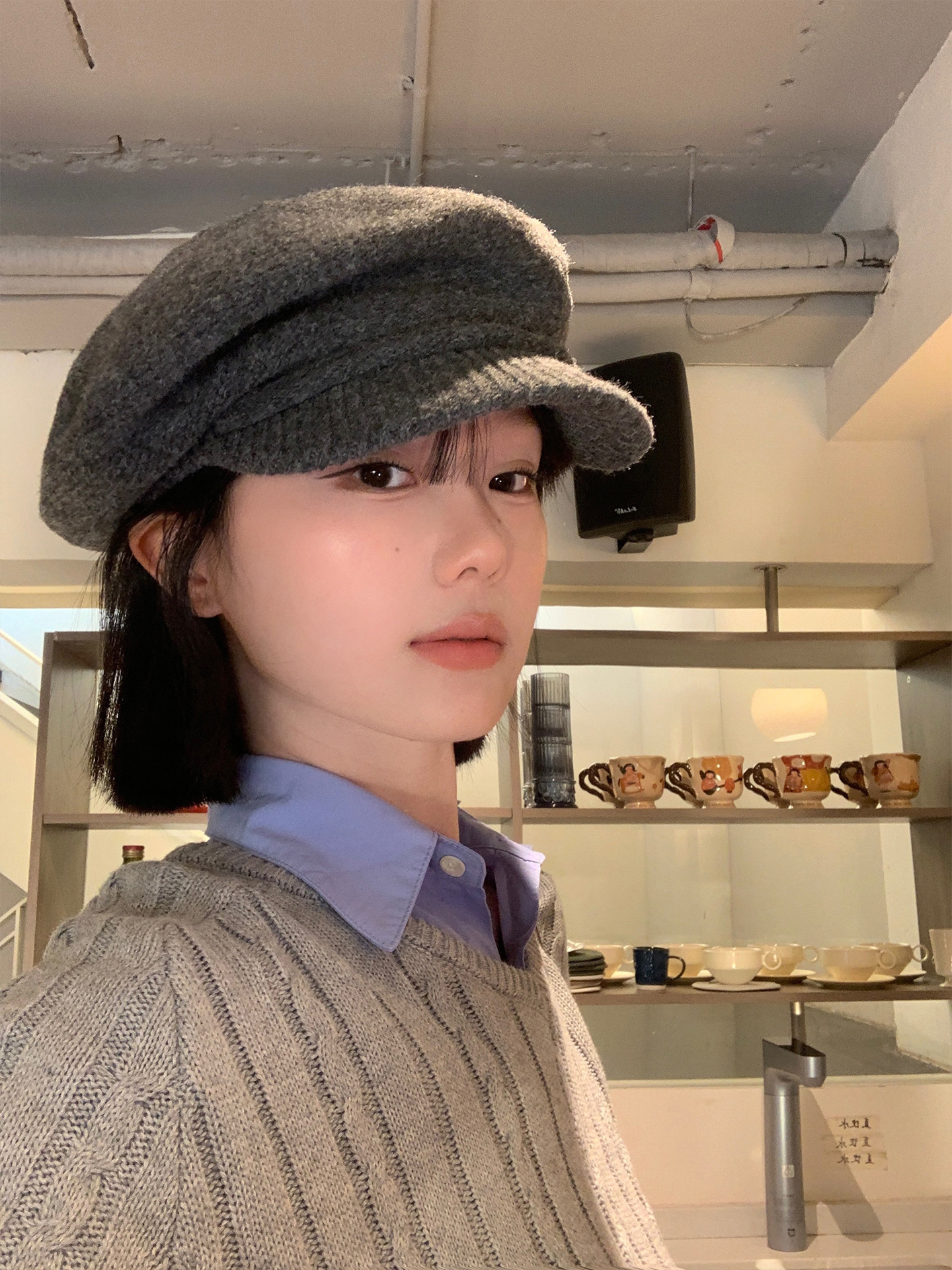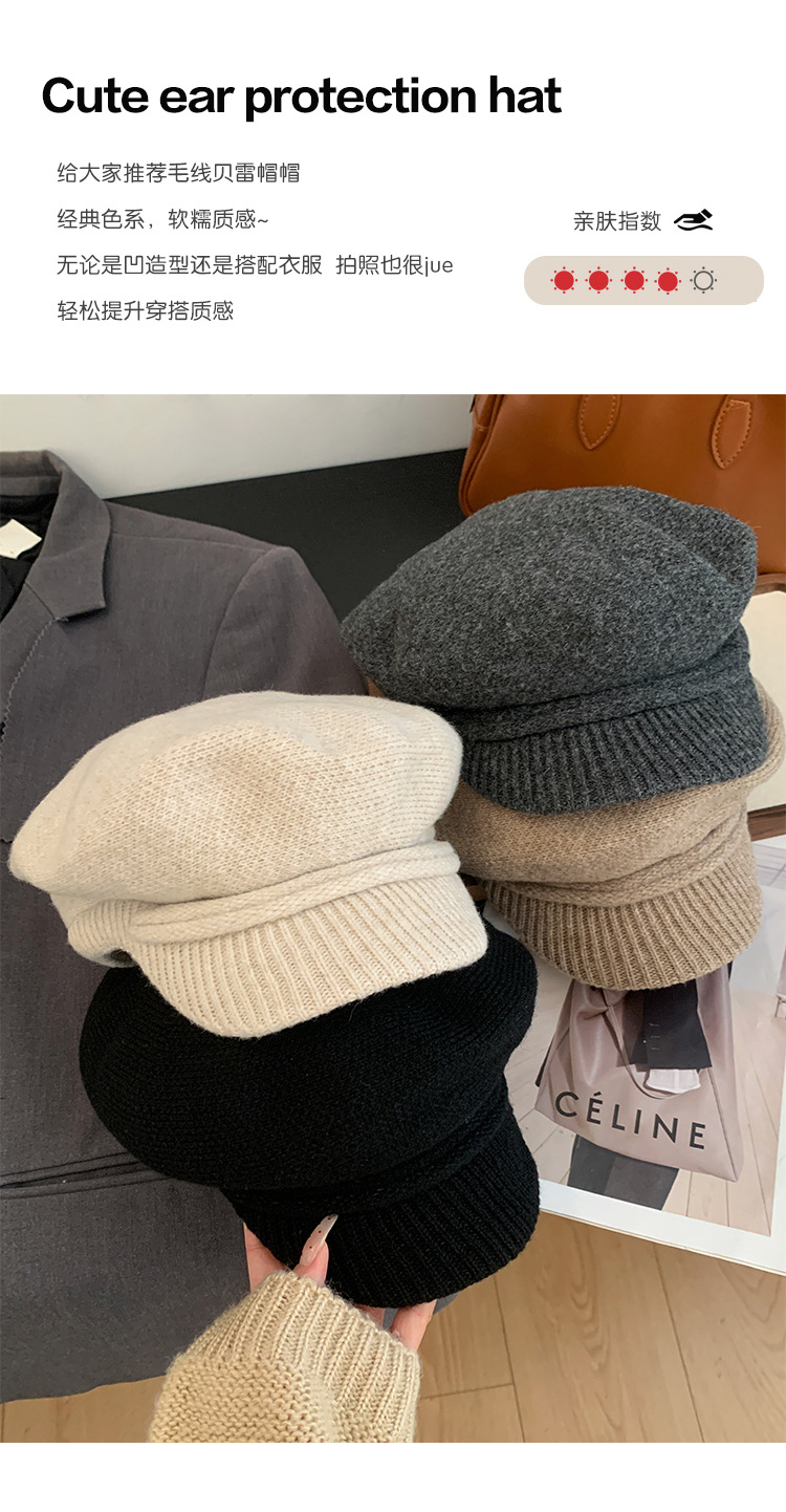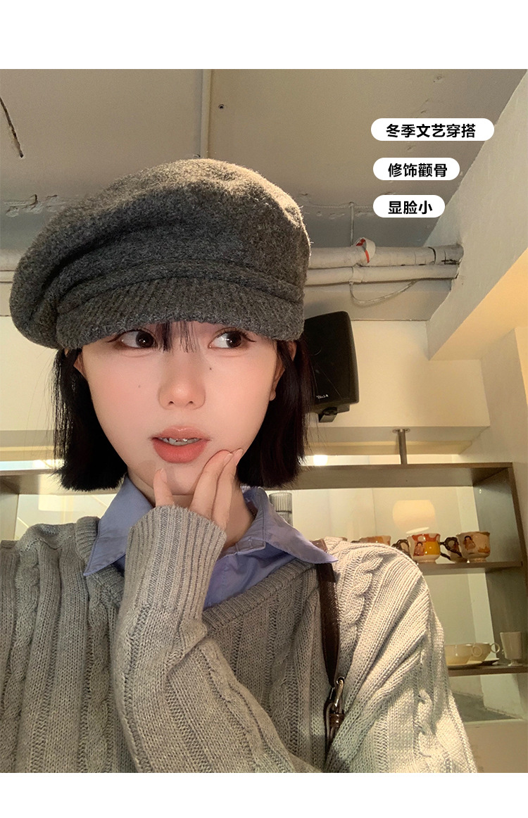 日系复古毛呢针织八角贝雷帽女大头围显脸小文艺百搭云朵画家帽子